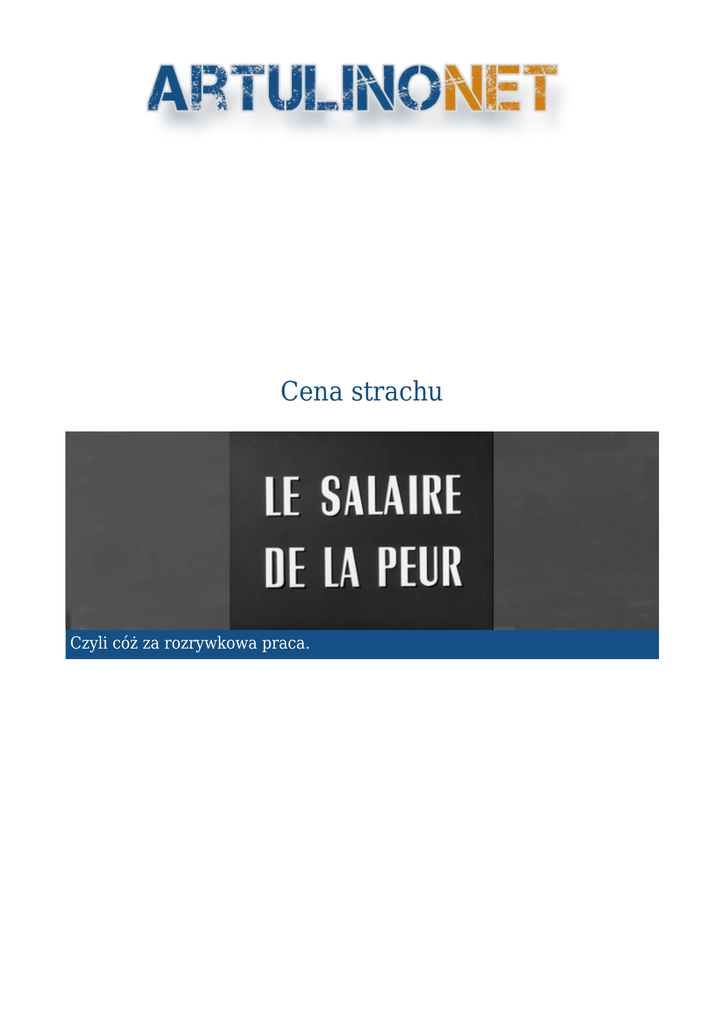 Cena strachu Czyli cóż za rozrywkowa praca. Cena strachu 2016-08-12 Czyli cóż za rozrywkowa praca. W małym urugwajskim miasteczku - Las Piedras przebywa grupa uchodźców z Europy. Przybyli tu z różnych powodów, ale przeważa ten, że uciekli od problemów, które sobie narobili w swych ojczyznach. Żyją w skrajnej nędzy. Miasteczko nie należy do najbogatszych, można by napisać, że gdyby ludzie kaczek nie zjedli, to rzucały by one mieszkańcom chleb. :-) Obcokrajowcy nie są darzeni sympatią miejscowych – zresztą i vice versa. Byli europejczycy są jak gdyby więźniami – jedyną drogą jaką można się dostać do miasteczka jest samolot, ale bilety na niego są bardzo, bardzo kosztowne – najtańszy który niewiele zmieni, to koszt 100 dolarów. Grupa emigrantów przysiaduje w lokalnym barze, tylko przesiaduje, nie ma pieniędzy na nic więcej – barman na pewno jest z tego powodu „uszczęśliwiony”. Stałej pracy nie mają, od czasu do czasu znajdą coś dorywczego, ledwo im starcza na jedzenie. Jednym z nich jest Mario (Yves Montand) wygląda na zawadiakę i obiboka. Próbuje poderwać pracującą, a raczej tyrającą tam Lindę (Véra Clouzot). Nie ma z tym większych problemów, on też wpadł jej w oko. Szkoda tylko, że tak niegodziwie ją traktuje. Do miasta przybywa kolejny uciekinier, rodak Mario - Jo. To podejrzany, równie spłukany jako reszta typek. Trafił tu wydając swe ostatnie pieniądze. Zanim miejscowi się zorientują w stanie jego stanie posiadania uda mu się skorzystać na ich niewiedzy. Jest elegancko ubrany, więc nie będzie to trudne. Nie wszyscy jednak klepią tu biedę, są tu amerykanie. Ich firma S.O.C. prowadzi wydobycie ropy. Jest bardzo bogata, ale traktuje ludzi, szczególnie miejscowych jak śmieci. Nikogo nie interesuje ich śmierć. Wypadki są częste i zbierają krwawe żniwo. Tak jest też i teraz. W odległym o 500 km szybie naftowym nr 16 wybuchł pożar. S.O.C. zmuszone jest go ugasić, a takie pożary gasi się wysadzając szyb w powietrze. Kompania planuje zrealizować to przy pomocy nitrogliceryny, problem jest tylko taki, że przy szybie nie ma wystarczającej jej ilości. Z Las Piedras trzeba przewieźć ją przez górskie bezdroża. Przypominam, że nitrogliceryna jest BARDZO wrażliwa na wstrząsy. Konwój ma składać się z dwóch ciężarówek, do ugaszenia szybu wystarczy ładunek z jednej z nich, ta druga jedzie na wypadek, gdyby pierwszej się nie udało. Kierować nimi będą „ochotnicy” - jak zginą firma się nie przejmie, w końcu to nie ich pracownicy. Zachętą dla kierowców ma być zapłata wynosząca niebagatelną kwotę 2000 dolarów. Chętnych nie trzeba www.artulino.net szukać ze świecą, raczej walą drzwiami i oknami. Po przeprowadzeniu „castingu” zostaje wybrana czwórka straceńców Bimba (Peter van Eyck), Luigi (Folco Lulli), Mario i Jo. W nocy wyruszają na trasę, będą jechać bardzo powoli, ale będą się też denerwować, bardzo denerwować. Pomimo że „Cena strachu” została zrealizowana w 1953 roku, nie zestarzała się. Film jest dość długi – 131 minut, z czego niemal połowa to wstęp pokazujący mieszkańców, uchodźców, ich życie i problemy. Pozwala to zrozumieć dlaczego bez wahania podjęli się tak niebezpiecznego zadania. Bohaterowie są bardzo wyraziście nakreśleni, mają nie raz na pieńku z prawem, musieli uciekać na obcą ziemię. Nie maję tu luksusów, a raczej wprost przeciwnie, nie raz przymierają z głodu. Zachowują mimo to humor i są pełni nadziei, że zły los się od nich odwróci. Marzą o powrocie do ojczyzny. Mamy też pokazaną bezwzględną amerykańską firmę, dla której liczy się tylko jak największe wydobycie – nie liczy się z losem swoich pracowników, szczególnie tych miejscowych. Co z tego, że poginęli w wypadkach? Zawsze się znajdzie ktoś na ich miejsce… „Cena strachu” doskonale pokazuje emocje jakie przeżywają kierowcy wiozący tak niebezpieczny ładunek. Planują już jak wydadzą pieniądze, co będą robili po powrocie na ojczystą ziemię, są pełni szczęścia i nadziei. Przeplata to się z wielkim zdenerwowaniem, wiedzą, że lada wstrząs i ich nie ma, a na tych bezdrożach o taki nie trudno. Aż chce się napisać, że tan konwój kształtuje charaktery. Pomimo dość mało ciekawego początku, film potrafi trzymać w napięciu, jak rzadko który film. Twórcy nie poszli tu na widowiskowość, skupili się na bohaterach, ich osobowości, charakterach i emocjach jakie przeżywają podczas swojej straceńczej misji. Tytuł polski: Cena strachu Tytuł oryginalny: Le salaire de la peur Reżyseria: Henri-Georges Clouzot Yves Montand jako Mario Charles Vanel jako Jo Peter van Eyck jaka Bimba Folco Lulli jako Luigi Véra Clouzot jako Linda Artur Wyszyński www.artulino.net