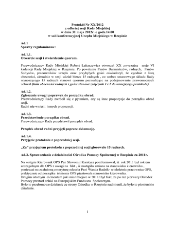 Protokół Nr XX/2012 z odbytej sesji Rady Miejskiej w dniu 31 maja 2012r. o godz.14.00 w sali konferencyjnej Urzędu Miejskiego w Rzepinie Ad.1 Sprawy regulaminowe: Ad.1.1. Otwarcie sesji i stwierdzenie quorum. Przewodniczący Rady Miejskiej Robert Łukaszewicz otworzył XX zwyczajną sesję VI kadencji Rady Miejskiej w Rzepinie. Po powitaniu Panów Burmistrzów, radnych, Panów Sołtysów, pracowników urzędu oraz przybyłych gości oświadczył, że zgodnie z listą obecności, aktualnie w sesji udział bierze 15 radnych , co wobec ustawowego składu Rady wynoszącego 15 radnych stanowi quorum pozwalające na podejmowanie prawomocnych uchwał (lista obecności radnych i gości stanowi załącznik 1 i 2 do niniejszego protokołu). Ad.1.2. Zgłoszenie uwag i poprawek do porządku obrad. Przewodniczący Rady zwrócił się z pytaniem, czy są inne propozycje do porządku obrad sesji. Radni nie wnieśli innych propozycji. Ad.1.3. Przedstawienie porządku obrad. Przewodniczący Rady przedstawił porządek obrad. Prządek obrad radni przyjęli poprzez aklamację. Ad.1.4. Przyjęcie protokołu z poprzedniej sesji. „Za” przyjęciem protokołu z poprzedniej sesji głosowało 15 radnych. Ad.2. Sprawozdanie z działalności Ośrodka Pomocy Społecznej w Rzepinie za 2011r. Na wstępie Kierownik OPS Pan Sławomir Karatysz poinformował, iż rok 2011 był rokiem szczególnym dla OPS z uwagi na fakt , iż nastąpiła zmiana na stanowisku kierownika , ponieważ na zasłużoną emeryturę odeszła Pani Wanda Radzik- wieloletnia pracownica OPS, praktycznie od początku istnienia OPS piastowała stanowisko kierownika. Drugim istotnym elementem jaki miał miejsce w 2011r.był fakt, że po raz pierwszy Ośrodek Pomocy przetarł szlaki na Europejskim Funduszu Społecznym. Było to przełomowe działanie ze strony Ośrodka w Rzepinie nadmienił, że było to pionierskie działanie. 1 Pan Kierownik ma nadzieję , że w następnych latach również będzie możliwość skorzystania ze środków Unii Europejskiej, ponieważ przyniosły one naprawdę wymierne efekty w postaci zadowolenia klientów OPS uczestniczących w spotkaniach z profesjonalistami, którzy prowadzą szkolenia w MDK w Rzepinie. Nadmienić również należy , iż pod koniec 2011r. rozpoczął swoją działalność Zespół Interdyscyplinarny ds. Przeciwdziałania Przemocy w Rodzinie . Zespół ten ma za zadanie pomagać osobom dotkniętym przemocą w rodzinie. W skład tego zespołu wchodzą : pracownicy socjalni , pedagodzy szkolni, policjant, przedstawiciel Caritas, przedstawiciel służby zdrowia i zespołu kuratorskiego. W 2011r. w OPS zatrudnionych było 13 osób z tego 5 pracowników socjalnych. Ośrodek Pomocy Społecznej w Rzepinie realizuje szereg różnych zadań zarówno własnych jak i zleconych. Następnie przedstawił charakterystykę OPS w Rzepinie. I. ZAGADNIENIA WSTĘPNE. Pomoc społeczna. Zadania w zakresie pomocy społecznej, rodzaje świadczeń, zasady i tryb ich udzielania oraz organizacje pomocy społecznej określa ustawa z 14 marca 2004 r. o pomocy społecznej oraz akty wykonawcze do w/w ustawy. Ośrodek prowadzi działania na podstawie przepisów prawa, a w szczególności: 1) ustawy z dnia 8 marca 1990 r. o samorządzie gminnym (Dz. U. z 2001 r., Nr 142, poz. 1591 z późn. zm.); 2) ustawy z dnia 27 sierpnia 2009 r. o finansach publicznych (Dz. U. z 2009 r., Nr 157, poz. 1240 z późn. zm.); 3) ustawy z dnia 12 marca 2004 roku o pomocy społecznej (Dz. U. z 2009 r., Nr 175, poz. 1362 z późn. zm.); 4) ustawy z dnia 29 lipca 2005 r. o przeciwdziałaniu przemocy w rodzinie (Dz. U z 2005 r., Nr 180, poz. 1493, z późn. zm.); 5) ustawy z dnia 29 grudnia 2005 r. o ustanowieniu programu wieloletniego „Pomoc państwa w zakresie dożywiania” (Dz. U. z 2005 r., Nr 267, poz. 2259 z późn. zm.); 6) ustawy z dnia 28 listopada 2003 r. o świadczeniach rodzinnych (Dz. U. z 2006 r. Nr 139, poz. 992 z późn. zm.); 7) ustawy z dnia 7 września 2007 r. o pomocy osobom uprawnionym do alimentów (Dz. U. z 2009 r., Nr 1, poz. 7 z późn. zm.); 8) ustawy z dnia 21 czerwca 2001 r. o dodatkach mieszkaniowych (Dz. U. z 2001 r. Nr 71, poz. 734 z późn. zm.); 9) ustawy z dnia 24 kwietnia 2003 roku o działalności pożytku publicznego i o wolontariacie (Dz. U. z 2010 r., Nr 234, poz. 1536 z późn. zm.); 10) ustawy z dnia 19 sierpnia 1994 r. o ochronie zdrowia psychicznego (Dz. U. z 2011 roku, Nr 231, poz. 1375); 11) ustawy z dnia 26 października 1982 r. o wychowaniu w trzeźwości i przeciwdziałaniu alkoholizmowi (Dz. U. z 2007 r., Nr 70, poz. 473 z późn. zm.); 12) ustawy z dnia 13 czerwca 2003 r. o zatrudnieniu socjalnym (Dz. U. z 2011 r., Nr 43, poz. 225, Nr 205, poz. 1211); 13) ustawy z dnia 29 lipca 2005. o przeciwdziałaniu narkomanii (Dz. U. z 2005 r., Nr 179, poz. 1485 z późn. zm.); 2 14) ustawy z dnia 27 sierpnia 2004 r. o świadczeniach opieki zdrowotnej finansowanych ze środków publicznych (Dz. U. z 2008 r., Nr 164, poz. 1027 z późn. zm.); 15) ustawy z dnia 20 kwietnia 2004 r. o promocji zatrudnienia i instytucjach rynku pracy (Dz. U. z 2008 r., Nr 69, poz. 415 z późn. zm.); 16) ustawy z dnia 29 stycznia 2004 r. – Prawo zamówień publicznych (Dz. U. z 2010 r., Nr 113, poz. 759 z późn. zm.); 17) ustawy z dnia 9 czerwca 2011 r. o wspieraniu rodziny i systemie pieczy zastępczej (Dz. U. z 2011 r., Nr 149, poz. 887, Nr 288, poz. 1690). Pomoc społeczną organizują organy administracji rządowej i samorządowej, współpracując w tym zakresie na zasadach partnerstwa z organizacjami społecznymi i pozarządowymi, Kościołem Katolickim, innymi kościołami, związkami wyznaniowymi oraz osobami fizycznymi i prawnymi. Pomoc społeczna wspiera osoby i rodziny w wysiłkach zmierzających do zaspokojenia niezbędnych potrzeb i umożliwienie im życia w warunkach odpowiadających godności człowieka. Pomocy społecznej udziela się osobom i rodzinom w szczególności z powodu: • ubóstwa, • sieroctwa, • b