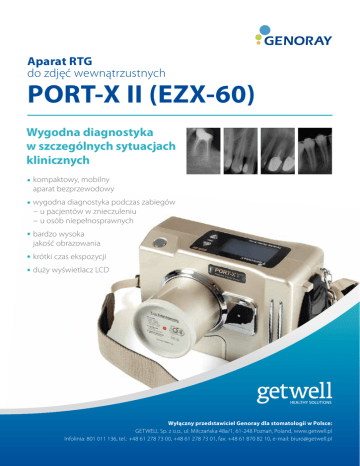 Aparat RTG do zdjęć wewnątrzustnych PORT-X II (EZX-60) Wygodna diagnostyka w szczególnych sytuacjach klinicznych kompaktowy, mobilny aparat bezprzewodowy wygodna diagnostyka podczas zabiegów − u pacjentów w znieczuleniu − u osób niepełnosprawnych bardzo wysoka jakość obrazowania krótki czas ekspozycji duży wyświetlacz LCD Wyłączny przedstawiciel Genoray dla stomatologii w Polsce: GETWELL Sp. z o.o., ul. Milczańska 48a/1, 61-248 Poznań, Poland, www.getwell.pl Infolinia: 801 011 136, tel.: +48 61 278 73 00, +48 61 278 73 01, fax: +48 61 870 82 10, e-mail: [email protected] Nowoczesna technologia RTG PORT-X II (EZX-60) PORT-X II to kompaktowy aparat bezprzewodowy o bardzo wysokiej jakości obrazowania. Aparat współpracuje z radiografią cyfrową, kliszami lub płytkami fosforowymi. Zdjęcia ostre, o dużym stopniu kontrastu uzyskujemy dzięki generatorowi wysokiej częstotliwości i lampie TOSHIBA. Bardzo krótkie czasy ekspozycji i niskie natężenie prądu minimalizują dawkę promieniowania. Wszystkie parametry widoczne na dużym czytelnym wyświetlaczu LCD. Parametry ekspozycji ustawiane domyślnie do wieku pacjenta oraz rodzaju zęba. Dane techniczne Generator promieniowania Parametry lampy Ekspozycja Waga W zestawie przewodowy wyzwalacz ekspozycji i ładowarka. Istnieje możliwość wykonywania zdjęć na statywie (opcja). Producent Typ Toshiba Wysokiej częstotliwości Natężenie prądu 2 mA Napięcie 60 kV Ognisko 0,8 mm 20° Kąt anody Filtracja całkowita 1,8 mmAl Zakres czasu ekspozycji 0,01-2,0 s Jednostka główna 2,35 kg Akcesoria 0,6 kg 11 cm Długość tubusa Wymiary W ofercie Getwell: • pełna oferta stomatologicznego sprzętu RTG firmy GENORAY (aparaty punktowe, tomografy, pantomografy z cefalostatem, systemy 3 w 1) • systemy radiografii cyfrowej TOSHIBA Jednostka główna Ładowarka 197 x 147 x 145 mm 100 x 65 x 35 mm • akcesoria: klisze samowywołujące, fartuchy ochronne, pozycjonery do radiografii
