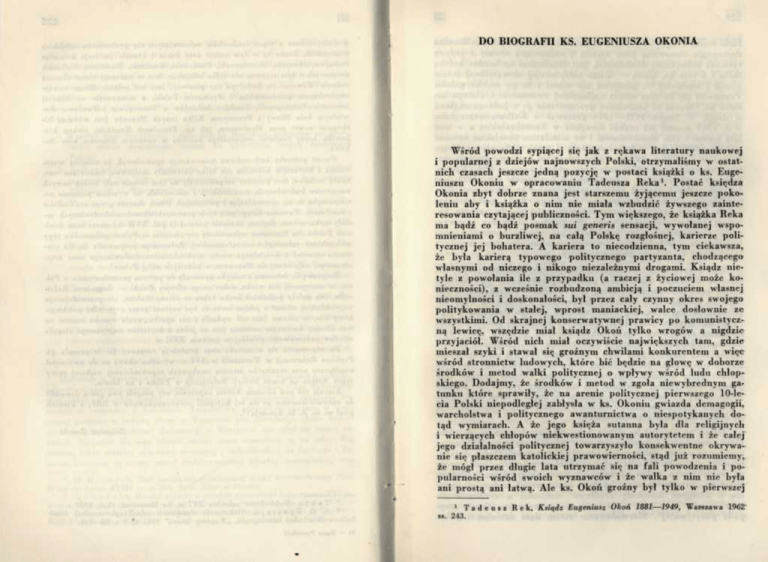 DO BIOGRAFII KS. EUGENIUSZA OKONIA Wśród powodzi sypiącej się jak z rękawa literatury naukowej i popularnej z dziejów najnowszych Polski, otrzymaliśmy w ostat nich czasach jeszcze jedną pozycję w postaci książki o ks. Euge niuszu Okoniu w opracowaniu Tadeusza R eka1. Postać księdza Okonia zbyt dobrze znana jest starszemu żyjącemu jeszcze poko leniu aby i książka o nim nie miała wzbudzić żywszego zainte resowania czytającej publiczności. Tym większego, że książka Reka ma bądź co bądź posmak sui generis sensacji, wywołanej wspo mnieniami o burzliwej, na całą Polskę rozgłośnej, karierze poli tycznej jej bohatera. A kariera to niecodzienna, tym ciekawsza, że była karierą typowego politycznego partyzanta, chodzącego własnymi od niczego i nikogo niezależnymi drogami. Ksiądz nietyle z powołania ile z przypadku (a raczej z życiowej może ko nieczności), z wcześnie rozbudzoną ambicją i poczuciem własnej nieomylności i doskonałości, był przez cały czynny okres swojego politykowania w stałej, wprost maniackiej, walce dosłownie ze wszystkimi. Od skrajnej konserwatywnej prawicy po komunistycz ną lewicę, wszędzie miał ksiądz Okoń tylko wrogów a nigdzie przyjaciół. Wśród nich miał oczywiście największych tam, gdzie mieszał szyki i stawał się groźnym chwilami konkurentem a więc wśród stronnictw ludowych, które bić będzie na głowę w doborze środków i metod walki politycznej o wpływy wśród ludu chłop skiego. Dodajmy, że środków i metod w zgoła niewybrednym ga^ tunku które sprawiły, że na arenie politycznej pierwszego 10-lecia Polski niepodległej zabłysła w ks. Okoniu gwiazda demagogii, warcholstwa i politycznego awanturnictwa o niespotykanych do tąd wymiarach. A że jego księża sutanna była dla religijnych i wierzących chłopów niekwestionowanym autorytetem i że całej jego działalności politycznej towarzyszyło konsekwentne okrywa nie się płaszczem katolickiej prawowierności, stąd już rozumiemy, że mógł przez długie lata utrzymać się na fali powodzenia i po pularności wśród swoich wyznawców i że walka z nim nie była ani prostą ani łatwą. Ale ks. Okoń groźny był tylko w pierwszej 1 Tad eusz ss. 243. Rek, K sią d z E u g en iu sz O k o ń 1881— 1949, W arsza w a 1962 2 [ ] fazie walki o wpływy i dusze wyznawców i zwolenmkow. ^ szelka demagogia stosowana jako system i stanowiąca trwały i jedyny element politycznej działalności, jest działaniem na bardzo krotką S i o tym ks. Okoń - mimo całej swojej niewątpliwej inteli gencji i zdolności — pamiętać nie umiał i to go szybko gubiło. Poznawali się na nim nawet najbardziej otumanieni i dlatego ka riera ks. Okonia to ustawiczne przeganianie go z jednego regionu w drugi. W latach 1911— 1914 grasował w Kolbuszowszczyznie, w r. 1919 musiał już szukać szczęścia w Tarnobrzeskim a w trzy lata potem i tam zbankrutował i za mandatem poselskim uganiać mu się przyszło już w Lubelszczyźnie. I tutaj także me na długo, Z y W r 1926 wyrzucono 5o z własnego przezeń z o 'S ,m z » w » ; nego stronnictwa i ostatecznie przy walnej pomocy PbL, Wy lenia zlikwidowano go z kretesem. W wyborach z r. 119-8 j już bez żadnych szans i gwiazda pomyślności ks. Okonia, iście patologiczna ' narośl ówczesnego polskiego życia politycznego, gaśnie ostatecznie. Poza utratą popularności gubiła naszego bo hatera jeszcze groźniejsza rzecz dla każdego działacza a mląn«wicie ośmieszenie, które przyniosły mu przede wszystkim jego wystąpienia w sejmie, niemal z reguły mające charakter wesołych interludiów ku uciesze posłów i galerii. Ale wszystko to nie wyczerpuje jeszcze charakterystyki ks. Okonia. W każdej działalności publicystycznej ważny jest rowmez zespól cech osobistych działacza, a u księdza w szczególności. ->ie idzie tu oczywiście o chodzącą doskonałosc a u księdza wzor bogobojności, ale o to, aby życie osobiste takiego działacza i jego codzienne postępowanie było zgodne z najbardziej podstawowymi zasadami moralnymi, chyba także ważnymi w życiu zbiorowym każdego zdrowego organizmu społecznego Ks. Okoniowi imponderabilia te niestety były obce i bliżej nad tym się me rozwodząc trzeba stwierdzić, Że publiczną tajemnicą owych czasów było brudne życie osobiste bohatera omawianej obecnie książki. Kto pragnie szczegółów, znajdzie ich niezgorszy rejestr w książce Reka który — przyznajemy lojalnie — mówi o tym dosc dużo, chociaż z widocznym zażenowaniem i nieukrywaną zgoła tendencją do bagatelizowania i rozgrzeszania. Takim to oto był ks. Okoń jako działacz i człowiek a w tej chwili przedmiot i bohater procesu rehabilitacyjnego jaki wyto czył autor w imię obiektywnej prawdy historycznej. Ocena dotych czasowa osoby ks. Okonia była — zdaniem autora — jednostron na, subiektywna, pełna uprzedzeń a zatem krzywdząca i dlatego autor po „przeprowadzeniu bardziej gruntownych badan i w opar ciu o dostępne materiały źródłowe dochodzi w rezultacie < o przekonania, że w jego oświetleniu ocena osoby ks. Okonia „w y pada pozytywniej” . Sformułowanie zatem dość ostrożne i pełne [3] zrozumiałej rezerwy, tym słuszniejsze, że zadanie jakiego podją się autor, to była naprawdę gra nie warta świeczki.^ I dlatego to nie będziemy się dłużej zastanawiać nad niemlalym całkowicie zabiegiem rehabilitacyjnym podjętym przez autora. Dosłownie ani w jednym wypadku autor nie zdołał udowodnić, ze zarzucany ks. Okoniowi z rzadką w Polsce jednomyślnością re jestr jego „błędów i wypaczeń” nie był prawdziwy. Zastosowana zaś przezeń metoda bagatelizowania, tuszowania a niekiedy na wet — z powołaniem się o dziwo na etykę świecką — rozgrzesza nia jest może dobra w mowie obrończej przed sądem, ale jej walor naukowego, objektywnego sądu (a o to przecież autorowi chodzi) jest żaden. A jeśli z kolei tak przez autora re