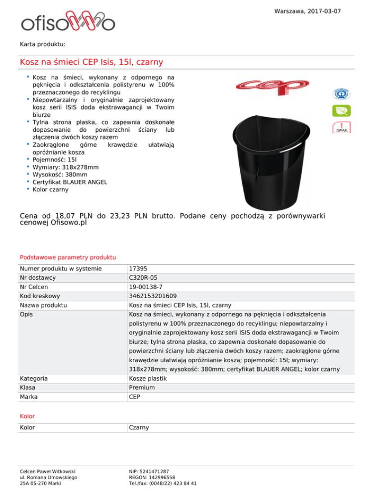 Warszawa, 2017-03-07 Karta produktu: Kosz na śmieci CEP Isis, 15l, czarny Kosz na śmieci, wykonany z odpornego na pęknięcia i odkształcenia polistyrenu w 100% przeznaczonego do recyklingu Niepowtarzalny i oryginalnie zaprojektowany kosz serii ISIS doda ekstrawagancji w Twoim biurze Tylna strona płaska, co zapewnia doskonałe dopasowanie do powierzchni ściany lub złączenia dwóch koszy razem Zaokrąglone górne krawędzie ułatwiają opróżnianie kosza Pojemność: 15l Wymiary: 318x278mm Wysokość: 380mm Certyfikat BLAUER ANGEL Kolor czarny Cena od 18,07 PLN do 23,23 PLN brutto. Podane ceny pochodzą z porównywarki cenowej Ofisowo.pl Podstawowe parametry produktu Numer produktu w systemie 17395 Nr dostawcy C320R-05 Nr Celcen 19-00138-7 Kod kreskowy 3462153201609 Nazwa produktu Kosz na śmieci CEP Isis, 15l, czarny Opis Kosz na śmieci, wykonany z odpornego na pęknięcia i odkształcenia polistyrenu w 100% przeznaczonego do recyklingu; niepowtarzalny i oryginalnie zaprojektowany kosz serii ISIS doda ekstrawagancji w Twoim biurze; tylna strona płaska, co zapewnia doskonałe dopasowanie do powierzchni ściany lub złączenia dwóch koszy razem; zaokrąglone górne krawędzie ułatwiają opróżnianie kosza; pojemność: 15l; wymiary: 318x278mm; wysokość: 380mm; certyfikat BLAUER ANGEL; kolor czarny Kategoria Kosze plastik Klasa Premium Marka CEP Kolor Kolor Czarny Celcen Paweł Witkowski ul. Romana Dmowskiego 25A 05-270 Marki NIP: 5241471287 REGON: 142996558 Tel./fax: (0048/22) 423 84 41 Warszawa, 2017-03-07 Karta katalogowa produktu cd. Kosz na śmieci CEP Isis, 15l, czarny Cecha Materiał Polistyren Produkt Kosz Ekologiczność 100% Rodzaj Pełny Typ Pełny W ofercie od 2013-01 Wymiary Rozmiar 15l Szerokość (mm) 318 Wymiary (mm) 318x278x380 Wysokość (mm) 380 Certyfikaty Certyfikaty, normy, patenty BLAUER ANGEL Hit Standard Ilość lat gwarancji 1 Nowy produkt w ofercie Standard Wspólny słownik zamówień CPV 39224340-3 Serdecznie zapraszamy do współpracy zespół. Ofisowo.pl Celcen Paweł Witkowski ul. Romana Dmowskiego 25A 05-270 Marki NIP: 5241471287 REGON: 142996558 Tel./fax: (0048/22) 423 84 41