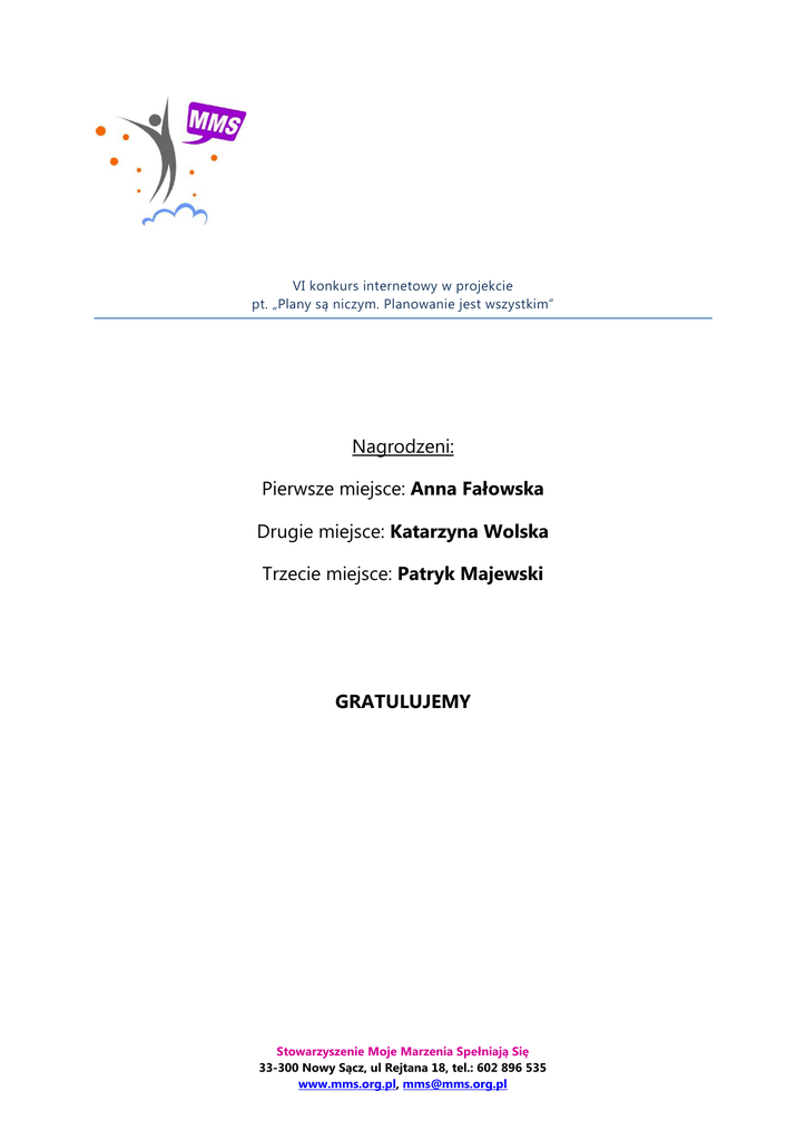 VI konkurs internetowy w projekcie pt. „Plany są niczym. Planowanie jest wszystkim” Nagrodzeni: Pierwsze miejsce: Anna Fałowska Drugie miejsce: Katarzyna Wolska Trzecie miejsce: Patryk Majewski GRATULUJEMY Stowarzyszenie Moje Marzenia Spełniają Się 33-300 Nowy Sącz, ul Rejtana 18, tel.: 602 896 535 www.mms.org.pl, [email protected]