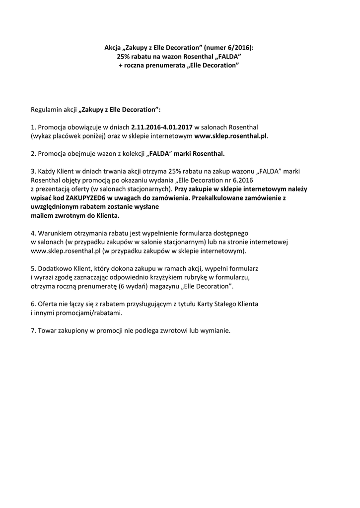 Akcja „Zakupy z Elle Decoration” (numer 6/2016): 25% rabatu na wazon Rosenthal „FALDA” + roczna prenumerata „Elle Decoration” Regulamin akcji „Zakupy z Elle Decoration”: 1. Promocja obowiązuje w dniach 2.11.2016-4.01.2017 w salonach Rosenthal (wykaz placówek poniżej) oraz w sklepie internetowym www.sklep.rosenthal.pl. 2. Promocja obejmuje wazon z kolekcji „FALDA” marki Rosenthal. 3. Każdy Klient w dniach trwania akcji otrzyma 25% rabatu na zakup wazonu „FALDA” marki Rosenthal objęty promocją po okazaniu wydania „Elle Decoration nr 6.2016 z prezentacją oferty (w salonach stacjonarnych). Przy zakupie w sklepie internetowym należy wpisać kod ZAKUPYZED6 w uwagach do zamówienia. Przekalkulowane zamówienie z uwzględnionym rabatem zostanie wysłane mailem zwrotnym do Klienta. 4. Warunkiem otrzymania rabatu jest wypełnienie formularza dostępnego w salonach (w przypadku zakupów w salonie stacjonarnym) lub na stronie internetowej www.sklep.rosenthal.pl (w przypadku zakupów w sklepie internetowym). 5. Dodatkowo Klient, który dokona zakupu w ramach akcji, wypełni formularz i wyrazi zgodę zaznaczając odpowiednio krzyżykiem rubrykę w formularzu, otrzyma roczną prenumeratę (6 wydań) magazynu „Elle Decoration”. 6. Oferta nie łączy się z rabatem przysługującym z tytułu Karty Stałego Klienta i innymi promocjami/rabatami. 7. Towar zakupiony w promocji nie podlega zwrotowi lub wymianie. Adresy salonów: Katowice, CH Altus, Uniwersytecka 13, tel. 32 603 01 71, [email protected] Kraków, Św. Marka 15a, tel. 12 422 28 32, [email protected] Poznań, Paderewskiego 8, tel. 61 851 31 03, [email protected] Poznań, CH. Kupiec Poznański, Pl. Wiosny Ludów 2, tel.61 8509167,[email protected] Warszawa, CH Blue City, Al. Jerozolimskie 179, tel. 22 311 74 37, [email protected] Warszawa, CH Promenada, Ostrobramska 75c, tel. 22 611 38 03, [email protected] Warszawa, Rosenthal Studio, Krucza 17, tel. 668 134 410, [email protected] Białystok, CH Alfa, Świętojańska 15, tel. 85 741 11 60, [email protected] Gdańsk, CH Galeria Bałtycka, Al. Grunwaldzka 141, tel. 510 156 088, [email protected] Gdynia, CH Riviera, Kazimierza Górskiego 2, tel. 500-692-756, [email protected] Lublin, Krakowskie Przedmieście 58, tel. 81 525 29 73, [email protected] Łódź, Adama Próchnika 1, tel. 666 038 617, [email protected] Rybnik, Rynek 11, tel. 32 422 36 77, [email protected] Wrocław, pl. T. Kościuszki 2, tel. 71 343 36 16, [email protected] Rzeszów, 3 Maja 1, tel. 17 859 30 12, [email protected] Zielona Góra, Stary Rynek 24/1, tel. 68 320 26 35, [email protected] Kielce, Sienkiewicza 4c, tel. 662 184 335, [email protected] Bydgoszcz, Długa 26, tel. 52 345 41 34 Szczecin, Ks. Bogusława 14/2A, tel. 91 434 16 80 Szczecin, CH Kaskada, Al. Niepodległości 36, tel. 91 810 22 09 Toruń, CH PDT Dom Towarowy, Rynek Staromiejski 36/38, tel. 56 652 22 00 Opole, Rynek 15c/1, tel. 77 43 10 264 Kalisz, Staszica 23, tel. 62 764 64 88 Olsztyn, Ellaart, Warszawska 2, tel. 89 527 53 44 Gorzów Wlkp., Spichrzowa 6, tel. 95 720 00 18 Gliwice, Dworcowa 40, tel. 32 231 48 31 Wrocław, Mensa Home, CH Magnolia Park, Legnicka 58, tel. 883 680 003 Poznań, Mensa Home, Stary Browar, ul. Półwiejska 42 , tel.883 680 083 Bydgoszcz, Mensa Home, Galeria Zielone Arkady, Al. Wojska Polskiego 1, tel. 883 680 007 Kraków, Mensa Home, Galeria Krakowska, ul. Pawia 5, tel. 883 680 011 Poznań, 2016-11-02