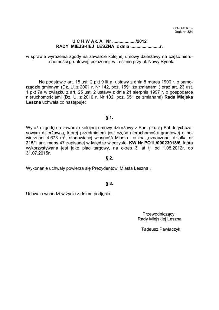 - PROJEKT – Druk nr 324 U C H W A Ł A Nr .................../2012 RADY MIEJSKIEJ LESZNA z dnia ........................r. w sprawie wyrażenia zgody na zawarcie kolejnej umowy dzierżawy na część nieruchomości gruntowej, położonej w Lesznie przy ul. Nowy Rynek. Na podstawie art. 18 ust. 2 pkt 9 lit a ustawy z dnia 8 marca 1990 r. o samorządzie gminnym (Dz. U. z 2001 r. Nr 142, poz. 1591 ze zmianami ) oraz art. 23 ust. 1 pkt 7a w związku z art. 25 ust. 2 ustawy z dnia 21 sierpnia 1997 r. o gospodarce nieruchomościami (Dz. U. z 2010 r. Nr 102, poz. 651 ze zmianami) Rada Miejska Leszna uchwala co następuje: § 1. Wyraża zgodę na zawarcie kolejnej umowy dzierżawy z Panią Łucją Pol dotychczasowym dzierżawcą, której przedmiotem jest część nieruchomości gruntowej o powierzchni 4.673 m2, stanowiącej własność Miasta Leszna ,oznaczonej działką nr 215/1 ark. mapy 47 zapisanej w księdze wieczystej KW Nr PO1L/00023018/6, która wykorzystywana jest jako plac targowy, na okres 3 lat tj. od 1.08.2012r. do 31.07.2015r. § 2. Wykonanie uchwały powierza się Prezydentowi Miasta Leszna . § 3. Uchwała wchodzi w życie z dniem podjęcia . Przewodniczący Rady Miejskiej Leszna Tadeusz Pawlaczyk UZASADNIENIE do Uchwały nr ..................................Rady Miejskiej Leszna z dnia ..................................... w sprawie wyrażenia zgody na zawarcie kolejnej umowy dzierżawy na część nieruchomości gruntowej, położonej w Lesznie przy ul. Nowy Rynek. Umowa dzierżawy, której przedmiotem jest część nieruchomości gruntowej o powierzchni 4.673 m2, stanowiącej własność Miasta Leszna oznaczonej działką nr 215/1 ark. mapy 47, dla której Sąd Rejonowy w Lesznie Wydział Ksiąg Wieczystych prowadzi księgę wieczystą KW nr PO1L/00023018/6, zawarta została z Panią Łucją Pol, w dniu 1 sierpnia 2009 r. i obowiązuje do dnia 31 lipca 2012 r., w celu prowadzenia targowiska miejskiego. Pierwsza umowa pomiędzy Miastem Lesznem a dotychczasowym Dzierżawcą na prowadzenie targowiska została zawarta w dniu 7 stycznia 1991 r. Wcześniej targowisko na przedmiotowym terenie było prowadzone przez PSS „Społem”. Dzierżawca na własny koszt dokonał ogrodzenia przedmiotowego terenu oraz utrzymuje porządek na dzierżawionym terenie jak i przyległym. Pani Pol nadal zainteresowana jest dzierżawą terenu i prowadzeniem targowiska. W związku z powyższym złożyła wniosek z prośba o zawarcie kolejnej umowy dzierżawy na przedmiotowy grunt w celu prowadzenia targowiska. Zgodnie z miejscowym planem zagospodarowania przestrzennego w rejonie centrum Leszna – część A, przedmiotowy teren położony jest w jednostce bilansowej 158Pm/U i stanowi teren placu miejskiego z towarzyszącymi usługami( Uchwała nr XVII/247/2012 Rady Miejskiej Leszna z dnia 5 kwietnia 2012r.). W obowiązującym stanie prawnym wynikającym z przepisów ustawy o gospodarce nieruchomościami art. 25 ust. 2 i art. 23 ust. 1 pkt 7a w odniesieniu do nieruchomości wchodzących w skład zasobu gminnego zawarcie kolejnej umowy po umowie zawartej na czas oznaczony do 3 lat wymaga zgody Rady. W związku z powyższym wnoszę niniejszy projekt uchwały w celu jego uchwalenia . Opracował : Wydział Gospodarki Nieruchomościami