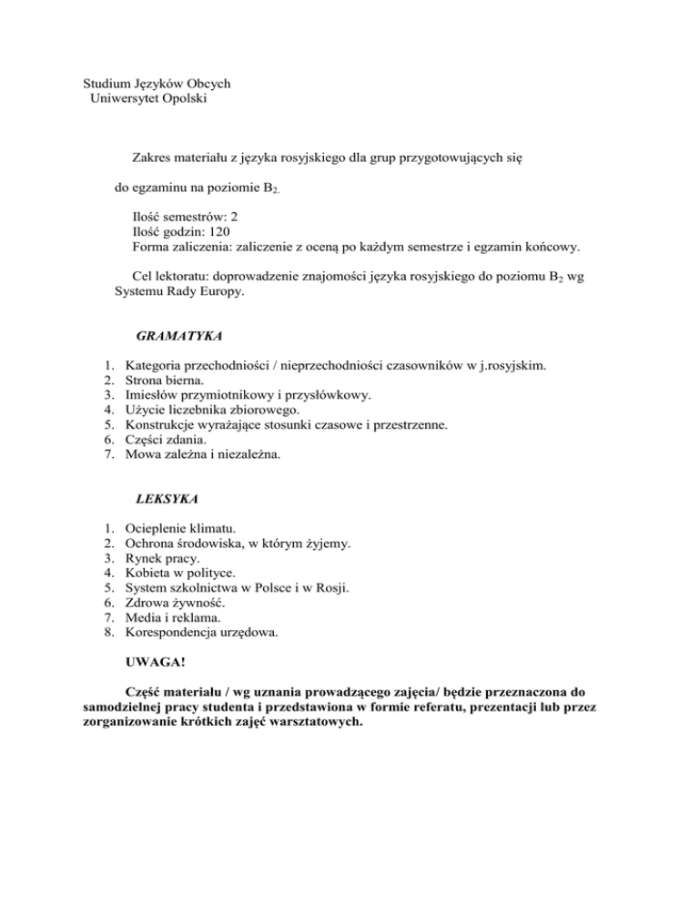 Studium Języków Obcych Uniwersytet Opolski Zakres materiału z języka rosyjskiego dla grup przygotowujących się do egzaminu na poziomie B2. Ilość semestrów: 2 Ilość godzin: 120 Forma zaliczenia: zaliczenie z oceną po każdym semestrze i egzamin końcowy. Cel lektoratu: doprowadzenie znajomości języka rosyjskiego do poziomu B2 wg Systemu Rady Europy. GRAMATYKA 1. 2. 3. 4. 5. 6. 7. Kategoria przechodniości / nieprzechodniości czasowników w j.rosyjskim. Strona bierna. Imiesłów przymiotnikowy i przysłówkowy. Użycie liczebnika zbiorowego. Konstrukcje wyrażające stosunki czasowe i przestrzenne. Części zdania. Mowa zależna i niezależna. LEKSYKA 1. 2. 3. 4. 5. 6. 7. 8. Ocieplenie klimatu. Ochrona środowiska, w którym żyjemy. Rynek pracy. Kobieta w polityce. System szkolnictwa w Polsce i w Rosji. Zdrowa żywność. Media i reklama. Korespondencja urzędowa. UWAGA! Część materiału / wg uznania prowadzącego zajęcia/ będzie przeznaczona do samodzielnej pracy studenta i przedstawiona w formie referatu, prezentacji lub przez zorganizowanie krótkich zajęć warsztatowych.