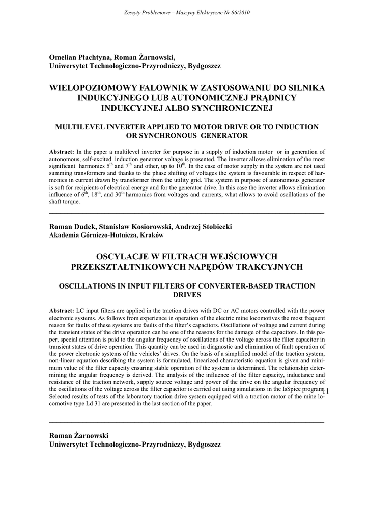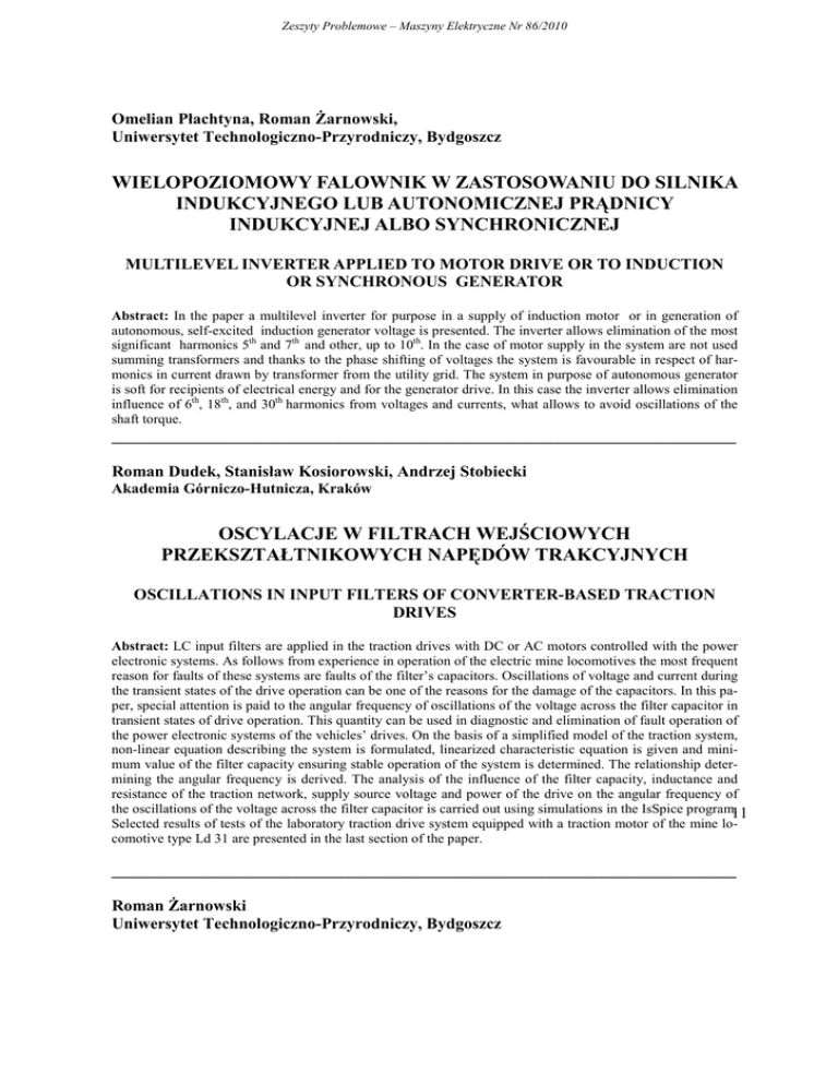 Zeszyty Problemowe – Maszyny Elektryczne Nr 86/2010 Omelian Płachtyna, Roman śarnowski, Uniwersytet Technologiczno-Przyrodniczy, Bydgoszcz WIELOPOZIOMOWY FALOWNIK W ZASTOSOWANIU DO SILNIKA INDUKCYJNEGO LUB AUTONOMICZNEJ PRĄDNICY INDUKCYJNEJ ALBO SYNCHRONICZNEJ MULTILEVEL INVERTER APPLIED TO MOTOR DRIVE OR TO INDUCTION OR SYNCHRONOUS GENERATOR Abstract: In the paper a multilevel inverter for purpose in a supply of induction motor or in generation of autonomous, self-excited induction generator voltage is presented. The inverter allows elimination of the most significant harmonics 5th and 7th and other, up to 10th. In the case of motor supply in the system are not used summing transformers and thanks to the phase shifting of voltages the system is favourable in respect of harmonics in current drawn by transformer from the utility grid. The system in purpose of autonomous generator is soft for recipients of electrical energy and for the generator drive. In this case the inverter allows elimination influence of 6th, 18th, and 30th harmonics from voltages and currents, what allows to avoid oscillations of the shaft torque. __________________________________________________________________________ Roman Dudek, Stanisław Kosiorowski, Andrzej Stobiecki Akademia Górniczo-Hutnicza, Kraków OSCYLACJE W FILTRACH WEJŚCIOWYCH PRZEKSZTAŁTNIKOWYCH NAPĘDÓW TRAKCYJNYCH OSCILLATIONS IN INPUT FILTERS OF CONVERTER-BASED TRACTION DRIVES Abstract: LC input filters are applied in the traction drives with DC or AC motors controlled with the power electronic systems. As follows from experience in operation of the electric mine locomotives the most frequent reason for faults of these systems are faults of the filter’s capacitors. Oscillations of voltage and current during the transient states of the drive operation can be one of the reasons for the damage of the capacitors. In this paper, special attention is paid to the angular frequency of oscillations of the voltage across the filter capacitor in transient states of drive operation. This quantity can be used in diagnostic and elimination of fault operation of the power electronic systems of the vehicles’ drives. On the basis of a simplified model of the traction system, non-linear equation describing the system is formulated, linearized characteristic equation is given and minimum value of the filter capacity ensuring stable operation of the system is determined. The relationship determining the angular frequency is derived. The analysis of the influence of the filter capacity, inductance and resistance of the traction network, supply source voltage and power of the drive on the angular frequency of the oscillations of the voltage across the filter capacitor is carried out using simulations in the IsSpice program.11 Selected results of tests of the laboratory traction drive system equipped with a traction motor of the mine locomotive type Ld 31 are presented in the last section of the paper. __________________________________________________________________________ Roman śarnowski Uniwersytet Technologiczno-Przyrodniczy, Bydgoszcz Zeszyty Problemowe – Maszyny Elektryczne Nr 86/2010 AUTONOMICZNA PRĄDNICA INDUKCYJNA Z KASKADOWYM FALOWNIKIEM NAPIĘCIA AUTONOMOUS INDUCTION GENERATOR WITH CASCADED VOLTAGE INVERTER Abstract: In the paper a frequency and voltage stabilisation system of autonomous, self-excited induction generator (API) is presented. Electrical energy with uncontrolled parameters, produced by API is converted to sin wave output energy with constant frequency and voltage with the help of a cascade inverter. Output voltage stabilisation is performed in the DC intermediate circuit of the inverter. The control strategy and the way of adding voltages in the cascade inverter which allow to eliminate the most significant harmonics up to assumed harmonic number is defined. Simulation results are enclosed. __________________________________________________________________________ Marek Niechaj Politechnika Lubelska, Lublin NUMERYCZNY MODEL FOTOWOLTAICZNEGO SYSTEMU NAPĘDOWEGO Z MAKSYMALIZACJĄ MOCY OPARTĄ NA DODATNIM SPRZĘśENIU ZWROTNYM NUMERICAL MODEL OF PHOTOVOLTAIC DRIVE SYSTEM WITH MPP TRACKER BASED ON POSITIVE FEEDBACK Abstract: The paper deals with numerical model of the system with photovoltaic generator feeding the DC commutator motor with permanent magnet excitement, by DC buck chopper. The motor drives its load of fan characteristic – centrifugal water pump. The system is of Stand-Alone type, and without the electric buffer source (electrochemical accumulator or supercapacitor). The simple circuit for Maximum Power Point tracking, with positive feedback from average value of motor’s armature voltage, has been applied in this system. The real system’s diagram is presented and shortly described. The numerical model of the whole real system has been created in TCAD simulation software. This model’s diagram is presented and described in details. The model of PV generator enables simple modeling of generator’s cells insolation changes, and also different temperatures of the cells, independently. The results of computer simulations of such transient states as: start-ups of the motor for different PV cells insolation and temperature values, and linear increases and decreases of insolation, are presented. The good points and shortcomings of the described system and its model are recapitulated in the conclusions. __________________________________________________________________________ Jan Anuszczyk, Andrzej Gocek Politechnika Łódzka, Łódź HAMOWANIE POCIĄGÓW METRA Z NAPĘDEM PRĄDU STAŁEGO I PRZEMIENNEGO PRZY WYKORZYSTANIU SYSTEMU ATO BRAKING OF UNDERGROUND TRAINS WITH AC AND DC DRIVE USING ATO SYSTEM Abstract: The paper describes AC and DC drives used in underground trains and braking methods of underground trains cooperating with an Automatic Train Operation (ATO) system. A train drive with an AC motor Zeszyty Problem