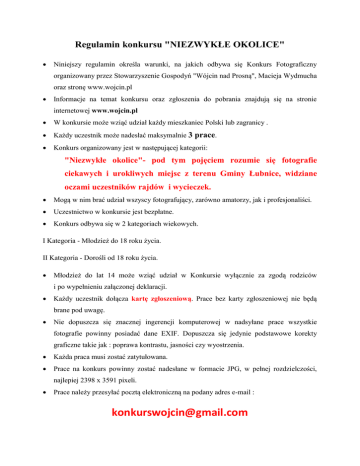 Regulamin konkursu "NIEZWYKŁE OKOLICE" Niniejszy regulamin określa warunki, na jakich odbywa się Konkurs Fotograficzny organizowany przez Stowarzyszenie Gospodyń "Wójcin nad Prosną", Macieja Wydmucha oraz stronę www.wojcin.pl Informacje na temat konkursu oraz zgłoszenia do pobrania znajdują się na stronie internetowej www.wojcin.pl W konkursie może wziąć udział każdy mieszkaniec Polski lub zagranicy . Każdy uczestnik może nadesłać maksymalnie 3 prace. Konkurs organizowany jest w następującej kategorii: "Niezwykłe okolice"- pod tym pojęciem rozumie się fotografie ciekawych i urokliwych miejsc z terenu Gminy Łubnice, widziane oczami uczestników rajdów i wycieczek. Mogą w nim brać udział wszyscy fotografujący, zarówno amatorzy, jak i profesjonaliści. Uczestnictwo w konkursie jest bezpłatne. Konkurs odbywa się w 2 kategoriach wiekowych. I Kategoria - Młodzież do 18 roku życia. II Kategoria - Dorośli od 18 roku życia. Młodzież do lat 14 może wziąć udział w Konkursie wyłącznie za zgodą rodziców i po wypełnieniu załączonej deklaracji. Każdy uczestnik dołącza kartę zgłoszeniową. Prace bez karty zgłoszeniowej nie będą brane pod uwagę. Nie dopuszcza się znacznej ingerencji komputerowej w nadsyłane prace wszystkie fotografie powinny posiadać dane EXIF. Dopuszcza się jedynie podstawowe korekty graficzne takie jak : poprawa kontrastu, jasności czy wyostrzenia. Każda praca musi zostać zatytułowana. Prace na konkurs powinny zostać nadesłane w formacie JPG, w pełnej rozdzielczości, najlepiej 2398 x 3591 pixeli. Prace należy przesyłać pocztą elektroniczną na podany adres e-mail : [email protected] lub dostarczyć osobiście na adres: Maciej Wydmuch Wójcin, ul Świerczewskiego 12 Każdą pracę należy opisać według następującego schematu: imie_nazwisko_tytuł.jpg Na zgłoszenia czekamy do 31 lipca Rozstrzygnięcie konkursu nastąpi podczas ostatniego etapu rajdu (termin zostanie opublikowany na stronie www.wojcin.pl) Prace mogą być wykonane w dowolnej technice kolorystycznej. Komisja Konkursowa zostanie powołana przez Stowarzyszenie Gospodyń Wójcin nad Prosną, po upływie ostatniego dnia przyjmowania prac. Organizator przewiduje nagrody rzeczowe i dyplomy dla laureatów obu kategorii wiekowych, którzy zajmą miejsce od pierwszego do trzeciego. Komisja może również podzielić pulę nagród według swego uznania. Nagrodzone i wyróżnione fotografie zostaną umieszczone na stronie internetowej: www.wojcin.pl . Zostanie również zorganizowana wystawa fotograficzna w Centrum Kultury Wsi Wójcin i Andrzejów. Wszystkie prace biorące udział konkursie (z obu kategorii wiekowych) przechodzą na własność organizatora, w celu wykorzystania i promowania regionu z zachowaniem praw autorskich. Fotografie, niespełniające warunków regulaminu lub zgłoszone po terminie, nie będą brane pod uwagę. Organizator zastrzega sobie prawo do odrzucenia fotografii o treściach powszechnie uznawanych za obraźliwe, naruszające prawa osób trzecich lub prawo polskie, zawierających treści pornograficzne lub w sposób oczywisty godzących w uczucia religijne. Decyzja o usunięciu takich fotografii jest niepodważalna i ostateczna. Decyzje jury są ostateczne i wiążące dla uczestników. Uwagi końcowe: Komunikaty i informacje na temat konkursu zamieszczane będą na stronie internetowej www.wojcin.pl Organizator zastrzega sobie możliwość odwołania Konkursu w przypadku otrzymania niedostatecznej liczby fotografii. Zgłaszając pracę do konkursu, każdy uczestnik potwierdza, że: Posiada pełne prawa autorskie do fotografii i przenosi je na Organizatora w zakresie niezbędnym do ich publikacji lub innego rozpowszechniania. Przenosi nieodpłatnie autorskie prawa majątkowe na rzecz Organizatora, bez ograniczeń czasowych i terytorialnych (art. 50 ustawy o prawie autorskim i prawach pokrewnych z dnia 04.02.1994 r.; Dz.U. z dnia 23.02.1994 r.) w tym szczególnie w zakresie wykorzystywania techniką drukarską i cyfrową, wystawiania, udostępniania na stronie internetowej Organizatora i we wszystkich materiałach promocyjnych i reklamowych, bez względu na sposób ich zwielokrotnienia i wprowadzania do obrotu. Akceptuje regulamin i zobowiązuje się do całkowitej akceptacji. Wyraża zgodę na przetwarzanie i udostępnianie swoich danych osobowych: imię nazwisko, adres zamieszkania (na podstawie ustawy o ochronie danych osobowych z dnia 29 sierpnia 1997 r.; Dz. U. Nr 133,poz. 883 z późn. zm.).