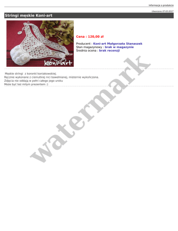 Informacje o produkcie Utworzono 07-03-2017 Stringi męskie Koni-art Cena : 120,00 zł er m ar k Producent : Koni-art Małgorzata Stanaszek Stan magazynowy : brak w magazynie Średnia ocena : brak recenzji w at Męskie stringi z koronki koniakowskiej. Ręcznie wykonane z cieniutkiej nici bawełnianej, misternie wykończona. Zdjęcia nie oddają w pełni całego jego uroku Może być też miłym prezentem :)