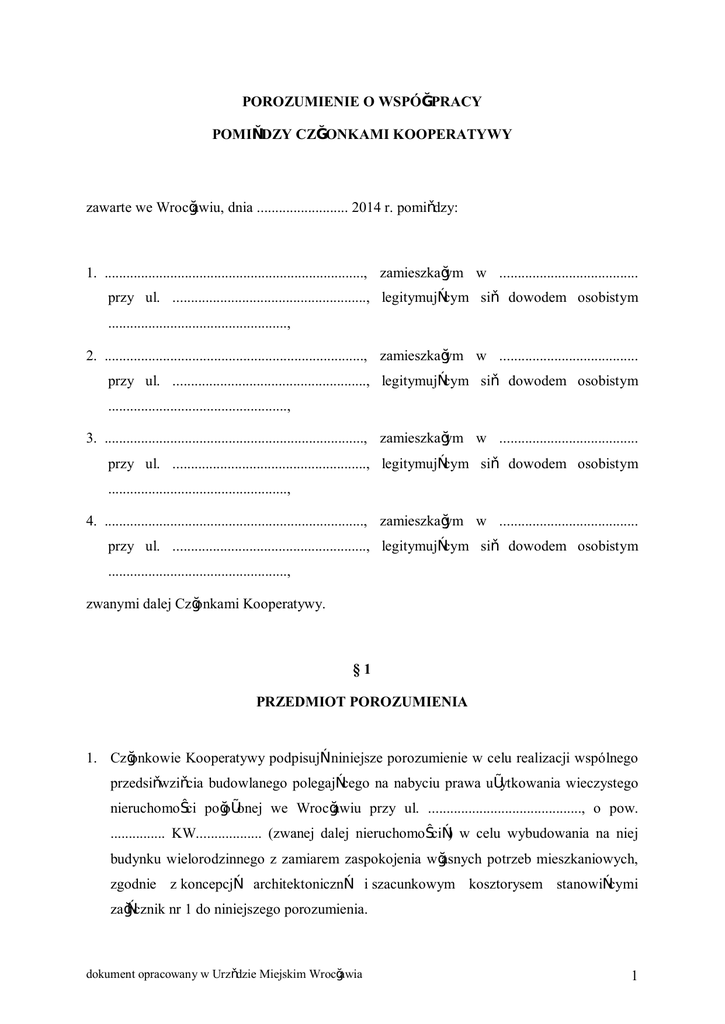 POROZUMIENIE O WSPÓŁPRACY POMIĘDZY CZŁONKAMI KOOPERATYWY zawarte we Wrocławiu, dnia ......................... 2014 r. pomiędzy: 1. ......................................................................., zamieszkałym w ...................................... przy ul. ....................................................., legitymującym się dowodem osobistym ................................................., 2. ......................................................................., zamieszkałym w ...................................... przy ul. ....................................................., legitymującym się dowodem osobistym ................................................., 3. ......................................................................., zamieszkałym w ...................................... przy ul. ....................................................., legitymującym się dowodem osobistym ................................................., 4. ......................................................................., zamieszkałym w ...................................... przy ul. ....................................................., legitymującym się dowodem osobistym ................................................., zwanymi dalej Członkami Kooperatywy. §1 PRZEDMIOT POROZUMIENIA 1. Członkowie Kooperatywy podpisują niniejsze porozumienie w celu realizacji wspólnego przedsięwzięcia budowlanego polegającego na nabyciu prawa użytkowania wieczystego nieruchomości położonej we Wrocławiu przy ul. .........................................., o pow. ............... KW.................. (zwanej dalej nieruchomością) w celu wybudowania na niej budynku wielorodzinnego z zamiarem zaspokojenia własnych potrzeb mieszkaniowych, zgodnie z koncepcją architektoniczną i szacunkowym kosztorysem stanowiącymi załącznik nr 1 do niniejszego porozumienia. dokument opracowany w Urzędzie Miejskim Wrocławia 1 2. Członkowie Kooperatywy ustalają, że w budynku mieszkalnym wielorodzinnym: - lokal mieszkalny nr 1 wraz z udziałem w częściach wspólnych po ustanowieniu odrębnej własności lokalu będzie własnością ................................................................. - lokal mieszkalny nr 2 wraz z udziałem w częściach wspólnych po ustanowieniu odrębnej własności lokalu będzie własnością ................................................................. - lokal mieszkalny nr 3 wraz z udziałem w częściach wspólnych po ustanowieniu odrębnej własności lokalu będzie własnością ................................................................. - lokal mieszkalny nr 4 wraz z udziałem w częściach wspólnych po ustanowieniu odrębnej własności lokalu będzie własnością ................................................................. np. lokal mieszkalny nr 1 wraz z udziałem w częściach wspólnych po ustanowieniu odrębnej własności lokalu będzie własnością Jana Kowalskiego Jeżeli lokal usługowy będzie własnością jednego Członka Kooperatywy, również powinien być wymieniony w tym punkcie. 3. Wspólne przedsięwzięcie budowlane będzie obejmowało w szczególności: a. przygotowanie dokumentacji wymaganej w ogłoszeniu o przetargu na oddanie nieruchomości w użytkowanie wieczyste; b. przystąpienie do przetargu oraz, w przypadku jego wygrania, nabycie prawa użytkowania wieczystego nieruchomości w udziałach, które odpowiadają wielkości planowanych lokali mieszkalnych wraz z pomieszczeniami przynależnymi w stosunku do powierzchni wszystkich lokali mieszkalnych wraz z pomieszczeniami przynależnymi tzn.: - .........................- ....... udziału w nieruchomości, - .........................- ....... udziału w nieruchomości, - .........................- ....... udziału w nieruchomości, - .........................- ....... udziału w nieruchomości; np. Jan Kowalski – 1/4 udziału w nieruchomości (jako wielkość planowanego lokalu nr 1 wraz z powierzchnią przynależną do lokalu nr 1 w stosunku do powierzchni wszystkich lokali mieszkalnych wraz z powierzchnią do nich przynależną) dokument opracowany w Urzędzie Miejskim Wrocławia 2 c. opracowanie dokumentacji projektowo-kosztorysowej i uzyskanie pozwolenia na budowę zgodnie z koncepcją architektoniczną stanowiącą załącznik nr 1 do niniejszego porozumienia; d. realizację procesu budowlanego zgodnie z terminami określonymi w umowie o oddaniu gruntu w użytkowanie wieczyste oraz harmonogramem prac stanowiącym załącznik nr 2 do niniejszego porozumienia; e. uzyskanie pozwolenia na użytkowanie; f. ustalenie udziałów w częściach wspólnych budynku i prawie użytkowania wieczystego gruntu, dokonanie ostatecznych wzajemnych rozliczeń między Członkami Kooperatywy oraz wyodrębnienie własności poszczególnych lokali mieszkalnych (i użytkowych, jeśli takie przewidziano). §2 TERMIN OBOWIĄZYWANIA POROZUMIENIA Członkowie Kooperatywy zgodnie ustalają, że niniejsze porozumienie zostaje zawarte na czas realizacji inwestycji i obowiązuje od dnia jego podpisania. Przez zakończenie inwestycji rozumie się uprawomocnienie postanowienia sądu wieczystoksięgowego o wyodrębnieniu własności lokali. §3 FINANSOWANIE INWESTYCJI 1. Poszczególni Członkowie Kooperatywy zobowiązują się ponosić wydatki na pokrycie kosztów nabycia nieruchomości, projektowania i budowy oraz wszelkich kosztów dodatkowych odpowiednio do swoich udziałów w nieruchomości określonych w §1 ust. 3 pkt b i zgodnie z harmonogramem płatności stanowiącym załącznik nr 3 do niniejszego porozumienia. 2. Członkowie Kooperatywy, którzy nie wpłacili kwot wynikających z harmonogramu płatności zgodnie z ust. 1, obowiązani są do zapłaty odsetek za każdy dzień opóźnienia dokument opracowany w Urzędzie Miejskim Wrocławia 3 w wysokości ..... % kwoty pozostałej do zapłaty, przy czym łączna wysokość odsetek, która może obciążyć Członka 