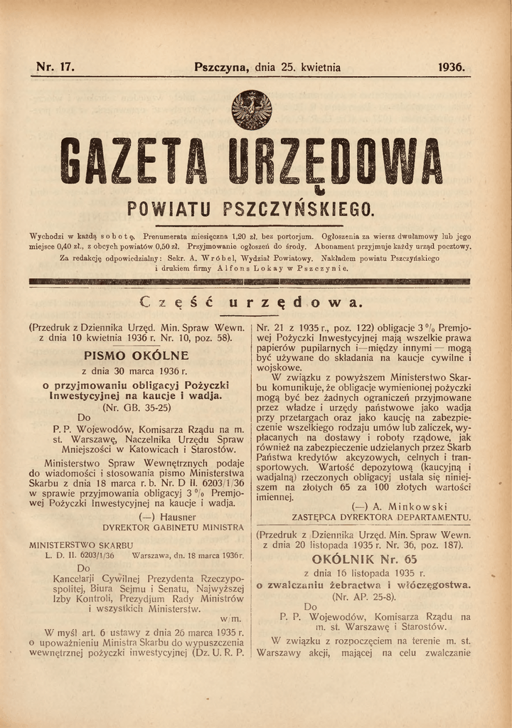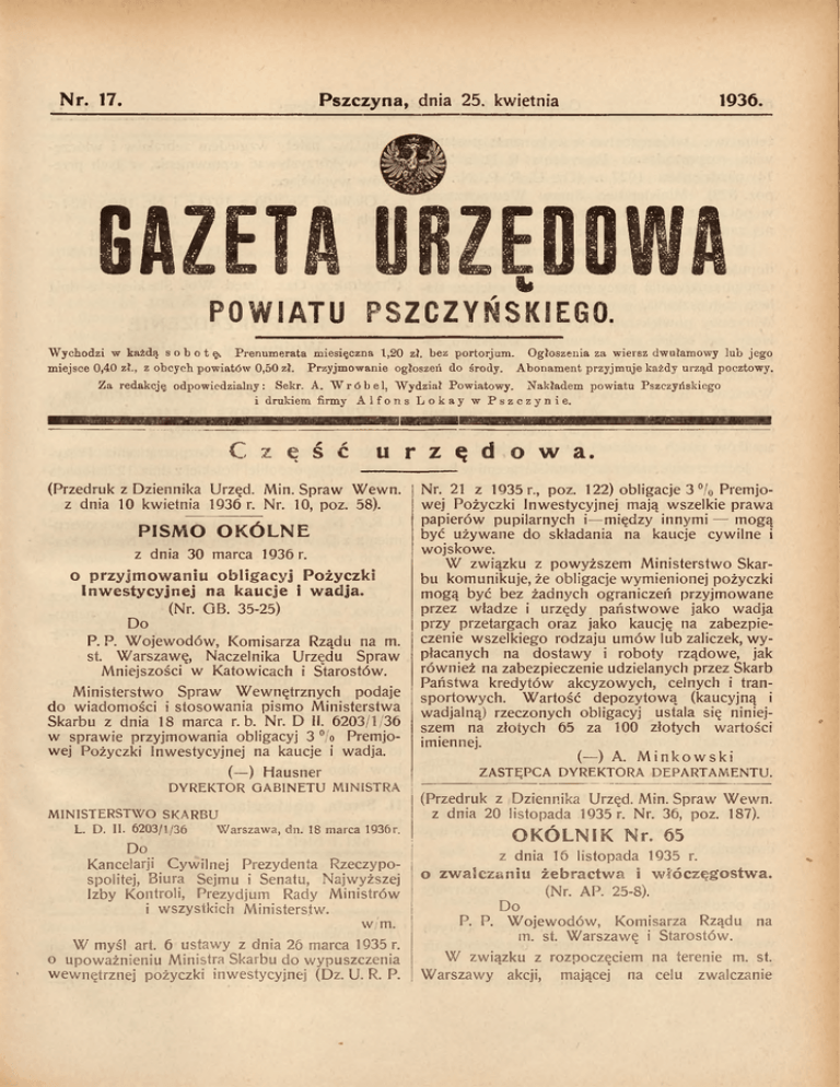 Nr. 17. Pszczyna, dnia 25. kwietnia 1936. GAZETA URZĘDOWA POWIATU PSZCZYŃSKIEGO. Wychodzi w każdą sobotę, Prenumerata miesięczna 1,20 zł. bez portorjum. Ogłoszenia za wiersz dwułamowy lub jego miejsce 0,40 zł., z obcych powiatów 0,50 zł. Przyjmowanie ogłoszeń do środy. Abonament przyjmuje każdy urząd pocztowy. Za redakcję odpowiedzialny: Sekr. A. Wróbel, Wydział Powiatowy. Nakładem powiatu Pszczyńskiego i drukiem firmy Alfons Lokay w Pszczynie. Część urzędowa. (Przedruk z Dziennika Urzęd. Min. Spraw Wewn. z dnia 10 kwietnia 1936 r. Nr. 10, poz. 58). PISMO OKÓLNE z dnia 30 marca 1936 r. o przyjmowaniu obligacyj Pożyczki Inwestycyjnej na kaucje i wadja. (Nr. GB. 35-25) Do P. P. Wojewodów, Komisarza Rządu na m. st. Warszawę, Naczelnika Urzędu Spraw Mniejszości w Katowicach i Starostów. Ministerstwo Spraw Wewnętrznych podaje do wiadomości i stosowania pismo Ministerstwa Skarbu z dnia 18 marca r. b. Nr. D II. 6203/1/36 w sprawie przyjmowania obligacyj 3 °/o Premio wej Pożyczki Inwestycyjnej na kaucje i wadja. (—) Hausner DYREKTOR GABINETU MINISTRA MINISTERSTWO SKARBU L. D. II. 6203/1/36 Warszawa, dn. 18 marca 1936r. Do Kancelarji Cywilnej Prezydenta Rzeczypo spolitej, Biura Sejmu i Senatu, Najwyższej Izby Kontroli, Prezydjum Rady Ministrów i wszystkich Ministerstw. w/m. W myśl art. 6 ustawy z dnia 26 marca 1935 r. o upoważnieniu Ministra Skarbu do wypuszczenia wewnętrznej pożyczki inwestycyjnej (Dz. U. R. P. Nr. 21 z 1935 r., poz. 122) obligacje 3 °/0 Premjowej Pożyczki Inwestycyjnej mają wszelkie prawa papierów pupilarnych i—między innymi — mogą być używane do składania na kaucje cywilne i wojskowe. W związku z powyższem Ministerstwo Skar bu komunikuje, że obligacje wymienionej pożyczki mogą być bez żadnych ograniczeń przyjmowane przez władze i urzędy państwowe jako wadja przy przetargach oraz jako kaucję na zabezpie czenie wszelkiego rodzaju umów lub zaliczek, wy płacanych na dostawy i roboty rządowe, jak również na zabezpieczenie udzielanych przez Skarb Państwa kredytów akcyzowych, celnych i tran sportowych. Wartość depozytową (kaucyjną i wadjalną) rzeczonych obligacyj ustala się niniejszem na złotych 65 za 100 złotych wartości imiennej. (—) A. Minkowski ZASTĘPCA DYREKTORA DEPARTAMENTU. (Przedruk z Dziennika Urzęd. Min. Spraw Wewn. z dnia 20 listopada 1935 r. Nr. 36, poz. 187). OKÓLNIK Nr. 65 z dnia 16 listopada 1935 r. o zwalczaniu żebractwa i włóczęgostwa. (Nr. AP. 25-8). Do P. P. Wojewodów, Komisarza Rządu na m. st. Warszawę i Starostów. W związku z rozpoczęciem na terenie m. st. Warszawy akcji, mającej na celu zwalczanie 60 Nr. 17 Gazeta Urzędowa Powiatu Pszczyńskiego żebractwa i włóczęgostwa w wykonaniu postano wień rozporządzenia Prezydenta R. P. z dnia 14 października 1927 r. (Dz. U. R. P. Nr. 92, poz. 823), Ministerstwo Spraw Wewnętrznych w porozumieniu z Ministerstwem Opieki Społecz nej zarządza, co następuje: W celu przyjścia z pomocą tej akcji i nie dopuszczania do stolicy osób, które pod pozo rem poszukiwania pracy opuszczają miejsce sta łego zamieszkania, a następnie po przybyciu do Warszawy powiększają liczbę bezdomnych, nie kiedy zaś oddają się żebraninie i wałęsaniu na leży ze szczególną uwagą przy zgłaszaniu się petentów do władz o zasiłki na wyjazd do Warszawy lub o ulgowe bilety na przejazd ba dać, czy rzeczywiście zgłaszający się wyjeżdżają celem objęcia pracy, z reguły jednak nie należy zasiłków takich w żadnej formie udzielać. Jednocześnie należy środkami, leżącemi w kom petencji władz, przeciwdziałać niecelowym wę drówkom osób, które w następstwie takich wę drówek stają się ciężarem miejscowej opieki społecznej lub oddają się żebraninie. W ostatnich czasach daje się zauważyć znacz ny wzrost żebractwa wśród nieletnich. Przy czyną tego wzrostu jest w wielu wypadkach walka, prowadzona z żebractwem i włóczęgo stwem dorosłych, którzy pragnąc uniknąć zasto sowania wobec nich środków zapobiegawczych, poprawczych i karnych wyręczają się nieletniemi, skłaniając ich do żebraniny. Ministerstwo Spraw Wewnętrznych prosi o wydanie stosownych zarządzeń w celu prze ciwdziałania temu szkodliwemu objawowi przez zwracanie szczególnej uwagi na wypadki żebra nia nieletnich; w razie stwierdzenia, że nieletni skłoniony został do tego przez inne osoby, na leży w stosunku do tych ostatnich stosować sankcje karne, wynikające z art. 32 prawa o wy kroczeniach. Tym samym sankcjom karnym podlegają także osoby, które żebrzą w sposób zuchwały lub oszukańczy. W województwach, na obszarze których weszły w życie postanowienia rozporządzenia z dnia 14 października 1927 r. (Dz. U. R. P. Nr. 92, poz. 823) o zwalczaniu żebractwa i włó- częgostwa należy względem żebraków i włóczę gów wykorzystywać uprawnienia, z tych prze pisów wynikające. Okólniki Nr. 120 z 1933 r. i Nr. j'100 z 1934 r. uchyła się. (—) Kawecki PODSEKRETARZ STANU (Przedruk z Gaz. Urzęd. Woj. Śląskiego z dnia 8 lutego 1936. Nr. 3, poz. 1.) ROZPORZĄDZENIE Wojewody Śląskiego z dnia 3 lutego 1936 r. o ustaleniu stawek wynagrodzenia za środki przewozowe na rzecz wojska w roku 1936. Na zasadzie art. 15 Rozporządzenia Prezy denta Rzeczypospolitej Polskiej z dnia 12 listopada 1927 r o obowiązku dostarczania środków prze wozowych na rzecz wojska w czasie pokoju (Dz. U. R. P. Nr. 102, poz. 883) zarządzam w porozu mieniu z Dowódcą Okręgu Korpusu Nr. V w Kra kowie co następuje: Za dostarczone środki przewozowe na rzecz wojska, ustala się na rok 1936 stawki wynagro dzenia wymienione w § 2 niniejszego rozporzą dzenia. § 2. Za użycie środków przewozowych dostarczo nych przez osoby fizyczne i prawne na rzecz wojska w czasie pokoju ustala się następujące stawki wynagrodzenia, przyczem wynagrodzenie to uzależnione jest od ilości przebytych kilome trów albo od czasu użycia środków