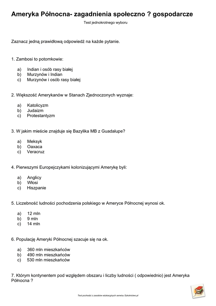 Ameryka Północna- zagadnienia społeczno ? gospodarcze Test jednokrotnego wyboru Zaznacz jedną prawidłową odpowiedź na każde pytanie. 1. Zambosi to potomkowie: a) b) c) Indian i osób rasy białej Murzynów i Indian Murzynów i osób rasy białej 2. Większość Amerykanów w Stanach Zjednoczonych wyznaje: a) b) c) Katolicyzm Judaizm Protestantyzm 3. W jakim mieście znajduje się Bazylika MB z Guadalupe? a) b) c) Meksyk Oaxaca Veracruz 4. Pierwszymi Europejczykami kolonizującymi Amerykę byli: a) b) c) Anglicy Włosi Hiszpanie 5. Liczebność ludności pochodzenia polskiego w Ameryce Północnej wynosi ok. a) b) c) 12 mln 9 mln 14 mln 6. Populację Ameryki Północnej szacuje się na ok. a) b) c) 360 mln mieszkańców 490 mln mieszkańców 530 mln mieszkańców 7. Którym kontynentem pod względem obszaru i liczby ludności ( odpowiednio) jest Ameryka Północna ? Test pochodzi z zasobów edukacyjnych serwisu Szkolnictwo.pl a) b) c) 2 ? obszar i 3 ludność 4 ? obszar i 2 ludność 3 ? obszar i 4 ludność 8. Największą aglomeracją Ameryki Północnej jest aglomeracja: a) b) c) Meksyku Nowego Jorku Chicago 9. Jaki % ludności mieszka w miastach Ameryki Płn.? a) b) c) 65% 72% 80% 10. PKB na jednego mieszkańca w Kanadzie wynosi ok. : a) b) c) 29% 38% 47% 11. Słodkie ziemniaki to: a) b) c) Bataty Sizal Maniok 12. Jaka jest średnia gęstość zaludnienia w USA?: a) b) c) ok. 27 os./km2 ok. 32 os. / km2 ok. 43 os./km 2 13. Jakie miasto nie należy do największego megalopolis w USA?: a) b) c) Nowy Jork Boston Chicago 14. Liczba ludności w Meksyku wynosi ok: a) b) c) 95 mln 102 mln 112 mln Test pochodzi z zasobów edukacyjnych serwisu Szkolnictwo.pl 15. Miasto Majów to: a) b) c) Teotihuacan Chichén Itzá Monte Alban Test pochodzi z zasobów edukacyjnych serwisu Szkolnictwo.pl