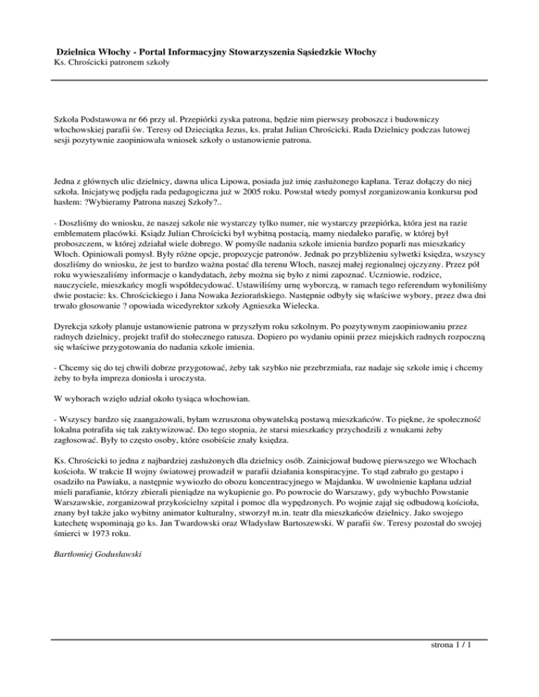 Dzielnica Włochy - Portal Informacyjny Stowarzyszenia Sąsiedzkie Włochy Ks. Chrościcki patronem szkoły Szkoła Podstawowa nr 66 przy ul. Przepiórki zyska patrona, będzie nim pierwszy proboszcz i budowniczy włochowskiej parafii św. Teresy od Dzieciątka Jezus, ks. prałat Julian Chrościcki. Rada Dzielnicy podczas lutowej sesji pozytywnie zaopiniowała wniosek szkoły o ustanowienie patrona. Jedna z głównych ulic dzielnicy, dawna ulica Lipowa, posiada już imię zasłużonego kapłana. Teraz dołączy do niej szkoła. Inicjatywę podjęła rada pedagogiczna już w 2005 roku. Powstał wtedy pomysł zorganizowania konkursu pod hasłem: ?Wybieramy Patrona naszej Szkoły?.. - Doszliśmy do wniosku, że naszej szkole nie wystarczy tylko numer, nie wystarczy przepiórka, która jest na razie emblematem placówki. Ksiądz Julian Chrościcki był wybitną postacią, mamy niedaleko parafię, w której był proboszczem, w której zdziałał wiele dobrego. W pomyśle nadania szkole imienia bardzo poparli nas mieszkańcy Włoch. Opiniowali pomysł. Były różne opcje, propozycje patronów. Jednak po przybliżeniu sylwetki księdza, wszyscy doszliśmy do wniosku, że jest to bardzo ważna postać dla terenu Włoch, naszej małej regionalnej ojczyzny. Przez pół roku wywieszaliśmy informacje o kandydatach, żeby można się było z nimi zapoznać. Uczniowie, rodzice, nauczyciele, mieszkańcy mogli współdecydować. Ustawiliśmy urnę wyborczą, w ramach tego referendum wyłoniliśmy dwie postacie: ks. Chrościckiego i Jana Nowaka Jeziorańskiego. Następnie odbyły się właściwe wybory, przez dwa dni trwało głosowanie ? opowiada wicedyrektor szkoły Agnieszka Wielecka. Dyrekcja szkoły planuje ustanowienie patrona w przyszłym roku szkolnym. Po pozytywnym zaopiniowaniu przez radnych dzielnicy, projekt trafił do stołecznego ratusza. Dopiero po wydaniu opinii przez miejskich radnych rozpoczną się właściwe przygotowania do nadania szkole imienia. - Chcemy się do tej chwili dobrze przygotować, żeby tak szybko nie przebrzmiała, raz nadaje się szkole imię i chcemy żeby to była impreza doniosła i uroczysta. W wyborach wzięło udział około tysiąca włochowian. - Wszyscy bardzo się zaangażowali, byłam wzruszona obywatelską postawą mieszkańców. To piękne, że społeczność lokalna potrafiła się tak zaktywizować. Do tego stopnia, że starsi mieszkańcy przychodzili z wnukami żeby zagłosować. Były to często osoby, które osobiście znały księdza. Ks. Chrościcki to jedna z najbardziej zasłużonych dla dzielnicy osób. Zainicjował budowę pierwszego we Włochach kościoła. W trakcie II wojny światowej prowadził w parafii działania konspiracyjne. To stąd zabrało go gestapo i osadziło na Pawiaku, a następnie wywiozło do obozu koncentracyjnego w Majdanku. W uwolnienie kapłana udział mieli parafianie, którzy zbierali pieniądze na wykupienie go. Po powrocie do Warszawy, gdy wybuchło Powstanie Warszawskie, zorganizował przykościelny szpital i pomoc dla wypędzonych. Po wojnie zajął się odbudową kościoła, znany był także jako wybitny animator kulturalny, stworzył m.in. teatr dla mieszkańców dzielnicy. Jako swojego katechetę wspominają go ks. Jan Twardowski oraz Władysław Bartoszewski. W parafii św. Teresy pozostał do swojej śmierci w 1973 roku. Bartłomiej Godusławski strona 1 / 1