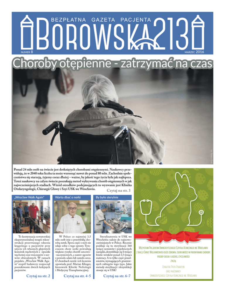 NUMER 8 MARZEC 2016 Choroby otępienne - zatrzymać na czas fot: Tomasz Gola Ponad 24 mln osób na świecie jest dotkniętych chorobami otępiennymi. Naukowcy przewidują, że w 2040 toku liczba ta może wzrosnąć nawet do ponad 80 mln. Zachodnie społeczeństwa się starzeją, żyjemy coraz dłużej – ważne, by jakość tego życia była jak najlepsza. Toteż naukowcy na całym świecie poszukują metod wykrywania chorób otępiennych w jak najwcześniejszych stadiach. Wśród ośrodków podejmujących to wyzwanie jest Klinika Otolaryngologii, Chirurgii Głowy i Szyi USK we Wrocławiu. Czytaj na str. 3 „Wrocław Walk Again” Warto dbać o nerki By było sterylnie To kontynuacja nowatorskiej eksperymentalnej terapii rekonstrukcji przerwanego rdzenia kręgowego u pacjentów przy użyciu ich własnych glejowych komórek węchowych z opuszki węchowej oraz wszczepów z nerwów obwodowych. W ramach projektu „Wrocław Walk Again” zespół badawczy rozpoczął poszukiwanie dwóch kolejnych pacjentów. W Polsce co najmniej 3,5 mln osób żyje z przewlekłą chorobą nerek. Spora część z nich nie zdaje sobie z tego sprawy. Tymczasem chore nerki powodują większe ryzyko chorób sercowo-naczyniowych, a nawet zgonów z powodu udaru lub zawału serca. O chorobach nerek i ich leczeniu opowiada prof. Marian Klinger, kierownik Kliniki Nefrologii i Medycyny Transplantacyjnej. Sterylizatornia w USK we Wrocławiu należy do najnowocześniejszych w Polsce. Rocznie poddaje się tu sterylizacji 360 tysięcy zestawów i pojedynczych narzędzi, dezynfekuje się 6 tysięcy łóżek i wózków ponad 3,5 tysiąca materacy. A to tylko część przedmiotów, wymagających gruntownych zabiegów tego typu. Jakie metody sterylizacji i dezynfekcji stosuje się w USK? Czytaj na str. 2 Czytaj na str. 4-5 Czytaj na str. 6-7 Wszystkim Pacjentom Uniwersyteckiego Szpitala Klinicznego we Wrocławiu z okazji Świąt Wielkanocnych dużo zdrowia, cierpliwości w pokonywaniu choroby, pogody ducha i ludzkiej życzliwości życzą: Dyrektor Piotr Pobrotyn oraz pracownicy Uniwersyteckiego Szpitala Klinicznego we Wrocławiu 2 AKTUALNOŚCI MARZEC 2016 Ruszył nabór pacjentów do nowatorskiej terapii ców z Polski i Wielkiej Brytanii pod kierownictwem dr hab. Pawła Tabakowa. Koszty badania zostaną pokryte m.in. ze środków Nicholls Spinal Injury Foundation (UK). Od kwalifikacji i początkowych badań do zabiegu minie co najmniej rok. Zakwalifikowani uczestnicy nie będą płacić za swoje leczenie i rehabilitację. Każdego pacjenta czeka po zabiegach operacyjnych także co najmniej dwuletni okres rehabilitacji pod okiem zespołu lekarskiego we Wrocławiu. Zdaniem prof. Włodzimierza Jarmundowicza wyniki pierwszej operacji potwierdziły, że kierunek badań jest właściwy, ale za wcześnie, aby mówić o pełnym sukcesie, czyli uznanej metodzie leczenia: - Oczywiście, cieszymy się z naszego sukcesu naukowego, ale istnieje potrzeba jego potwierdzenia w czasie kolejnych operacji. Historyczne osiągnięcie polskich i brytyjskich naukowców pozwala jednak mieć nadzieję, że możliwe będzie leczenie urazów rdzenia kręgowego, które do tej pory uważano za nieuleczalne. KRYTERIA WŁĄCZENIA DO BADANIA • urazowe przerwanie ciągłości rdzenia kręgowego, np. w wyniku przez rdzeń poniżej miejsca jego uszkodzenia (stopień uszkodzenia ASIA A, Frankel A - w razie wątpliwości pacjent powinien skorzystać z opinii lokalnego neurologa/neurochirurga co do stopnia ciężkości uszkodzenia) • wiek od 16 do 65 lat • pacjent poddawany ciągłej rehabilitacji • dobra motywacja i gotowość do współpracy, brak zaburzeń psychicznych i umysłowych • w przypadku osób mieszkających za granicą gotowość do spędzenia w Polsce (wraz z osobą towarzyszącą) okresu 3 lat (z przerwami) 3 Badania związane ze starszym wiekiem są jednym z ważniejszych wyzwań współczesnej medycyny. Nic więc dziwnego, że integrują lekarzy różnych specjalizacji, bo wymiana wiedzy i doświadczeń w opiece nad seniorami jest niezmiernie istotna. Problematyce wieku senioralnego poświęcony będzie międzynarodowy kongres „Przełamujemy bariery”, organizowany przez Klinikę Psychiatrii i Klinikę Otolaryngologii, Chirurgii Głowy i Szyi we Wrocławiu w dniach 2-3 grudnia b.r. Poza specjalistycznymi sesjami naukowymi zaplanowano także warsztaty dla pacjentów, podczas których będzie można dowiedzieć się wiele o starości – i o sobie. Choroby otępienne – zatrzymać wroga na czas Ponad 24 mln osób na świecie jest dotkniętych chorobami otępiennymi. Naukowcy prze- konywać badania w gabinetach widują, że w 2040 roku liczba ta może wzrosnąć nawet do ponad 80 mln. Zachodnie społe- okulistycznych i gabinetach lekarzy czeństwa się starzeją, żyjemy coraz dłużej – ważne, by jakość tego życia była jak najlepsza. rodzinnych – dodaje prof. Kręcicki. Toteż naukowcy na całym świecie poszukują metod wykrywania chorób otępiennych w jak Chory inaczej chodzi najwcześniejszych stadiach. Wśród ośrodków podejmujących to wyzwanie jest Klinika OtoW zespołach otępiennych dolaryngologii, Chirurgii Głowy i Szyi USK we Wrocławiu. KRYTERIA WYŁĄCZENIA UNIEMOŻLIWIAJĄCE UDZIAŁ W PROJEKCIE • współistniejące uszkodzenie bądź choroba w ośrodkowym lub obwodowym układzie nerwowym • istotne zwężenie kanału kręgowego w miejscu urazu lub niestabilność kręgosłupa • atrofia mięśni lub istotnie ograniczona ruchomość w stawach porażonych kończyn (np. wskutek skostnień okołostawowych) • silne bóle neuropatyczne • poważna choroba układowa, jak nowotwór, choroba zakaźna, cukrzyca itp. ► prof. Tomasz Kręcicki. fot: Tomasz Gola Projekt „Wrocław Walk Again” jest kontynuacją nowatorskiej eksperymentalnej terapii rekonstrukcji przerwanego rdzenia kręgowego u pacjentów przy użyciu ich własnych glejowych komórek węchowych z opuszki węchowej oraz wszczepów z nerwów obw