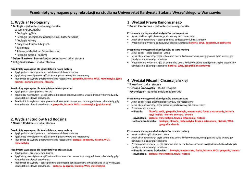 Przedmioty wymagane przy rekrutacji na studia na Uniwersytet Kardynała Stefana Wyszyńskiego w Warszawie: 1.Wydział Teologiczny * Teologia – jednolite studia magisterskie w tym SPECJALNOŚCI: * Teologia ogólna * Teologia (specjalność nauczycielsko- katechetyczna) * Teologia kultury * Turystyka krajów biblijnych * Misjologia * Edukacja Medialna i Dziennikarstwo * Teologia ogólna (Radom) * Dziennikarstwo i komunikacja społeczna – studia I stopnia * Religioznawstwo – studia I stopnia Przedmioty wymagane dla kandydatów z nową maturą • Język polski – część pisemna; podstawowy lub rozszerzony • Język obcy nowożytny – część pisemna; podstawowy lub rozszerzony • Przedmiot do wyboru podstawowy albo rozszerzony: geografia, historia, WOS, matematyka, język łaciński i kultura antyczna, filozofia Przedmioty wymagane dla kandydatów ze starą maturą • Język polski- część pisemna i ustna • Język obcy nowożytny – część ustna albo ocena końcoworoczna, uwzględniana tylko wtedy, gdy kandydat nie zdawał przedmiotu • Przedmiot do wyboru- część pisemna albo ocena końcoworoczna uwzględniana tylko wtedy, gdy kandydat nie zdawał przedmiotu – geografia, historia, WOS, matematyka, język łaciński 2.Wydział Studiów Nad Rodziną * Nauki o Rodzinie – studia I stopnia Przedmioty wymagane dla kandydatów z nową maturą • Język polski – część pisemna; podstawowy lub rozszerzony • Język obcy nowożytny – część pisemna; podstawowy lub rozszerzony • Przedmiot do wyboru podstawowy albo rozszerzony: biologia, geografia, historia, WOS, matematyka Przedmioty wymagane dla kandydatów ze starą maturą • Język polski – część pisemna i ustna • Język obcy nowożytny – część ustna albo ocena końcoworoczna, uwzględniana tylko wtedy, gdy kandydat nie zdawał przedmiotu • Przedmiot do wyboru – część pisemna albo ocena końcoworoczna uwzględniana tylko wtedy, gdy kandydat nie zdawał przedmiotu – biologia, geografia, historia, WOS, matematyka 3.Wydział Prawa Kanonicznego * Prawo Kanoniczne – jednolite studia magisterskie Przedmioty wymagane dla kandydatów z nową maturą • Język polski – część pisemna; podstawowy lub rozszerzony • Język obcy nowożytny – część pisemna; podstawowy lub rozszerzony • Przedmiot do wyboru podstawowy albo rozszerzony: historia, WOS, geografia, matematyka Przedmioty wymagane dla kandydatów ze starą maturą • Język polski – część pisemna i ustna • Język obcy nowożytny- część ustna albo ocena końcoworoczna, uwzględniana tylko wtedy, gdy kandydat nie zdawał przedmiotu • Przedmiot do wyboru- część pisemna albo ocena końcoworoczna uwzględniana tylko wtedy, gdy kandydat nie zdawał przedmiotu: historia, WOS, geografia, matematyka 4.Wydział Filozofii Chrześcijańskiej * Filozofia – studia I stopnia * Ochrona Środowiska – studia I stopnia * Psychologia – jednolite studia magisterskie Przedmioty wymagane dla kandydatów z nową maturą • Język polski- część pisemna; podstawowy lub rozszerzony • Język obcy nowożytny- część pisemna; podstawowy lub rozszerzony • Przedmiot do wyboru: – filozofia: filozofia, WOS, geografia, biologia, matematyka, fizyka z astronomią, historia, język łaciński i kultura antyczna, chemia – psychologia: biologia, matematyka, fizyka z astronomią, historia – ochrona środowiska: biologia, filozofia, matematyka, fizyka z astronomią, historia, WOS, geografia, chemia Przedmioty wymagane dla kandydatów ze starą maturą • Język polski- część pisemna i ustna • Język obcy nowożytny- część ustna albo ocena końcoworoczna, uwzględniana tylko wtedy, gdy kandydat nie zdawał przedmiotu • Przedmiot do wyboru – część pisemna albo ocena końcoworoczna uwzględniana tylko wtedy, gdy kandydat nie zdawał przedmiotu: – filozofia i ochrona środowiska: biologia, matematyka, fizyka, historia, WOS, geografia, chemia – psychologia: biologia, matematyka, fizyka, historia Przedmioty wymagane przy rekrutacji na studia na Uniwersytet Kardynała Stefana Wyszyńskiego w Warszawie: 5.Wydział Nauk Historycznych i Społecznych * Politologia – studia I stopnia * Socjologia – studia I stopnia * Historia (w tym specjalności: Historia Cywilizacji Śródziemnomorskiej, Muzykologia Kościelna) – studia I stopnia * Archeologia – studia I stopnia * Historia Sztuki – studia I stopnia * Europeistyka – studia I stopnia * Ochrona dóbr kultury – studia I stopnia * Praca socjalna – studia I stopnia Przedmioty wymagane dla kandydatów z nową maturą Politologia, Europeistyka • Język polski lub matematyka – część pisemna; podstawowy lub rozszerzony • Język obcy nowożytny – część pisemna; podstawowy lub rozszerzony • Przedmiot do wyboru; podstawowy lub rozszerzony: historia, WOS, geografia Socjologia, Historia (w tym specjalności: Historia Cywilizacji Śródziemnomorskiej, Muzykologia Kościelna), Historia Sztuki, Archeologia, Praca socjalna, Ochrona dóbr kultury: • Język polski – część pisemna; podstawowy lub rozszerzony • Język obcy nowożytny – część pisemna; podstawowy lub rozszerzony • Przedmiot do wyboru – podstawowy lub rozszerzony: – Socjologia, Historia (w tym specjalności: Historia Cywilizacji Śródziemnomorskiej), Historia Sztuki, Archeologia, Praca socjalna, Ochrona dóbr kultury: historia, WOS, historia sztuki, matematyka, język łaciński i kultura antyczna, geografia – dla Muzykologii Kościelnej zamiast przedmiotu do wyboru obowiązuje egzamin predyspozycyjny (teoretyczny i praktyczny) Przedmioty wymagane dla kandydatów ze starą maturą • Język polski część pisemna i ustna • Język obcy nowożytny część ustna albo ocena końcoworoczna, jeżeli kandydat nie zdawał przedmiotu na maturze • Przedmiot do wyboru – część pisemna albo ocena końcoworoczna: historia, WOS, matematyka • dla Muzykologii Kościelnej zamia