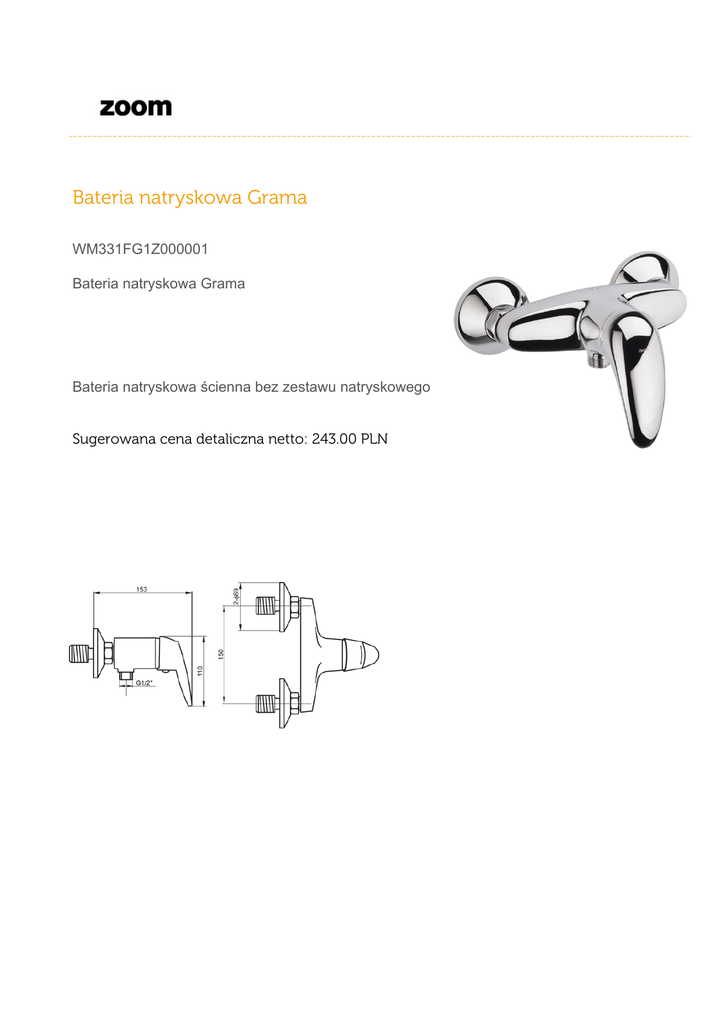 Bateria natryskowa Grama WM331FG1Z000001 Bateria natryskowa Grama Bateria natryskowa ścienna bez zestawu natryskowego Sugerowana cena detaliczna netto: 243.00 PLN