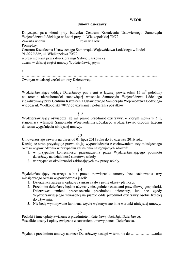 WZÓR Umowa dzierżawy Dotycząca pasa ziemi przy budynku Centrum Kształcenia Ustawicznego Samorządu Województwa Łódzkiego w Łodzi przy ul. Wielkopolskiej 70/72 Zawarta w dniu………………………..roku w Łodzi Pomiędzy: Centrum Kształcenia Ustawicznego Samorządu Województwa Łódzkiego w Łodzi 91-029 Łódź, ul. Wielkopolska 70/72 reprezentowaną przez dyrektora mgr Sylwię Laskowską zwana w dalszej części umowy Wydzierżawiającym a: ……………………………………………………………………………………………….. Zwanym w dalszej części umowy Dzierżawcą. §1 Wydzierżawiający oddaje Dzierżawcy pas ziemi o łącznej powierzchni 15 m 2 położony na terenie nieruchomości stanowiącej własność Samorządu Województwa Łódzkiego zlokalizowany przy Centrum Kształcenia Ustawicznego Samorządu Województwa Łódzkiego w Łodzi ul. Wielkopolska 70/72 do używania i pobierania pożytków. § 2 Wydzierżawiający oświadcza, że ma prawo przedmiot dzierżawy, o którym mowa w § 1, stanowiący własność Samorządu Województwa Łódzkiego wydzierżawiać osobom trzecim do czasu wygaśnięcia niniejszej umowy. §3 Umowa zostaje zawarta na okres od 01 lipca 2013 roku do 30 czerwca 2016 roku Każdej ze stron przysługuje prawo do jej wypowiedzenia z zachowaniem trzy miesięcznego okresu wypowiedzenia w przypadku zaistnienia następujących zdarzeń: 1. w przypadku konieczności przeznaczenia przez Wydzierżawiającego podmiotu dzierżawy na działalność statutową szkoły 2. w przypadku okoliczności zakłócających tok pracy szkoły. §4 Wydzierżawiający zastrzega sobie prawo rozwiązania umowy bez zachowania trzy miesięcznego okresu wypowiedzenia jeżeli: 1. Dzierżawca zalega w opłacie czynszu za dwa pełne okresy płatności, 2. Przedmiot dzierżawy będzie używany niezgodnie z zasadami prawidłowej gospodarki, Dzierżawca zmieni przeznaczenie przedmiotu dzierżawy, lub bez zgody Wydzierżawiającego wyrażonej na piśmie odda przedmiot dzierżawy osobie trzeciej do używania. 3. Nie będą wykonywane lub nienależycie wykonywane inne warunki niniejszej umowy. §5 Podatki i inne opłaty związane z przedmiotem dzierżawy obciążają Dzierżawcę. Wszelkie koszty i opłaty związane z zawarciem umowy ponosi Dzierżawca. §6 Wydanie przedmiotu umowy na rzecz Dzierżawcy nastąpi w terminie do ………………..roku §7 Dzierżawca, bez uprzedniej zgody Wydzierżawiającego wyrażonej na piśmie, nie może oddać przedmiotu dzierżawy innej osobie do używania ani go poddzierżawiać. §8 Po wygaśnięciu niniejszej umowy Dzierżawca zobowiązany jest niezwłocznie zwrócić przedmiot dzierżawy Wydzierżawiającemu w stanie nie pogorszonym z uwzględnieniem normalnego stopnia zużycia wynikającego z zasad prawidłowej gospodarki. §9 1. Strony ustalają czynsz dzierżawny w wysokości ……………..………….. zł brutto, słownie:……………………………………………………………………….. złotych 2. Czynsz dzierżawny jest płatny z góry do 10 dnia każdego miesiąca na rachunek bankowy Wydzierżawiającego w Banku PKO S.A. Łódź 63 1240 3419 1111 0010 4108 7986 Wydzierżawiający może podnieść wysokość czynszu dzierżawnego na dany rok kalendarzowy za pisemnym wypowiedzeniem, nie częściej jednak niż raz w roku i nie więcej niż wynosi wskaźnik wzrostu cen i usług za poprzedni rok kalendarzowy, podawany przez Główny Urząd Statystyczny. § 10 Dzierżawca wpłaci Wydzierżawiającemu kaucję (bez podatku Vat) na rachunek bankowy w Banku PKO S.A. Łódź Banku Pekao S.A. 73 1240 3419 1111 0010 4174 5466 w wysokości trzy krotnego czynszu tj. …………..…………………………….. zł słownie ……………………………………………………………………………..złotych Celem kaucji jest zabezpieczenie zapłaty należności, o których mowa w § 9 niniejszej umowy. Kwota zabezpieczenia podlega zwrotowi wraz z oprocentowaniem określonym poprzez zastosowanie stopy procentowej równej połowi stopy redyskonta weksli, stosowanej przez Narodowy Bank Polski z dnia wymagalności tej kwoty. § 11 Wszelkie zmiany umowy wymagają dla swej ważności formy pisemnej w postaci aneksu. Spory mogące wyniknąć w związku z realizacją niniejszej umowy rozstrzygać będzie sąd właściwy dla miejsca położenia dzierżawionej nieruchomości. § 12 W sprawach nieuregulowanych postanowieniami niniejszej umowy zastosowanie mają przepisy Kodeksu Cywilnego. § 13 Umowę sporządzono w dwóch jednobrzmiących egzemplarzach, po jednym dla każdej ze stron. ........................................ Wydzierżawiający ....................................... Dzierżawca
