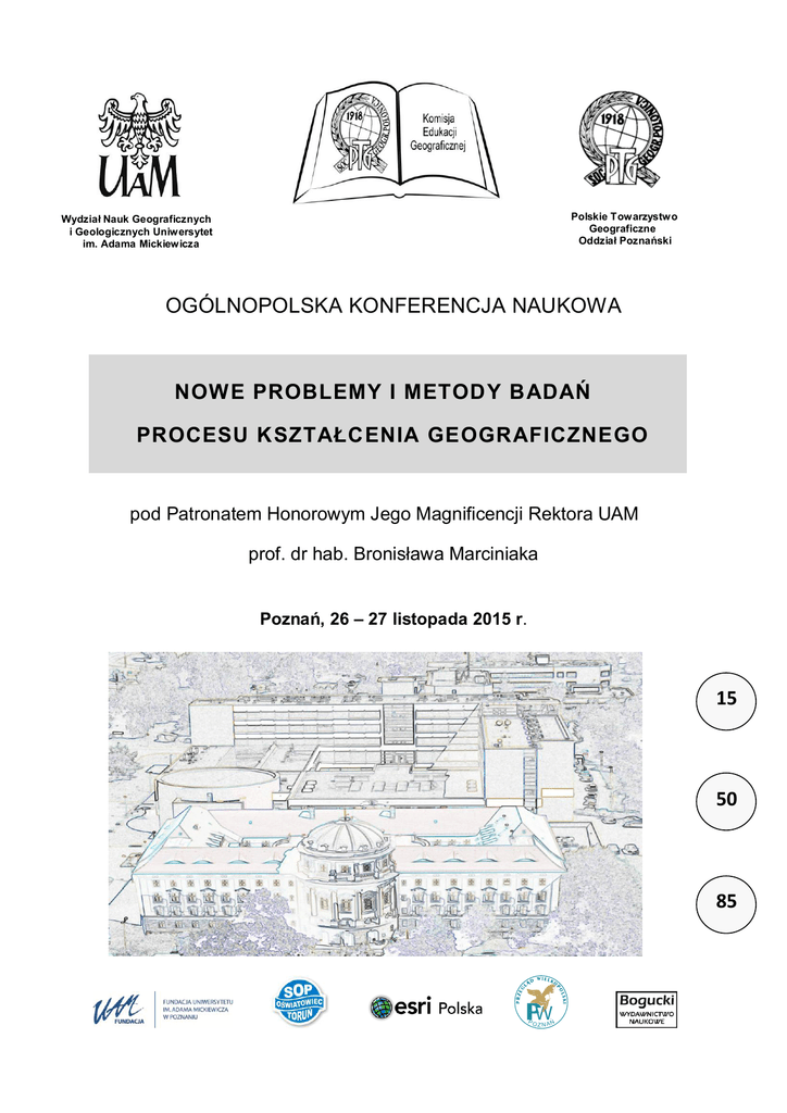 Polskie Towarzystwo Geograficzne Oddział Poznański Wydział Nauk Geograficznych i Geologicznych Uniwersytet im. Adama Mickiewicza OGÓLNOPOLSKA KONFERENCJA NAUKOWA NOW E PROBLEMY I METODY BADAŃ PROCESU KSZTAŁCENIA GEOGRAFICZNEGO pod Patronatem Honorowym Jego Magnificencji Rektora UAM prof. dr hab. Bronisława Marciniaka Poznań, 26 – 27 listopada 2015 r. 15 50 85 W PO ZNAŃ PROGRAM Czwartek, 26. 11. 2015 r. Obrady odbywają się na Wydziale Nauk Geograficznych i Geologicznych Uniwersytetu im. Adama Mickiewicza w Poznaniu, w Auli im. prof. B. Krygowskiego 8:30 – 9:30 Rejestracja uczestników (hol przy Auli prof. B. Krygowskiego) 9:30 – 9:50 Uroczyste otwarcie Konferencji Jubileuszowa Sesja Plenarna z okazji 85-lecia Dydaktyki Geografii na Wydziale Nauk Geograficznych i Geologicznych UAM w Poznaniu, 50-lecia utworzenia Zakładu Metodyki Geografii oraz 15-lecia powstania Pracowni Dydaktyki Geografii i Edukacji Ekologicznej powitanie uczestników, wystąpienia okolicznościowe 9:50 – 10:05 prof. UAM dr hab. Iwona Piotrowska, dr Małgorzata Cichoń (Uniwersytet im. Adama Mickiewicza w Poznaniu) Dydaktyka geografii w Poznaniu – od tradycji do współczesności 10:05 – 10:25 prof. dr hab. Andrzej Kostrzewski (Uniwersytet im. Adama Mickiewicza w Poznaniu) Geografia w systemie nauki – funkcja naukowa i dydaktyczna 10:25 – 10:45 prof. dr hab. Wojciech Stankowski (Uniwersytet im. Adama Mickiewicza w Poznaniu) Dynamika globu ziemskiego w interakcyjnym nauczaniu geografii 10:45 – 11:05 prof. dr hab. Tadeusz Stryjakiewicz (Uniwersytet im. Adama Mickiewicza w Poznaniu) Nowe problemy geografii człowieka w międzynarodowych projektach badawczych realizowanych w ośrodku poznańskim 11:05 – 11:45 Przerwa kawowa Sesja 1 (przewodniczenie prof. dr hab. Wojciech Stankowski) 11:45 – 12:00 prof. dr hab. Florian Plit (Uniwersytet Jana Kochanowskiego, Kielce) O jakości badań ankietowych w dydaktyce geografii 12:00 – 12:15 prof. UŁ dr hab. Elżbieta Szkurłat (Uniwersytet Łódzki) Metodologia badań jakościowych w dydaktyce geografii zorientowanej humanistycznie 12:15 – 12:30 dr Danuta Piróg (Uniwersytet Pedagogiczny, Kraków) Nowoczesne badania procesu kształcenia geograficznego: prymat metod jakościowych czy ilościowych? 12:30 – 12:45 prof. UG dr hab. Maria Groenwald (Uniwersytet Gdański) Odpowiedzialność za decyzje podejmowane przez badacza edukacji geograficznej 12:45 – 13:15 Dyskusja Panelowa Paneliści: prof. UŁ dr hab. Elżbieta Szkurłat, prof. UG dr hab. Maria Greonwald, prof. dr hab. Florian Plit, dr Danuta Piróg 13:15 – 14:15 Przerwa obiadowa (hol przy Auli prof. B. Krygowskiego) Sesja 2 (przewodniczenie prof. UŁ dr hab. Elżbieta Szkurłat) 14:15 – 14:30 dr hab. Joanna Angiel (Uniwersytet Warszawski) Metoda krajoznawcza Gustawa Wuttkego - refleksje oraz porównania z renesansowym oraz współczesnym kontekstem 14:30 – 14:45 prof. UAM dr hab. Makohonienko (Uniwersytet im. Adama Mickiewicza w Poznaniu) Geopark Morasko - projekt na rzecz społeczeństwa, regionu i nauki 14:45 – 15:00 dr Joanna Szczęsna (Uniwersytet im. Marii Curie-Skłodowskiej, Lublin) Nowe wyzwania kształcenia geograficznego – edukacja dla turystyki 15:00 – 15:15 dr Arkadiusz Głowacz (Uniwersytet Łódzki) „Obywatelstwo przestrzenne” – nowa koncepcja i problem badawczy w dydaktyce geografii? 15:15 – 15:30 15:30 – 15:45 Dyskusja Przerwa kawowa Sesja 3 (przewodniczenie prof. dr hab. Florian Plit) 15:45 – 16:00 mgr Jakub Sypniewski (Prywatna Szkoła Podstawowa Gaudium et Studium, Poznań) W roli „naucznia” geografii na lekcjach przyrody 16:00 – 16:15 prof. UP dr hab. Wiktor Osuch, lic. Remigiusz Pacyna (Uniwersytet Pedagogiczny, Kraków) Rola nowoczesnych środków dydaktycznych kształceniu geograficznym w gimnazjum 16:15 – 16:30 w skutecznym mgr Wojciech Wiecki (I Liceum Ogólnokształcące, Poznań) Edukacyjne korzyści grywalizacji 16:30 – 16:45 dr Lucyna Przybylska (Uniwersytet Gdański) Dlaczego (nie) zapisałeś się na tutoring? Motywy (nie) zaangażowania w nową ofertę dydaktyczną studentów geografii Uniwersytetu Gdańskiego 16:45 – 17:00 Dyskusja 17:00 – 17:20 Przerwa kawowa 17:00 – 17:20 Sesja Posterowa (hol przy Auli prof. B. Krygowskiego) mgr Edyta Bąkowska (Uniwersytet im. Adama Mickiewicza w Poznaniu) Zastosowanie metody projektu w szkole ponadgimnazjalnej w procesie kształtowania przestrzeni publicznej mgr inż. Agnieszka Błasiak (Uniwersytet Przyrodniczy, Poznań) Edukacja przyrodniczo-leśna w II etapie nauczania na przykładzie PGL Lasy Państwowe dr Przemysław Charzyński, dr Marcin Świtoniak (Uniwersytet Mikołaja Kopernika, Toruń) Multimedialne bazy danych jako narzędzie w nauczaniu międzynarodowych klasyfikacji gleb - projekt FACES dr Małgorzata Cichoń, prof. UAM dr hab. Iwona Piotrowska (Uniwersytet im. Adama Mickiewicza w Poznaniu) Neurodydaktyka w procesie kształcenia geograficznego mgr Karolina Dudek-Rączka, mgr Natalia Łukasiewicz (Uniwersytet Warszawski) Obywatel Świata mgr Wojciech Ewertowski, mgr Łukasz Górski, mgr Tomasz Kurczaba, mgr Beata Latos, mgr Anna Warczachowska (Uniwersytet im. Adama Mickiewicza w Poznaniu) Studencka ekspedycja „GEOpraktyki: Edycja I – w peruwiańskiej dżungli” mgr Joanna Galas (Uniwersytet im. Adama Mickiewicza w Poznaniu) Pradziejowe kultury Niziny Węgierskiej i ich związek ze środowiskiem mgr Karolina Herodowicz (Uniwersytet im. Adama Mickiewicza w Poznaniu) Zastosowanie platformy Google Earth Engine w nauczaniu geografii do wizualizacji przemian środowiska przyrodniczego mgr Julia Kaczmarek-Khubnaia (Uniwersytet im. Adama Mickiewicza w Poznaniu) Potencjał edukacyjny rezerwatu Sataplia mgr Magdalena Kugiejko (Uniwersytet im. Adama Mickiewicza w Poznaniu) Destynacje ruchu turystycznego szkół aglomeracji poznańskiej mgr Katarzyna Kujakało (Uniwersytet im. Adama Mickiewicza w Poznaniu) Paleoekologia torfowisk jako źródło informacji o przemianach środow
