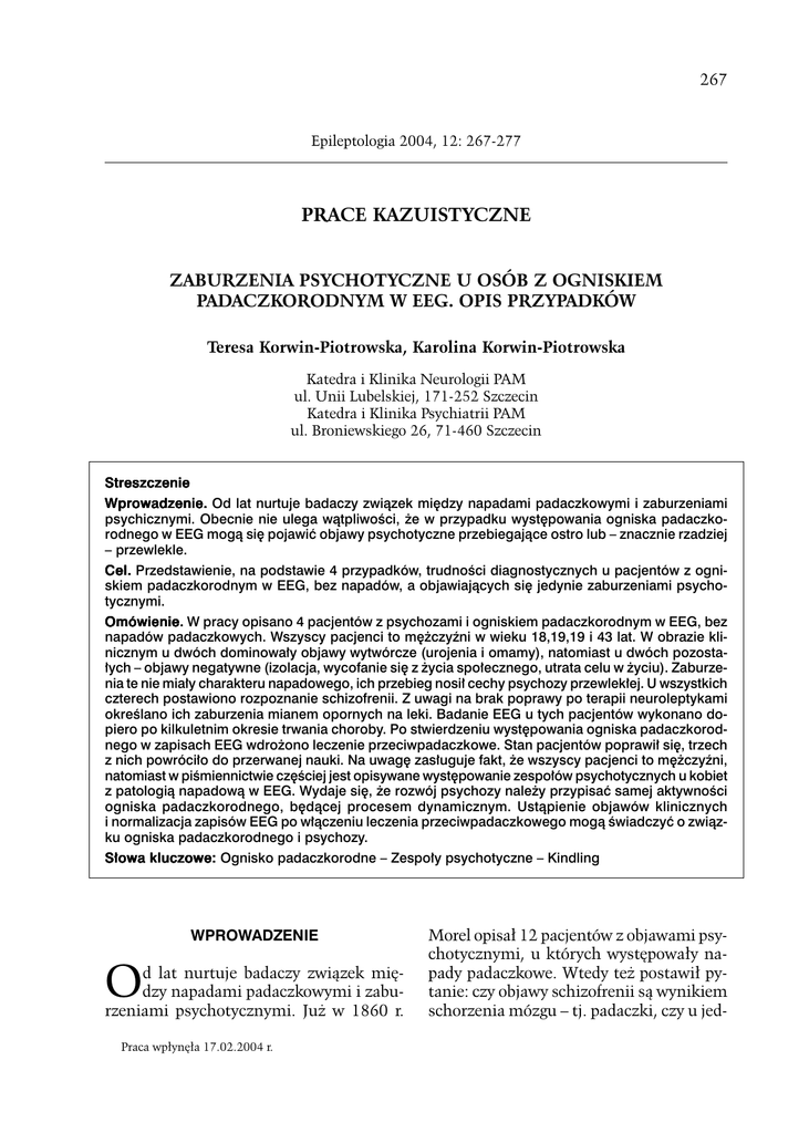 267 Epileptologia 2004, 12: 267-277 PRACE KAZUISTYCZNE ZABURZENIA PSYCHOTYCZNE U OSÓB Z OGNISKIEM PADACZKORODNYM W EEG. OPIS PRZYPADKÓW Teresa Korwin-Piotrowska, Karolina Korwin-Piotrowska Katedra i Klinika Neurologii PAM ul. Unii Lubelskiej, 171-252 Szczecin Katedra i Klinika Psychiatrii PAM ul. Broniewskiego 26, 71-460 Szczecin Streszczenie Wprowadzenie. Od lat nurtuje badaczy związek między napadami padaczkowymi i zaburzeniami psychicznymi. Obecnie nie ulega wątpliwości, że w przypadku występowania ogniska padaczkorodnego w EEG mogą się pojawić objawy psychotyczne przebiegające ostro lub – znacznie rzadziej – przewlekle. Cel. Przedstawienie, na podstawie 4 przypadków, trudności diagnostycznych u pacjentów z ogniskiem padaczkorodnym w EEG, bez napadów, a objawiających się jedynie zaburzeniami psychotycznymi. Omówienie. W pracy opisano 4 pacjentów z psychozami i ogniskiem padaczkorodnym w EEG, bez napadów padaczkowych. Wszyscy pacjenci to mężczyźni w wieku 18,19,19 i 43 lat. W obrazie klinicznym u dwóch dominowały objawy wytwórcze (urojenia i omamy), natomiast u dwóch pozostałych – objawy negatywne (izolacja, wycofanie się z życia społecznego, utrata celu w życiu). Zaburzenia te nie miały charakteru napadowego, ich przebieg nosił cechy psychozy przewlekłej. U wszystkich czterech postawiono rozpoznanie schizofrenii. Z uwagi na brak poprawy po terapii neuroleptykami określano ich zaburzenia mianem opornych na leki. Badanie EEG u tych pacjentów wykonano dopiero po kilkuletnim okresie trwania choroby. Po stwierdzeniu występowania ogniska padaczkorodnego w zapisach EEG wdrożono leczenie przeciwpadaczkowe. Stan pacjentów poprawił się, trzech z nich powróciło do przerwanej nauki. Na uwagę zasługuje fakt, że wszyscy pacjenci to mężczyźni, natomiast w piśmiennictwie częściej jest opisywane występowanie zespołów psychotycznych u kobiet z patologią napadową w EEG. Wydaje się, że rozwój psychozy należy przypisać samej aktywności ogniska padaczkorodnego, będącej procesem dynamicznym. Ustąpienie objawów klinicznych i normalizacja zapisów EEG po włączeniu leczenia przeciwpadaczkowego mogą świadczyć o związku ogniska padaczkorodnego i psychozy. Słowa kluczowe: Ognisko padaczkorodne – Zespoły psychotyczne – Kindling WPROWADZENIE O d lat nurtuje badaczy związek między napadami padaczkowymi i zaburzeniami psychotycznymi. Już w 1860 r. Praca wpłynęła 17.02.2004 r. Morel opisał 12 pacjentów z objawami psychotycznymi, u których występowały napady padaczkowe. Wtedy też postawił pytanie: czy objawy schizofrenii są wynikiem schorzenia mózgu – tj. padaczki, czy u jed-