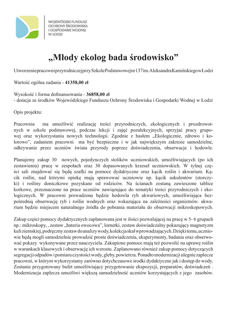 „Młody ekolog bada środowisko” Utworzenie pracowni przyrodniczej przy Szkole Podstawowej nr 137 im.Aleksandra Kamińskiego w Łodzi Wartość ogólna zadania - 41358,00 zł Wysokość i forma dofinansowania - 36858,00 zł - dotacja ze środków Wojewódzkiego Funduszu Ochrony Środowiska i Gospodarki Wodnej w Łodzi Opis projektu: Pracownia ma umożliwić realizację treści przyrodniczych, ekologicznych i prozdrowotnych w szkole podstawowej, podczas lekcji i zajęć pozalekcyjnych, sprzyjać pracy grupowej oraz wykorzystaniu nowych technologii. Zgodnie z hasłem „Ekologicznie, zdrowo i kolorowo”, zadaniem pracowni ma być bezpieczne i w jak największym zakresie samodzielne, odkrywanie przez uczniów świata przyrody poprzez doświadczenia, obserwacje i hodowle. Planujemy zakup 30 nowych, pojedynczych stolików uczniowskich, umożliwiających (po ich zestawieniu) pracę w zespołach oraz 30 dopasowanych krzeseł uczniowskich. W tylnej części sali znajdować się będą szafki na pomoce dydaktyczne oraz kącik roślin i akwarium. Kącik roślin, nad którymi opiekę mają sprawować uczniowie np. kącik sukulentów (storczyki) i rośliny doniczkowe pozyskane od rodziców. Na ścianach zostaną zawieszone tablice korkowe, przeznaczone na prace uczniów nawiązujące do tematyki treści przyrodniczych i ekologicznych. W pracowni prowadzona będzie hodowla ryb akwariowych, umożliwiająca bezpośrednią obserwację ryb i roślin wodnych oraz wskazująca na zależności organizmów. akwarium będzie miejscem naturalnego źródła do pobrania materiału do obserwacji mikroskopowych. Zakup części pomocy dydaktycznych zaplanowana jest w ilości pozwalającej na pracę w 5- 6 grupach np.: mikroskopy, , zestaw „bateria owocowa”, lornetki, zestaw doświadczalny pokazujący magnetyzm kuli ziemskiej, podręczny zestaw do analizy wody, kolekcja skał wprowadzających. Dzięki temu, uczniowie będą mogli samodzielnie prowadzić proste doświadczenia, eksperymenty, badania oraz obserwować pokazy wykonywane przez nauczyciela. Zakupione pomoce mają też pozwolić na uprawę roślin w warunkach klasowych i obserwację ich wzrostu. Zaplanowano również zakup pomocy dotyczących segregacji odpadów i pomiaru czystości wody, gleby, powietrza. Ponadto modernizacji ulegnie zaplecze pracowni, w którym wykorzystamy zarówno dotychczasowe środki dydaktyczne jak i dostęp do wody. Zostanie przygotowany bufet umożliwiający przygotowanie ekspozycji, preparatów, doświadczeń . Modernizacja zaplecza umożliwi większą samodzielność uczniów korzystających z jego zasobów.