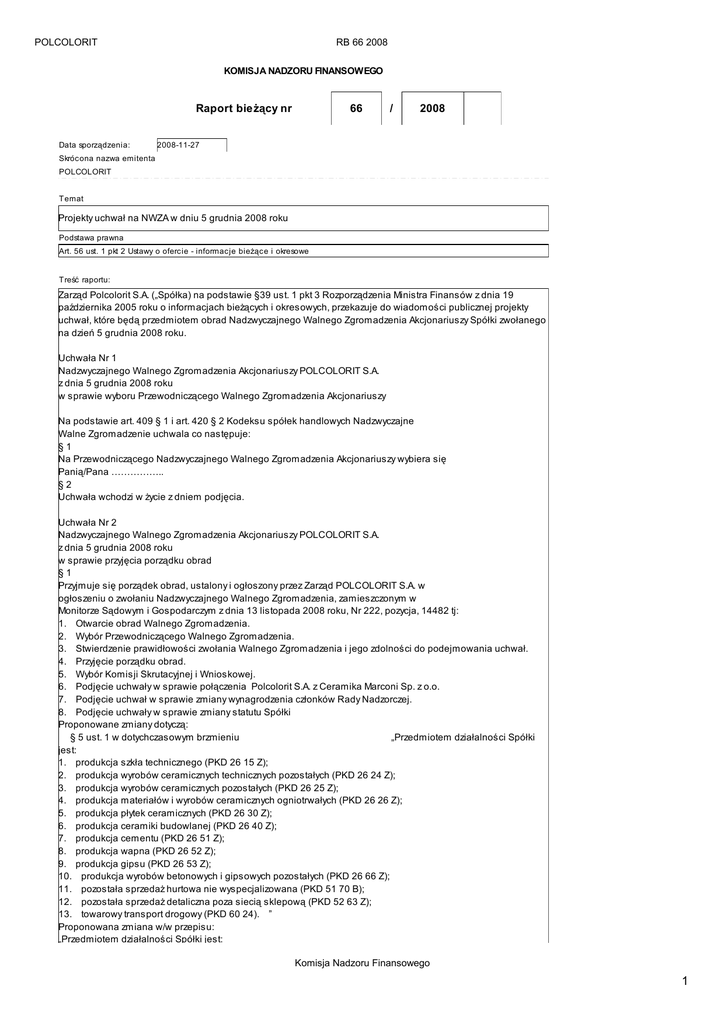 Raport 66 projekty uchwał na NWZA dnia 27.11.2008