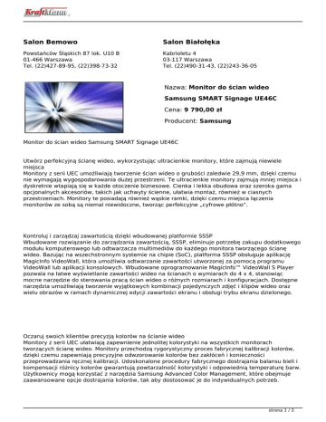 Salon Bemowo Salon Białołęka Powstańców Śląskich 87 lok. U10 B 01-466 Warszawa Tel. (22)427-89-95, (22)398-73-32 Kabrioletu 4 03-117 Warszawa Tel. (22)490-31-43, (22)243-36-05 Nazwa: Monitor do ścian wideo Samsung SMART Signage UE46C Cena: 9 790,00 zł Producent: Samsung Monitor do ścian wideo Samsung SMART Signage UE46C Utwórz perfekcyjną ścianę wideo, wykorzystując ultracienkie monitory, które zajmują niewiele miejsca Monitory z serii UEC umożliwiają tworzenie ścian wideo o grubości zaledwie 29,9 mm, dzięki czemu nie wymagają wygospodarowania dużej przestrzeni. Te ultracienkie monitory zajmują mniej miejsca i dyskretnie wtapiają się w każde otoczenie biznesowe. Cienka i lekka obudowa oraz szeroka gama opcjonalnych akcesoriów, takich jak uchwyty ścienne, ułatwia montaż, również w ciasnych przestrzeniach. Monitory te posiadają również wąskie ramki, dzięki czemu miejsca łączenia monitorów ze sobą są niemal niewidoczne, tworząc perfekcyjne „cyfrowe płótno”. Kontroluj i zarządzaj zawartością dzięki wbudowanej platformie SSSP Wbudowane rozwiązanie do zarządzania zawartością, SSSP, eliminuje potrzebę zakupu dodatkowego modułu komputerowego lub odtwarzacza multimediów do każdego monitora tworzącego ścianę wideo. Bazując na wszechstronnym systemie na chipie (SoC), platforma SSSP obsługuje aplikację MagicInfo VideoWall, która umożliwia odtwarzanie zawartości utworzonej za pomocą programu VideoWall lub aplikacji konsolowych. Wbudowane oprogramowanie MagicInfo™ VideoWall S Player pozwala na łatwe wyświetlanie zawartości wideo na ścianach o wymiarach do 4 x 4, stanowiąc mocne narzędzie do sterowania pracą ścian wideo o różnych rozmiarach i konfiguracjach. Dostępne narzędzia umożliwiają tworzenie wyjątkowych kombinacji pojedynczych zdjęć i klipów wideo oraz wielu obrazów w ramach dynamicznej edycji zawartości ekranu i obsługi trybu ekranu dzielonego. Oczaruj swoich klientów precyzją kolorów na ścianie wideo Monitory z serii UEC ułatwiają zapewnienie jednolitej kolorystyki na wszystkich monitorach tworzących ścianę wideo. Monitory przechodzą rygorystyczny proces fabrycznej kalibracji kolorów, dzięki czemu zapewniają precyzyjne odwzorowanie kolorów bez zakłóceń i konieczności przeprowadzania ręcznej kalibracji. Udoskonalone procedury fabrycznego dostrajania balansu bieli i kompensacji różnicy kolorów gwarantują powtarzalność kolorystyki i odpowiednią temperaturę barw. Użytkownicy mogą korzystać z narzędzia Samsung Advanced Color Management, które obejmuje zaawansowane opcje dostrajania kolorów, tak aby dostosować je do indywidualnych potrzeb. strona 1 / 3 Jaskrawość kolorów można kalibrować automatycznie lub ręcznie. Ustawienia kolorów można udostępniać pomiędzy monitorami, uzyskując wyjątkową intensywność barw na całej ścianie wideo i oszałamiający efekt wśród oglądających. Optymalne wyświetlanie zawartości dzięki prostej funkcji obracania obrazu Niezależnie od tego, czy korzystasz z jednego monitora, czy ze ściany wideo, możesz tworzyć zawartość w trybie portretu lub pejzażu – a następnie zmienić orientację obrazu. Monitory Samsung z serii UEC posiadają możliwość obrotu wyświetlacza oraz funkcję obracania obrazu, która umożliwia pionowe lub poziome wyświetlanie zawartości bez zaburzania proporcji. Można wygodnie i precyzyjnie zmieniać orientację obrazu w ramach trzech opcji: proporcje oryginalne na pojedynczym monitorze, automatyczne dopasowanie do pojedynczego monitora lub automatyczne dopasowanie do pełnej ściany wideo. Łączenie kilku monitorów bez konieczności zakupu dodatkowego sprzętu Utrzymuj jakość obrazu na małą skalę lub, aby uzyskać maksymalny efekt, twórz ściany wideo złożone nawet ze 100 monitorów. Korzystając z łącza Display Port (DP) 1.2, firmy mogą wyświetlać żądaną zawartość w standardzie ultra high definition (UHD) 3 840 x 2 160 na ścianach wideo 2 x 2 bez dodatkowego osprzętu. Technologia High-bandwidth Digital Content Protection (HDCP) umożliwia tworzenie pętli łączności pomiędzy monitorami z serii UDC, pomagając obniżyć koszty wdrożenia większej liczby monitorów. Dzięki obsłudze HDCP możliwe jest odtwarzanie zawartości za pośrednictwem LiveTV®, odczyt płyt Blu-Ray Disc™ oraz korzystanie z innej zawartości HDCP bez konieczności zakupu dodatkowego dystrybutora sygnału. Funkcja Magic Clone Funkcja Samsung Magic Clone umożliwia łatwe stosowanie tych samych ustawień w monitorach znajdujących się w różnych lokalizacjach. Funkcja ta eliminuje konieczność oddzielnej konfiguracji każdego monitora. Wystarczy zaprogramować głośność, jasność i inne parametry w jednym monitorze. Po dokonaniu aktualizacji ustawień urządzenia wystarczy zapisać konfigurację w pamięci USB lub na dysku zewnętrznym. Następnie podłącz pamięć USB lub dysk zewnętrzny do kolejnego monitora, aby skopiować ustawienia. Doskonała jakość obrazu Zapewnij swoim klientom wciągające doznania za sprawą oszałamiającej jakości obrazu na monitorach Samsung. Wyjątkowo wyrazisty panel umożliwia wyświetlanie bardziej wyraźnego obrazu, co poprawia widoczność wyświetlanej zawartości. Nowe rozwiązanie przyciemniania podświetlenia, opracowane przez firmę Samsung, zwiększa dynamizm obrazu i zapewnia lepszą jakość kolorów oraz głębsze odcienie czerni, które zwiększają kontrast. Głębsze odcienie czerni generowane są poprzez specjalne sterowanie podświetleniem diodowym, co przyczynia się również do zmniejszenia poboru energii. strona 2 / 3 strona 3 / 3 Powered by TCPDF (www.tcpdf.org)
