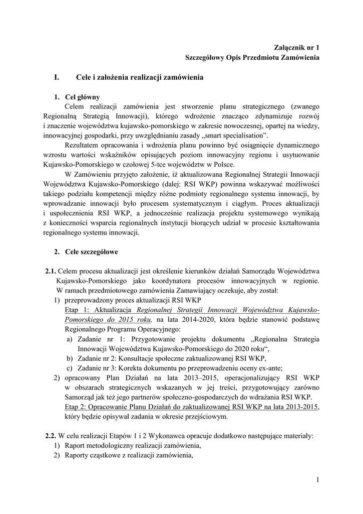 Załącznik nr 1 Szczegółowy Opis Przedmiotu Zamówienia I. Cele i założenia realizacji zamówienia 1. Cel główny Celem realizacji zamówienia jest stworzenie planu strategicznego (zwanego Regionalną Strategią Innowacji), którego wdrożenie znacząco zdynamizuje rozwój i znaczenie województwa kujawsko-pomorskiego w zakresie nowoczesnej, opartej na wiedzy, innowacyjnej gospodarki, przy uwzględnianiu zasady „smart specialisation”. Rezultatem opracowania i wdrożenia planu powinno być osiągnięcie dynamicznego wzrostu wartości wskaźników opisujących poziom innowacyjny regionu i usytuowanie Kujawsko-Pomorskiego w czołowej 5-tce województw w Polsce. W Zamówieniu przyjęto założenie, iż aktualizowana Regionalnej Strategii Innowacji Województwa Kujawsko-Pomorskiego (dalej: RSI WKP) powinna wskazywać możliwości takiego podziału kompetencji między różne podmioty regionalnego systemu innowacji, by wprowadzanie innowacji było procesem systematycznym i ciągłym. Proces aktualizacji i uspołecznienia RSI WKP, a jednocześnie realizacja projektu systemowego wynikają z konieczności wsparcia regionalnych instytucji biorących udział w procesie kształtowania regionalnego systemu innowacji. 2. Cele szczegółowe 2.1. Celem procesu aktualizacji jest określenie kierunków działań Samorządu Województwa Kujawsko-Pomorskiego jako koordynatora procesów innowacyjnych w regionie. W ramach przedmiotowego zamówienia Zamawiający oczekuje, aby został: 1) przeprowadzony proces aktualizacji RSI WKP Etap 1: Aktualizacja Regionalnej Strategii Innowacji Województwa KujawskoPomorskiego do 2015 roku, na lata 2014-2020, która będzie stanowić podstawę Regionalnego Programu Operacyjnego: a) Zadanie nr 1: Przygotowanie projektu dokumentu „Regionalna Strategia Innowacji Województwa Kujawsko-Pomorskiego do 2020 roku“, b) Zadanie nr 2: Konsultacje społeczne zaktualizowanej RSI WKP, c) Zadanie nr 3: Korekta dokumentu po przeprowadzeniu oceny ex-ante; 2) opracowany Plan Działań na lata 2013–2015, operacjonalizujący RSI WKP w obszarach strategicznych wskazanych w jej treści, przygotowujący zarówno Samorząd jak też jego partnerów społeczno-gospodarczych do wdrażania RSI WKP. Etap 2: Opracowanie Planu Działań do zaktualizowanej RSI WKP na lata 2013-2015, który będzie opisywał zadania w okresie przejściowym. 2.2. W celu realizacji Etapów 1 i 2 Wykonawca opracuje dodatkowo następujące materiały: 1) Raport metodologiczny realizacji zamówienia, 2) Raporty cząstkowe z realizacji zamówienia, 1 3) Raport ewaluacyjny ex post „Regionalnej Strategii Innowacji Województwa Kujawsko-Pomorskiego do 2015 roku“, 4) Sprawozdania z przebiegu i wyników konsultacji przeprowadzonych z KujawskoPomorską Radą Innowacji i Zespołem ekspertów ds. polityki innowacyjnej i badawczo-rozwojowej, 5) Sprawozdanie z przebiegu i wyników konsultacji projektu RSI WKP z jednostkami samorządu terytorialnego oraz partnerami społecznymi i gospodarczymi, 6) Podsumowanie raportu ewaluacyjnego ex ante zawierającego ustosunkowanie się do uwag wraz z uzasadnieniem, 7) Raport końcowy aktualizacji RSI WKP. 2.3. Zamówienie obejmuje wykonanie wszelkich prac analitycznych, koncepcyjnych, organizacyjnych i redakcyjnych prowadzących do opracowania ww. dokumentów. II. Zakres zamówienia 1. Etap 1: Aktualizacja Regionalnej Strategii Innowacji Województwa KujawskoPomorskiego do 2015 roku W ramach realizacji etapu 1 do zadań wykonawcy należy: 1.1. Zadanie nr 1 - Przygotowanie projektu dokumentu „Regionalna Strategia Innowacji Województwa Kujawsko-Pomorskiego do 2020 roku“ Zadanie to polega na przeprowadzeniu procesu aktualizacji obecnej wersji Regionalnej Strategii Innowacji Województwa Kujawsko-Pomorskiego jako programu rozwoju w oparciu o wymogi stawiane tego typu dokumentom w ustawie z dnia 6 grudnia 2006 r. o zasadach prowadzenia polityki rozwoju (Dz. U. z 2009 r. Nr 84, poz. 712 z późń. zm.), w Zarządzeniu nr 7/2011 Marszałka Województwa Kujawsko-Pomorskiego z dnia 21 marca 2011 r. w sprawie „Ramowej procedury sporządzania programu rozwoju”. W ramach tego zadania Wykonawca zobowiązany jest do wykonania poniższych czynności: 1.1.1. Zapoznanie się z następującymi opracowaniami: 1) Obowiązującą Regionalną Strategią Innowacji Województwa KujawskoPomorskiego do 2015 roku, przyjętą Uchwałą Nr XLI/587/05 Sejmiku Województwa Kujawsko-Pomorskiego z dnia 12 grudnia 2005 roku w sprawie Regionalnej Strategii Innowacji Województwa Kujawsko-Pomorskiego do 2015 roku, 2) Projektem Regionalnej Strategii Innowacji dla Regionu Kujawsko Pomorskiego KUJPOMRIS opracowanym w ramach 6. Programu Ramowego Unii Europejskiej, 2 3) Raportami z badań przeprowadzonych w ramach projektów 8.2.2. PO KL pn. „Regionalny Ośrodek Rozwoju Innowacyjności i Społeczeństwa Informacyjnego” i „Centrum Zarządzania Regionalnym Systemem Innowacji”: a) Analiza zapotrzebowania na kapitał dla innowacji w regionie, b) Analiza powiązań współpracy pomiędzy przedsiębiorcami, jednostkami B+R i instytucjami otoczenia biznesu w województwie kujawsko– pomorskim, c) Badanie poziomu innowacji w podstawowych sektorach gospodarki regionu, d) Analiza sytuacji szkolnictwa wyższego w województwie kujawskopomorskim, e) Ocena zdolności instytutów badawczych do kreowania innowacji, f) Koncepcja funkcjonowania i koordynacji RSI w województwie kujawskopomorskim – praktyczny system obsługi sfery innowacji. Strategia rozwoju Regionalnego Ośrodka Rozwoju Innowacyjności i Społeczeństwa Informacyjnego, g) Badania i diagnoza postaw proinnowacyjnych i zdolności do myślenia proinnowacyjnego różnych środowisk społecznych i zawodowych województwa kujawsko-pomorskiego, h) Projekt zawiązania „klastrów branżowych” w regionie, w innowacyjnych dziedzinach gospodarki, i) Opracowanie koncepcji systemu finansowania innowacji w województwie kujawsko-pomorskim, j) Opracowanie uniwers