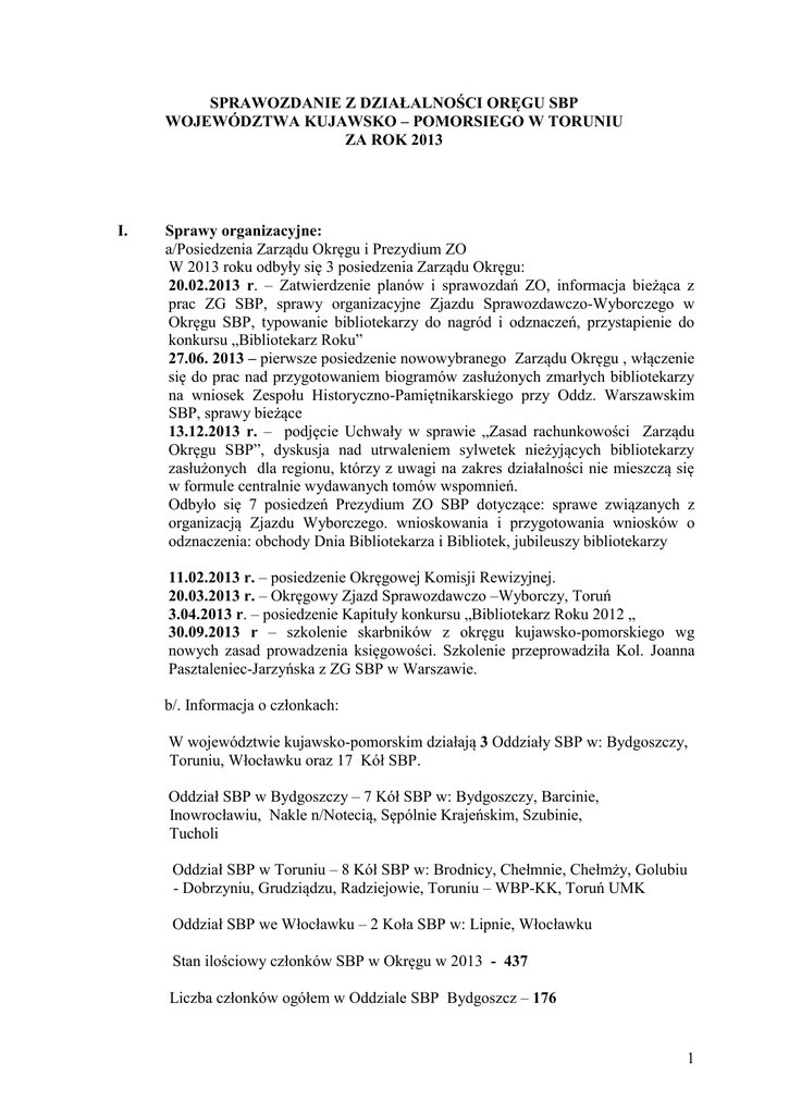 SPRAWOZDANIE Z DZIAŁALNOŚCI ORĘGU SBP WOJEWÓDZTWA KUJAWSKO – POMORSIEGO W TORUNIU ZA ROK 2013 I. Sprawy organizacyjne: a/Posiedzenia Zarządu Okręgu i Prezydium ZO W 2013 roku odbyły się 3 posiedzenia Zarządu Okręgu: 20.02.2013 r. – Zatwierdzenie planów i sprawozdań ZO, informacja bieżąca z prac ZG SBP, sprawy organizacyjne Zjazdu Sprawozdawczo-Wyborczego w Okręgu SBP, typowanie bibliotekarzy do nagród i odznaczeń, przystapienie do konkursu „Bibliotekarz Roku” 27.06. 2013 – pierwsze posiedzenie nowowybranego Zarządu Okręgu , włączenie się do prac nad przygotowaniem biogramów zasłużonych zmarłych bibliotekarzy na wniosek Zespołu Historyczno-Pamiętnikarskiego przy Oddz. Warszawskim SBP, sprawy bieżące 13.12.2013 r. – podjęcie Uchwały w sprawie „Zasad rachunkowości Zarządu Okręgu SBP”, dyskusja nad utrwaleniem sylwetek nieżyjących bibliotekarzy zasłużonych dla regionu, którzy z uwagi na zakres działalności nie mieszczą się w formule centralnie wydawanych tomów wspomnień. Odbyło się 7 posiedzeń Prezydium ZO SBP dotyczące: sprawe związanych z organizacją Zjazdu Wyborczego. wnioskowania i przygotowania wniosków o odznaczenia: obchody Dnia Bibliotekarza i Bibliotek, jubileuszy bibliotekarzy 11.02.2013 r. – posiedzenie Okręgowej Komisji Rewizyjnej. 20.03.2013 r. – Okręgowy Zjazd Sprawozdawczo –Wyborczy, Toruń 3.04.2013 r. – posiedzenie Kapituły konkursu „Bibliotekarz Roku 2012 „ 30.09.2013 r – szkolenie skarbników z okręgu kujawsko-pomorskiego wg nowych zasad prowadzenia księgowości. Szkolenie przeprowadziła Kol. Joanna Pasztaleniec-Jarzyńska z ZG SBP w Warszawie. b/. Informacja o członkach: W województwie kujawsko-pomorskim działają 3 Oddziały SBP w: Bydgoszczy, Toruniu, Włocławku oraz 17 Kół SBP. Oddział SBP w Bydgoszczy – 7 Kół SBP w: Bydgoszczy, Barcinie, Inowrocławiu, Nakle n/Notecią, Sępólnie Krajeńskim, Szubinie, Tucholi Oddział SBP w Toruniu – 8 Kół SBP w: Brodnicy, Chełmnie, Chełmży, Golubiu - Dobrzyniu, Grudziądzu, Radziejowie, Toruniu – WBP-KK, Toruń UMK Oddział SBP we Włocławku – 2 Koła SBP w: Lipnie, Włocławku Stan ilościowy członków SBP w Okręgu w 2013 - 437 Liczba członków ogółem w Oddziale SBP Bydgoszcz – 176 1 Koło Barcin Koło Bydgoszcz Koło Inowrocław Koło Nakło Koło Sępólno Kraj. Koło Szubin Koło Tuchola - 14 - 77 - 35 - 10 - 18 - 11 - 11 Liczba członków ogółem w Oddziale SBP Toruń – 200 Koło Brodnica - 20 Koło Chełmno - 18 Koło Chełmża - 36 Koło Golub-Dobrzyń - 12 Koło Grudziądz - 22 Koło Radziejów - 22 Toruń –WBP-KK - 38 Toruń UMK - 32 Liczba członków ogółem w Oddziale SBP Włocławek – 61 Koło Lipno -14 Koło Włocławek - 47 Zarząd Oddziału SBP w Bydgoszczy: Przewodnicząca Zarządu Oddziału SBP w Bydgoszczy Danuta Kaczmarek bierze udział od 2010 r. w pracach Zespołu ds. badania efektywności bibliotek publicznych i pedagogicznych powołanego przez Zarząd Główny Stowarzyszenia Bibliotekarzy Polskich Kapituła Okręgu Stowarzyszenia Bibliotekarzy Polskich w Toruniu, przyznała tytuł Kujawsko-Pomorskiego Bibliotekarza Roku 2013 Grażynie Szafraniak – Dyrektorowi BPMiG w Barcinie. 6.11.2013 – Uroczyste otwarcie nowego budynku biblioteki w Barcinie . Otwarcie odbyło się w stylu pałuckim. W części artystycznej wystąpiły dzieci z Klubu Czytających Rodzin, Zespół Teatralny z Gimnazjum nr 1 i Społecznego Liceum w Barcinie oraz Kapela „Pałuki”. Bibliotekarki przygotowały prezentację multimedialną „Biblioteczną ścieżką – 66 lat Biblioteki w Barcinie” wystawy oraz folder obrazujący działalność biblioteki. W spotkaniu uczestniczył m. in. Wicewojewoda Kujawsko-Pomorski Zbigniew Ostrowski, władze powiatu i gminy, dyrektor WiMBP w Bydgoszczy, przewodnicząca Oddziału Bydgoskiego SBP Danuta Kaczmarek, bibliotekarze z zaprzyjaźnionych placówek, przedstawiciele współpracujących z biblioteką instytucji, stowarzyszeń i organizacji. Zarząd Oddziału SBP w Toruniu: W minionym roku Zarząd oddziału Toruń obradował 3 razy. Pierwsze spotkanie odbyło się w Książnicy Kopernikańskiej i miało charakter organizacyjny, w związku ze zmianami składu zarządu po wyborach. Drugie posiedzenie odbyło się czerwcu w Bibliotece Pedagogicznej i dotyczyło sprawozdania z Krajowego Zjazdu SBP. Na to spotkanie zaproszono też wszystkich przewodniczących kół z terenu oddziału, aby mogli zaprezentować swoje osiągnięcia i zapoznać się z wytycznym krajowego zjazdu. Ostatnie spotkanie w listopadzie odbyło się w Ośrodku Czytelnictwa Chorych i Niepełnosprawnych w Toruniu i miało na celu przygotowanie świątecznego spotkania dla 2 emerytów z naszego oddziału i podsumowanie rocznej pracy. W tym posiedzeniu wzięła udział Pani Aleksandra Kurek dyrektor MiPBP w Wąbrzeźnie. Jest to inicjatywa Zarządu Oddziału w Toruniu w celu podjęcia próby reaktywowania koła SBP w Wąbrzeźnie. Przy okazji tych spotkań zwiedzaliśmy placówki, w których odbywały się posiedzenia i zapoznawaliśmy się ze specyfiką pracy w tych bibliotekach. Przez cały rok zostały uporządkowane sprawy z deklaracjami i legitymacjami członkowskimi. Skarbnik oddziału poinformował wszystkie koła o zasadzie wpłacania składek na konto oddziałowe. W ramach poznawania pracy poszczególnych kół do Brodnicy na spotkanie udały się Pani Regina Sakrajda i Katarzyna Rapior-Murawska. W minionym roku odbyły się remonty w kilku placówkach. Remontowane są magazyny Książnicy Kopernikańskiej w Toruniu. W MiPBP w Brodnicy utworzono dział Czytelnia dla dzieci i młodzieży, a także przeniesiono Filie nr 4 do nowego lokalu z większą powierzchnią użytkową oraz Filia w Grzybnie (BP w Bobrowie) uzyskała nowe pomieszczeni biblioteczne w budynku świetlicy wiejskiej. W MiPBP w Gołubiu-Dobrzyniu doczekała się przeprowadzki do nowej siedziby. Koleżanki z Koła w Gołubiu zwracają 