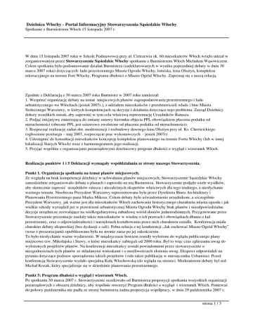 Dzielnica Włochy - Portal Informacyjny Stowarzyszenia Sąsiedzkie Włochy Spotkanie z Burmistrzem Włoch 15 listopada 2007 r. W dniu 15 listopada 2007 roku w Szkole Podstawowej przy ul. Cietrzewia ok. 60 mieszkańców Włoch wzięło udział w zorganizowanym przez Stowarzyszenie Sąsiedzkie Włochy spotkaniu z Burmistrzem Włoch Michałem Wąsowiczem. Celem spotkania było podsumowanie działań Burmistrza (zadeklarowanych w wyniku poprzedniej debaty w dniu 30 marca 2007 roku) dotyczących: ładu przestrzennego Miasta Ogrodu Włochy, lotniska, kina Olsztyn, kompleksu rekreacyjnego na terenie Fort Włochy, Programu dbałości o Miasto Ogród Włochy. Zapoznaj się z naszą relacją. Zgodnie z Deklaracją z 30 marca 2007 roku Burmistrz w 2007 roku zamierzał: 1. Wesprzeć organizację debaty na temat miejscowych planów zagospodarowania przestrzennego i ładu urbanistycznego we Włochach (jesień 2007r.), z udziałem mieszkańców i przedstawicieli władz i biur Miasta Stołecznego Warszawy, w których kompetencjach są decyzje i działania dotyczące tego problemu. Zarząd Dzielnicy dołoży wszelkich starań, aby zapewnić w tym celu właściwą reprezentację Urzędników Ratusza. 2. Podjąć inicjatywę zmierzającą do zmiany ustawy kierunku objęcia PPL obowiązkiem płacenia podatku od nieruchomości (obecnie PPL jest ustawowo zwolnione od płacenia podatku od nieruchomości); 3. Rozpocząć realizację zadań dot. modernizacji i rozbudowy dawnego kina Olsztyn przy ul. Ks. Chrościckiego (ogłoszenie przetargu – maj 2007, rozpoczęcie prac wykonawczych - jesień 2007r) 4. Udostępnić do konsultacji mieszkańców koncepcję kompleksu planowanego na terenie Fortu Włochy (lub w innej lokalizacji Starych Włoch) wraz z harmonogramem jego realizacji. 5. Przyjąć wspólnie z organizacjami pozarządowymi dzielnicowy program dbałości o wygląd i wizerunek Włoch. Realizacja punktów 1 i 5 Deklaracji wymagały współdziałania ze strony naszego Stowarzyszenia. Punkt 1. Organizacja spotkania na temat planów miejscowych. Ze względu na brak kompetencji dzielnicy w uchwalaniu planów miejscowych, Stowarzyszenie Sąsiedzkie Włochy samodzielnie zorganizowało debatę o planach i zaprosiło na nią Burmistrza. Stowarzyszenie podjęło wiele wysiłków, aby skutecznie zaprosić urzędników ratusza i niezależnych ekspertów właściwych dla tego trudnego, a niesłychanie ważnego tematu. Nieobecna Prezydent Warszawy reprezentowana była przez Dyrektora Biura Architektury i Planowania Przestrzennego pana Marka Mikosa. Celem debaty było uświadomienie urzędnikom, a szczególnie Prezydent Warszawy, jak ważne jest dla mieszkańców Włoch zachowanie historycznego charakteru miasta ogrodu i jak wielkie szkody wyrządził już w przestrzeni urbanistycznej Miasta Ogrodu Włochy brak planów i nieodpowiedzialne decyzje urzędnicze zezwalające na wielkogabarytową zabudowę wśród domów jednorodzinnych. Przygotowane przez Stowarzyszenie prezentacje zasilały także mieszkańców w wiedzę o ich prawach i obowiązkach dbania o ład przestrzenny, oraz o odpowiedzialności i narzędziach kształtowania przez nich charakteru osiedla. Konferencja miała charakter debaty eksperckiej (bez dyskusji z sali). Pełna relacja z tej konferencji „Jak zachować Miasto Ogród Włochy” (wraz z prezentacjami) opublikowana była na stronie zaraz po jej zakończeniu. To było niesłychanie ważne wydarzenie. W międzyczasie bowiem zostały wyłożone do wglądu publicznego plany miejscowe tzw. Mikołajska i Stawy, o które mieszkańcy zabiegali od 2000 roku. Był to więc czas zgłaszania uwag do wyłożonych projektów planów. Na konferencji mieszkańcy zostali powiadomieni przez stowarzyszenie o niezgodnościach tych planów ze składanymi wnioskami i o możliwościach złożenia uwag. Eksperci odpowiadali na pytania dotyczące podstaw sporządzenia takich projektów (vide także publikację w miesięczniku Urbanista). Przed konferencją Stowarzyszenie wydało specjalną Kulę Włochowską (do wglądu na stronie). Moderatorem debaty był red. Michał Kozak, który specjalizuje się w dziedzinie planowania przestrzennego. Punkt 5: Program dbałości o wygląd i wizerunek Włoch. Po spotkaniu 30 marca 2007 r. Stowarzyszenie oczekiwało od Burmistrza propozycji spotkania wszystkich organizacji pozarządowych z obszaru dzielnicy, aby wspólnie stworzyć Program dbałości o wygląd i wizerunek Włoch. Ponieważ do połowy października nie padła ze strony burmistrza żadna propozycja współpracy, w dniu 29 października 2007 r. strona 1 / 3 Dzielnica Włochy - Portal Informacyjny Stowarzyszenia Sąsiedzkie Włochy Spotkanie z Burmistrzem Włoch 15 listopada 2007 r. Stowarzyszenie zwróciło się do Burmistrza z wnioskami o objęcie w projekcie programu: 1. Przejęcia w 2008 roku w ciężar budżetu Dzielnicy Włochy kosztów odbioru od mieszkańców selektywnej zbiórki materiałów wtórnych i/lub 2.Wskazania na terenie Miasta Ogrodu Włochy 4-ch lokalizacji (2 dla Nowych i 2 dla Starych Włoch) publicznych pojemników na selektywną zbiórkę odpadów wtórnych; 3.Przejrzystych reguł i zasad korzystania przez mieszkańców z udostępnianych im pojemników na odpady wielkogabarytowe; 4.Innych form pomocy samorządu w utrzymaniu czystości Miasta Ogrodu Włochy (wywóz liści, trawy itp.) 5. Zakresu przedmiotowego, podmiotowego oraz kosztowego, a także terminu rozpoczęcia akcji promocyjno-edukacyjnej na rzecz dbałości o wspólne dobro i ochronę środowiska; 6.Wskazania przewidzianych na 2008rok środków budżetowych oraz harmonogramu planowanych nasadzeń zieleni; Uwzględnienia wybranych przez Zarząd Dzielnicy w Studium wykonalności terenów zielonych oraz wskazania dodatkowych nieruchomości gminnych na terenie M-O Włochy przeznaczonych do realizacji zieleni urządzonej (zgodnie z prowadzoną od czerwca do sierpnia korespondencją); 7.Koncepcji wymiany form oświetlenia ulicznego M-O Włochy,