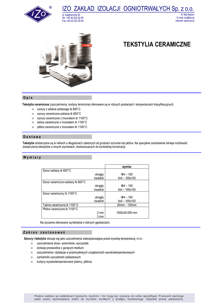 TEKSTYLIA CERAMICZNE Opis Tekstylia ceramiczne (uszczelnienia, kurtyny termiczne) oferowane są w róŜnych postaciach i temperaturach klasyfikacyjnych: • sznury z włókna szklanego tk 600°C • sznury ceramiczno-szklane tk 800°C • sznury ceramiczne z Inconelem tk 1100°C • taśmy ceramiczne z Inconelem tk 1100°C • płótno ceramiczne z Inconelem tk 1100°C Dostawa Tekstylia dostarczane są w rolkach o długościach zaleŜnych od grubości sznurów lub płótna. Na specjalne zamówienie istnieje moŜliwość dostarczenia tekstyliów o innych wymiarach, dostosowanych do konkretnej konstrukcji. Wymiary wymiar Sznur szklany tk 600°C okrągły kwadrat Φ4 – 100 4x4 – 100x100 okrągły kwadrat Φ4 – 100 4x4 – 100x100 okrągły kwadrat Φ4 – 100 4x4 – 100x100 20mm – 120mm 2 mm 3 mm 1000x30 000 mm Sznur ceramiczno-szklany tk 800°C Sznur ceramiczny tk 1100°C Taśma ceramiczna tk 1100°C Płótno ceramiczne tk 1100°C Na Ŝyczenie oferowane są tekstylia o róŜnych gęstościach. Zakres zastosowań Sznury i tekstylia stosuje się jako uszczelnienia zabezpieczające przed wysoką temperaturą, m.in.: • uszczelnienia drzwi, wzierników, wyczystek • izolacja przewodów z gorącym medium • uszczelnienia i dylatacje w przemysłowych urządzeniach wysokotemperaturowych • zamienniki uszczelnień azbestowych • kurtyny wysokotemperaturowe (taśmy, płótna)