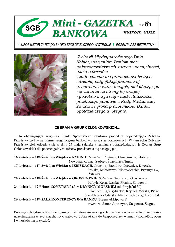 nr 81 marzec 2012 Z okazji Międzynarodowego Dnia Kobiet, wszystkim Paniom moc najserdeczniejszych życzeń - pomyślności, wielu sukcesów i zadowolenia w sprawach osobistych, zdrowia, satysfakcji finansowej w sprawach zawodowych, niekończącego się uznania ze strony tej drugiej - podobno brzydszej - części ludzkości, przekazują panowie z Rady Nadzorczej, Zarządu i grona pracowników Banku Spółdzielczego w Stegnie. ZEBRANIA GRUP CZŁONKOWSKICH... ... to obowiązująca wszystkie Banki Spółdzielcze statutowa procedura poprzedzająca Zebranie Przedstawicieli – najważniejszego organu bankowych władz samorządowych. W tym roku Zebranie Przedstawicieli odbędzie się w dniu 25 maja (piątek) a terminarz poprzedzających je Zebrań Grup Członkowskich dla poszczególnych sołectw przedstawia się następująco: 16 kwietnia – 1100 Świetlica Wiejska w RYBINIE. Sołectwa: Chełmek, Chorążówka, Głobica, Nowotna, Rybina, Stobiec, Świerznica,Tujsk. 00 17 kwietnia – 11 Świetlica Wiejska w IZBISKACH. Sołectwa: Bronowo, Drewnica, Dworek, Izbiska, Mikoszewo, Niedźwiedzica, Przemysław, Żuławki. 20 kwietnia – 1100 Świetlica Wiejska w GROSZKOWIE. Sołectwa: Grochowo, Groszkowo, Kobyla Kępa, Łaszka, Płonina, Sztutowo. 00 24 kwietnia – 12 Hotel CONTINENTAL w KRYNICY MORSKIEJ (ul. Przyjaźni 30) sołectwa: Kąty Rybackie, Krynica Morska, Piaski oraz delegaci z Gdańska, Marzęcina, Nowego Dworu Gd. 26 kwietnia – 1100 SALA KONFERENCYJNA BANKU (Stegna ul.Lipowa 8) sołectwa: Jantar, Junoszyno, Stegienka, Stegna. Prosimy delegatów a także szeregowych udziałowców naszego Banku o zapewnienie sobie możliwości uczestniczenia w zebraniach. To wyjątkowo dobra okazja do bezpośredniej wymiany poglądów, ocen i wniosków na przyszłość. NA NAUKĘ NIGDY NIE JEST ZA PÓŹNO Zakończył się drugi, rozpoczął trzeci kurs obsługi komputera, finansowany w znacznej części z funduszu społeczno-samorządowego naszego Banku, zorganizowany dla udziałowców i klientów. Zaledwie kilka osób - nie posiadających rachunku w naszym Banku - nie mogło skorzystać z przywileju ulgowej ceny, większość płaciła więc zaledwie 60 zł, co jest - mówiąc potocznym językiem - “darmochą” w porównaniu z powszechnie spotykanymi cenami. Z dobiegających do kierownictwa Banku informacji wynika, że słuchacze są zadowoleni, jednakże odczuwają niedosyt informacji w części praktycznej zajęć. Po prostu kurs jest zbyt krótki, informacje z konieczności - jedynie najbardziej podstawowe, na praktyczne ćwiczenia pod okiem prowadzącej zajęcia za krótki. Podkreślić jednak trzeba, że kurs - z założenia - miał dostarczyć tylko elementarny zasób wiedzy, pozwalający słuchaczom później już samodzielnie doskonalić umiejętność posługiwania się komputerem. Władze samorządowe Banku liczą na to, że większość słuchaczy zechce w najbliższej przyszłości skorzystać z możliwości samodzielnego obsługiwania swego rachunku bankowego w systemie HOME BANKING o czym - wprawdzie pobieżnie - również była mowa na kursie. Wyjaśnić tu wypada, że jest to bardzo wygodny sposób realizowania swoich zobowiązań nie wychodząc z domu. W wyniku nieskomplikowanej procedury można wykonać za pomocą własnego komputera wszystkie (prawie wszystkie) te czynności, które zazwyczaj wykonuje pracownik banku w okienku, a także kontrolować sytuację na koncie w dowolnej chwili. Jedynym mankamentem jest to, że komputer nie zechce wydać nam banknotów. Ale od tego mamy bankomaty. CENY ZAKUPU/SPRZEDAŻY UŻYTKÓW ROLNYCH w IV kwartale 2011 r. obowiązujące od dnia 20.02 2012 r. do dnia udostępnienia przez ARiMR danych za kolejny kwartał (cena w zł/hektar). ogółem kl.I, II, IIIa kl. IIIb, IV kl. V, VI Polska 20.645,5 24.396,8 21.570,2 16.909,4 Woj. pomorskie 23.678,7 29.552,6 23.116,9 21.133,1 Najwyższa 30.922,3 wielkopolskie 39.201,0 wielkopolskie 33.261,8 wielkopolskie 24.028,7 wielkopolskie Najniższa 10.869,0 podkarpackie 12.804,9 podkarpackie 10.604,7 świętokrzyskie 7.269,9 świętokrzyskie CO NOWEGO U NAJMŁODSZYCH, PRZYSZŁYCH UDZIAŁOWCÓW Powoli, ale skutecznie rozwija się akcja powoływania Szkolnych Kas Oszczędności. W wyniku starań władz naszego Banku już trzy szkoły mają swoje SKO. Najwcześniej zorganizowana - w Stegnie - liczy 110 zapisanych uczniów, z czego systematycznie wpłaca (i wypłaca też) połowa, pozostali są aktywni od czasu do czasu. Obowiązek prowadzenia SKO przyjęła pani Marzena Zaręba. W Zespole Szkół w Sztutowie zapisało się 25 uczniów aktywnych raczej sporadycznie. Do bardziej systematycznego i liczniejszego udziału zachęcają uczniów panie Anna Bartnicka i Marzena Pipała. SKO w Zespole Szkół nr 1 w Nowym Dworze liczy 50 aktywnych uczestników, a opiekę nad funkcjonowaniem Kasy objęły panie Beata Rostkowska-Korczyc i Joanna Burczy. Podkreślić trzeba, że opieka nad działalnością SKO nie jest w żaden sposób wynagradzana, natomiast kłopotów z tym związanych jest czasem nawet sporo. Prowadzić trzeba dość prostą dokumentację i pilnować, aby wszystko się zgadzało. Samorząd naszego Banku docenia starania osób prowadzących SKO i przewidział dla nich na zakończenie roku szkolnego jakieś skromne nagrody. NASZA NOWA PLACÓWKA – W MARZĘCINIE... ... powoli rozwija swą działalność – rzecz jasna zależną od zainteresowania mieszkańców usługami bankowymi. Od daty otwarcia placówka prowadzi pełną obsługę klienta wraz z obsługą dewizową. Mamy już poważny dorobek w tym zakresie. Klienci korzystają z usługi INTERNET BANKING, używane są też karty bankomatowe. Klienci interesują się przede wszystkim zakładaniem ROR, dość często pytają o warunki założenia i korzyści z posiadania rachunku, padają kolejne obietnice założenia go w najbliższym czasie. Sporo pytań dotyczy kredytu konsumenckiego, pobrano sporo wniosków, czekać należy na dalszą ich realizację. 