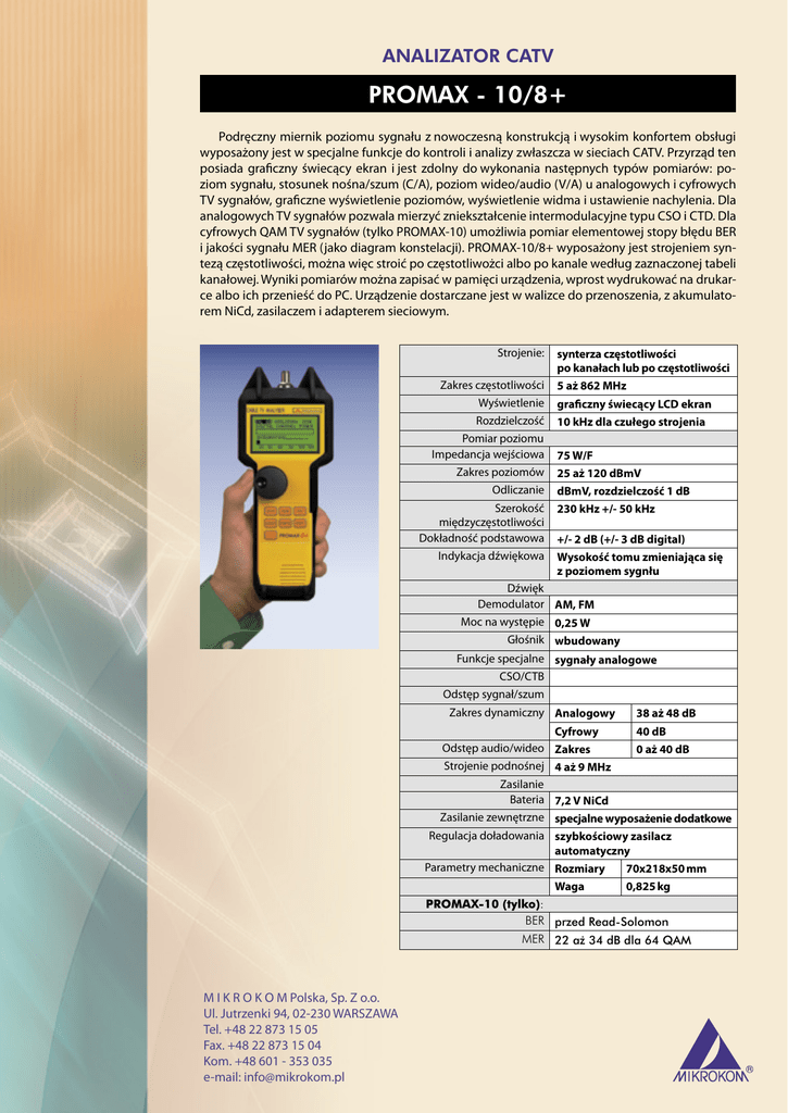 ANALIZATOR CATV PROMAX - 10/8+ Podręczny miernik poziomu sygnału z nowoczesną konstrukcją i wysokim konfortem obsługi wyposażony jest w specjalne funkcje do kontroli i analizy zwłaszcza w sieciach CATV. Przyrząd ten posiada graficzny świecący ekran i jest zdolny do wykonania następnych typów pomiarów: poziom sygnału, stosunek nośna/szum (C/A), poziom wideo/audio (V/A) u analogowych i cyfrowych TV sygnałów, graficzne wyświetlenie poziomów, wyświetlenie widma i ustawienie nachylenia. Dla analogowych TV sygnałów pozwala mierzyć zniekształcenie intermodulacyjne typu CSO i CTD. Dla cyfrowych QAM TV sygnałów (tylko PROMAX-10) umożliwia pomiar elementowej stopy błędu BER i jakości sygnału MER (jako diagram konstelacji). PROMAX-10/8+ wyposażony jest strojeniem syntezą częstotliwości, można więc stroić po częstotliwożci albo po kanale według zaznaczonej tabeli kanałowej. Wyniki pomiarów można zapisać w pamięci urządzenia, wprost wydrukować na drukarce albo ich przenieść do PC. Urządzenie dostarczane jest w walizce do przenoszenia, z akumulatorem NiCd, zasilaczem i adapterem sieciowym. Strojenie: Zakres częstotliwości synterza częstotliwości po kanałach lub po częstotliwości 5 aż 862 MHz Wyświetlenie graficzny świecący LCD ekran Rozdzielczość 10 kHz dla czułego strojenia Pomiar poziomu Impedancja wejściowa Zakres poziomów Odliczanie Szerokość międzyczęstotliwości Dokładność podstawowa Indykacja dźwiękowa 75 W/F 25 aż 120 dBmV dBmV, rozdzielczość 1 dB 230 kHz +/- 50 kHz +/- 2 dB (+/- 3 dB digital) Wysokość tomu zmieniająca się z poziomem sygnłu Dźwięk Demodulator AM, FM Moc na występie 0,25 W Głośnik wbudowany Funkcje specjalne sygnały analogowe CSO/CTB Odstęp sygnał/szum Zakres dynamiczny Analogowy Cyfrowy Odstęp audio/wideo Zakres Strojenie podnośnej 4 aż 9 MHz 38 aż 48 dB 40 dB 0 aż 40 dB Zasilanie Bateria 7,2 V NiCd Zasilanie zewnętrzne specjalne wyposażenie dodatkowe Regulacja doładowania szybkościowy zasilacz automatyczny Parametry mechaniczne Rozmiary 70x218x50 mm Waga 0,825 kg PROMAX-10 (tylko): BER przed Read-Solomon MER 22 aż 34 dB dla 64 QAM M I K R O K O M Polska, Sp. Z o.o. Ul. Jutrzenki 94, 02-230 WARSZAWA Tel. +48 22 873 15 05 Fax. +48 22 873 15 04 Kom. +48 601 - 353 035 e-mail: [email protected]