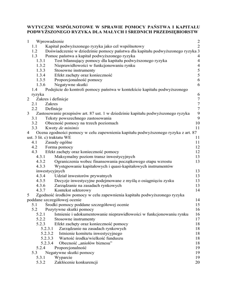 WYTYCZNE WSPÓLNOTOWE W SPRAWIE POMOCY PAŃSTWA I KAPITAŁU PODWYŻSZONEGO RYZYKA DLA MAŁYCH I ŚREDNICH PRZEDSIĘBIORSTW 1 Wprowadzenie 2 1.1 Kapitał podwyższonego ryzyka jako cel wspólnotowy 2 1.2 Doświadczenie w dziedzinie pomocy państwa dla kapitału podwyższonego ryzyka 3 1.3 Pomoc państwa a kapitał podwyższonego ryzyka 4 1.3.1 Test bilansujący pomocy dla kapitału podwyższonego ryzyka 4 1.3.2 Nieprawidłowości w funkcjonowaniu rynku 4 1.3.3 Stosowne instrumenty 5 1.3.4 Efekt zachęty oraz konieczność 5 1.3.5 Proporcjonalność pomocy 6 1.3.6 Negatywne skutki 6 1.4 Podejście do kontroli pomocy państwa w kontekście kapitału podwyższonego ryzyka 6 2 Zakres i definicje 7 2.1 Zakres 7 2.2 Definicje 7 3 Zastosowanie przepisów art. 87 ust. 1 w dziedzinie kapitału podwyższonego ryzyka 9 3.1 Teksty powszechnego zastosowania 9 3.2 Obecność pomocy na trzech poziomach 10 3.3 Kwoty de minimis 11 4 Ocena zgodności pomocy w celu zapewnienia kapitału podwyższonego ryzyka z art. 87 ust. 3 lit. c) traktatu WE 11 4.1 Zasady ogólne 11 4.2 Forma pomocy 12 4.3 Efekt zachęty oraz konieczność pomocy 12 4.3.1 Maksymalny poziom transz inwestycyjnych 13 4.3.2 Ograniczenia wobec finansowania początkowego etapu wzrostu 13 4.3.3 Występowanie kapitałowych i quasi-kapitałowych instrumentów inwestycyjnych 13 4.3.4 Udział inwestorów prywatnych 13 4.3.5 Decyzje inwestycyjne podejmowane z myślą o osiągnięciu zysku 13 4.3.6 Zarządzanie na zasadach rynkowych 13 4.3.7 Kontekst sektorowy 14 5 Zgodność środków pomocy w celu zapewnienia kapitału podwyższonego ryzyka poddane szczegółowej ocenie 14 5.1 Środki pomocy poddane szczegółowej ocenie 15 5.2 Pozytywne skutki pomocy 16 5.2.1 Istnienie i udokumentowanie nieprawidłowości w funkcjonowaniu rynku 16 5.2.2 Stosowne instrumenty 17 5.2.3 Efekt zachęty oraz konieczność pomocy 18 5.2.3.1 Zarządzanie na zasadach rynkowych 18 5.2.3.2 Istnienie komitetu inwestycyjnego 18 5.2.3.3 Wartość środka/wielkość funduszu 18 5.2.3.4 Obecność „aniołów biznesu” 18 5.2.4 Proporcjonalność 19 5.3 Negatywne skutki pomocy 19 5.3.1 Wyparcie 19 5.3.2 Zakłócenie konkurencji 20 6 7 5.4 Bilansowanie i decyzja Kumulacja Postanowienia końcowe 7.1 Monitorowanie i sprawozdania 7.2 Wejście w życie i okres obowiązywania 7.3 Stosowne środki 1 1.1 20 21 22 22 22 23 WPROWADZENIE Kapitał podwyższonego ryzyka jako cel wspólnotowy Kapitał podwyższonego ryzyka odnosi się do finansowania kapitału spółek posiadających potencjał szybkiego wzrostu we wczesnych fazach rozwoju. Zapotrzebowanie na kapitał podwyższonego ryzyka zgłaszają spółki posiadające potencjał szybkiego wzrostu, które nie mają dostatecznego dostępu do rynków kapitałowych, podczas gdy oferta kapitału podwyższonego ryzyka pochodzi od inwestorów gotowych podjąć wysokie ryzyko w zamian za potencjalnie wyższy od średniej zwrot z zainwestowanego kapitału. Komunikat „Pomoc państwa a kapitał podwyższonego ryzyka” (zwany dalej komunikatem PPKPR)1 przyjęto w 2001 r. aby określić warunki udzielania pomocy państwa w formie kapitału podwyższonego ryzyka. W wydanym przez siebie komunikacie na temat odnowionej strategii lizbońskiej2 Komisja przyznała, że poziom kapitału podwyższonego ryzyka dostępnego dla nowo powstałych innowacyjnych przedsiębiorstw jest za niski. Komisja podkreśliła również znaczenie zmniejszania i przekierowania pomocy państwa, co pozwoliłoby zaradzić nieprawidłowościom w funkcjonowaniu rynku, w celu podniesienia efektywności gospodarczej i pobudzenia innowacyjności. W tym kontekście Komisja zobowiązała się przeprowadzić reformę zasad udzielania pomocy państwa, między innymi w celu ułatwienia dostępu do finansowania i kapitału podwyższonego ryzyka. Spełniając swoje zobowiązanie Komisja opublikowała w czerwcu 2005 r. plan działania w zakresie pomocy państwa (PDPP) na temat mniejszej i lepiej ukierunkowanej pomocy państwa3. W PDPP podkreślono znaczenie poprawy klimatu dla biznesu i ułatwienie szybkiego rozruchu nowych przedsiębiorstw. W tym kontekście w PDPP zawarto zapis o przeglądzie komunikatu PPKPR w celu zaradzenia nieprawidłowościom w funkcjonowaniu rynku wpływającym na podaż kapitału podwyższonego ryzyka dla nowo powstałych przedsiębiorstw i młodych innowacyjnych MŚP, zwłaszcza poprzez zwiększenie elastyczności zasad zawartych w komunikacie PPKPR. Choć we Wspólnocie to rynek powinien zapewnić wystarczającą ilość kapitału podwyższonego ryzyka, na rynku kapitału podwyższonego ryzyka istnieje „luka kapitałowa”, będąca utrzymującą się niedoskonałością rynku, która sprawia, że podaż nie pokrywa popytu przy poziomie cen, który gotowe przyjąć są obydwie strony, co z kolei negatywnie oddziałuje na europejskie małe i średnie przedsiębiorstwa (MŚP). Luka ta dotyczy przede wszystkim innowacyjnych przedsiębiorstw sektora zaawansowanych technologii, które powstały niedawno i posiadają potencjał szybkiego tempa wzrostu. Może ona oddziaływać również na szereg przedsiębiorstw o różnym stażu i reprezentujących różne sektory, które posiadają 1 Dz.U. C 235 z 21.8.2001, str. 3. Komunikat na wiosenny szczyt Rady Europejskiej „Wspólne działania na rzecz wzrostu gospodarczego i zatrudnienia - Nowy początek strategii lizbońskiej”, COM (2005) 24 z 2.2.2005 r. 3 Mniejsza i lepiej ukierunkowana pomoc państwa: mapa drogowa reformy pomocy państwa na lata 2005–2009, COM (2005) 107 wersja ostateczna – (SEC(2005) 795 z 7.6.2005. 2 PROJEKT 2 PROJEKT mniejszy potencjał wzrostu i nie są w stanie znaleźć źródeł finansowania projektów zakładających rozszerzanie działalności bez wykorzystania zewnętrznego kapitału podwyższonego ryzyka. Istnienie luki kapitałowej może w pewnych ograniczonych okolicznościach usprawiedliwiać udzielanie pomocy państwa. Niniejsze wytyczne określają zasady wyjaśniające warunki i