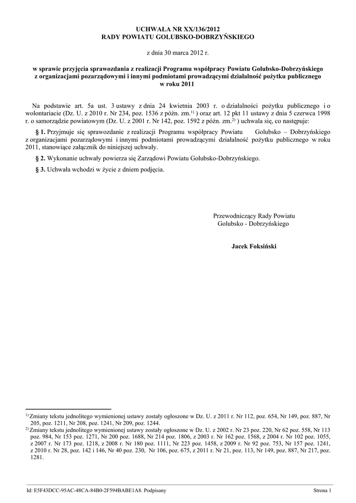 UCHWAŁA NR XX/136/2012 RADY POWIATU GOLUBSKO-DOBRZYŃSKIEGO z dnia 30 marca 2012 r. w sprawie przyjęcia sprawozdania z realizacji Programu współpracy Powiatu Golubsko-Dobrzyńskiego z organizacjami pozarządowymi i innymi podmiotami prowadzącymi działalność pożytku publicznego w roku 2011 Na podstawie art. 5a ust. 3 ustawy z dnia 24 kwietnia 2003 r. o działalności pożytku publicznego i o wolontariacie (Dz. U. z 2010 r. Nr 234, poz. 1536 z późn. zm.1) ) oraz art. 12 pkt 11 ustawy z dnia 5 czerwca 1998 r. o samorządzie powiatowym (Dz. U. z 2001 r. Nr 142, poz. 1592 z późn. zm.2) ) uchwala się, co następuje: § 1. Przyjmuje się sprawozdanie z realizacji Programu współpracy Powiatu Golubsko – Dobrzyńskiego z organizacjami pozarządowymi i innymi podmiotami prowadzącymi działalność pożytku publicznego w roku 2011, stanowiące załącznik do niniejszej uchwały. § 2. Wykonanie uchwały powierza się Zarządowi Powiatu Golubsko-Dobrzyńskiego. § 3. Uchwała wchodzi w życie z dniem podjęcia. Przewodniczący Rady Powiatu Golubsko - Dobrzyńskiego Jacek Foksiński 1) Zmiany tekstu jednolitego wymienionej ustawy zostały ogłoszone w Dz. U. z 2011 r. Nr 112, poz. 654, Nr 149, poz. 887, Nr 205, poz. 1211, Nr 208, poz. 1241, Nr 209, poz. 1244. 2) Zmiany tekstu jednolitego wymienionej ustawy zostały ogłoszone w Dz. U. z 2002 r. Nr 23 poz. 220, Nr 62 poz. 558, Nr 113 poz. 984, Nr 153 poz. 1271, Nr 200 poz. 1688, Nr 214 poz. 1806, z 2003 r. Nr 162 poz. 1568, z 2004 r. Nr 102 poz. 1055, z 2007 r. Nr 173 poz. 1218, z 2008 r. Nr 180 poz. 1111, Nr 223 poz. 1458, z 2009 r. Nr 92 poz. 753, Nr 157 poz. 1241, z 2010 r. Nr 28, poz. 142 i 146, Nr 40 poz. 230, Nr 106, poz. 675, z 2011 r. Nr 21, poz. 113, Nr 149, poz. 887, Nr 217, poz. 1281. ————————————————————————————————————————————————————————— Id: E5F43DCC-95AC-48CA-84B0-2F594BABE1A8. Podpisany Strona 1 Załącznik Nr 1 do Uchwały Nr XX/136/2012 Rady Powiatu Golubsko-Dobrzyńskiego z dnia 30 marca 2012 r. Sprawozdanie z realizacji Programu współpracy Powiatu Golubsko-Dobrzyńskiego z organizacjami pozarządowymi i innymi podmiotami prowadzącymi działalność pożytku publicznego w roku 2011 Współpraca Powiatu Golubsko-Dobrzyńskiego z organizacjami pozarządowymi i innymi podmiotami prowadzącymi działalność pożytku publicznego w 2011 r. oparta była o postanowienia zawarte w Programie współpracy, który przyjęty został przez Radę Powiatu Golubsko-Dobrzyńskiego uchwałą nr III/18/10 z dnia 30 grudnia 2010 r. Celem Programu było budowanie partnerstwa między samorządem powiatowym, a organizacjami pozarządowymi dla pełnej realizacji zadań publicznych, jak również efektywne wykorzystanie społecznej aktywności w zaspokajaniu potrzeb lokalnych społeczności i zwiększenie efektywności wykorzystania środków publicznych. Powyższe cele realizowane były w myśl zasad: pomocniczości, suwerenności storn, partnerstwa, uczciwej konkurencji, efektywności i jawności. Współpraca samorządu powiatowego z organizacjami pozarządowymi odbywała się w następujących formach: - wzajemnego informowania o planowanych kierunkach działalności i współdziałania w celu zharmonizowania tych kierunków, w szczególności poprzez zamieszczanie na stronie Biuletynu Informacji Publicznej Starostwa Powiatowego oraz przesyłanie do lokalnych instytucji i jednostek pisemnych informacji o podejmowanych przedsięwzięciach, a także informowanie o możliwościach uzyskania wsparcia z funduszy strukturalnych Unii Europejskiej, - konsultowania projektów aktów normatywnych Rady Powiatu w dziedzinach dotyczących działalności statutowej organizacji, w szczególności poprzez poddanie projektów uchwał pod ocenę poszczególnych komisji Rady Powiatu oraz istniejących na terenie powiatu organów o charakterze opiniodawczym, np. Powiatowej Rady ds. Osób Niepełnosprawnych, - umożliwienia przedstawicielom organizacji pozarządowych uczestnictwa w posiedzeniach organu stanowiącego i wykonawczego Powiatu Golubsko-Dobrzyńskiego, - tworzenia wspólnych zespołów problemowych o charakterze doradczym i inicjatywnym, składających się z radnych powiatowych, przedstawicieli jednostek organizacyjnych powiatu oraz przedstawicieli organizacji pozarządowych do rozpatrywania określonych problemów, ustalania strategii i sposobów wspólnego działania lub podjęcia określonej problematyki dla dobra pożytku publicznego, w szczególności poprzez udział zespołów wdrażających i monitorujących realizację Powiatowej Strategii Rozwiązywania Problemów Społecznych oraz lokalnych programów o charakterze długofalowym w przedsięwzięciach wynikających z założeń w/wym. programów. W roku 2011 Zarząd Powiatu Golubsko-Dobrzyńskiego uchwałą nr 14/15/11 z dnia 14 kwietnia 2011 r. ogłosił otwarty konkurs ofert na wykonanie zadań publicznych związanych z realizacją zadań samorządu powiatowego w roku 2011 przez organizacje pozarządowe i inne podmioty w zakresie: kultury fizycznej, w tym wychowania fizycznego, sportu i rekreacji, turystyki i krajoznawstwa, kultury, sztuki, ochrony dóbr kultury i tradycji, ochrony i promocji zdrowia oraz wspierania osób niepełnosprawnych. Do konkursu przystąpiło 4 oferentów. Po dokonanej ocenie złożonych ofert, Komisja Konkursowa zarekomendowała Zarządowi Powiatu propozycję ich wyboru, ponieważ spełnili oni wymogi formalne. Uchwałą nr 19/25/11 z dnia 27 maja 2011 r. Zarząd Powiatu Golubsko-Dobrzyńskiego dokonał rozstrzygnięcia otwartego konkursu ofert. ————————————————————————————————————————————————————————— Id: E5F43DCC-95AC-48CA-84B0-2F594BABE1A8. Podpisany Strona 1 Dofinansowanie zadań publicznych związanych z realizacją zadań sa