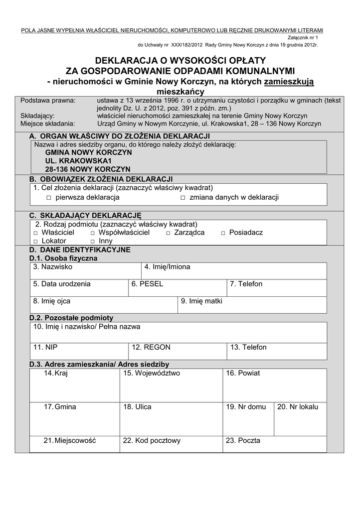 POLA JASNE WYPEŁNIA WŁAŚCICIEL NIERUCHOMOŚCI, KOMPUTEROWO LUB RĘCZNIE DRUKOWANYMI LITERAMI Załącznik nr 1 do Uchwały nr XXX/182/2012 Rady Gminy Nowy Korczyn z dnia 19 grudnia 2012r. DEKLARACJA O WYSOKOŚCI OPŁATY ZA GOSPODAROWANIE ODPADAMI KOMUNALNYMI - nieruchomości w Gminie Nowy Korczyn, na których zamieszkują mieszkańcy Podstawa prawna: Składający: Miejsce składania: ustawa z 13 września 1996 r. o utrzymaniu czystości i porządku w gminach (tekst jednolity Dz. U. z 2012, poz. 391 z późn. zm.) właściciel nieruchomości zamieszkałej na terenie Gminy Nowy Korczyn Urząd Gminy w Nowym Korczynie, ul. Krakowska1, 28 – 136 Nowy Korczyn A. ORGAN WŁAŚCIWY DO ZŁOŻENIA DEKLARACJI Nazwa i adres siedziby organu, do którego należy złożyć deklarację: GMINA NOWY KORCZYN UL. KRAKOWSKA1 28-136 NOWY KORCZYN B. OBOWIĄZEK ZŁOŻENIA DEKLARACJI 1. Cel złożenia deklaracji (zaznaczyć właściwy kwadrat) □ pierwsza deklaracja □ zmiana danych w deklaracji C. SKŁADAJĄCY DEKLARACJĘ 2. Rodzaj podmiotu (zaznaczyć właściwy kwadrat) □ Właściciel □ Współwłaściciel □ Zarządca □ Lokator □ Inny D. DANE IDENTYFIKACYJNE D.1. Osoba fizyczna 3. Nazwisko 4. Imię/Imiona 5. Data urodzenia □ Posiadacz 6. PESEL 8. Imię ojca 7. Telefon 9. Imię matki D.2. Pozostałe podmioty 10. Imię i nazwisko/ Pełna nazwa 11. NIP 12. REGON D.3. Adres zamieszkania/ Adres siedziby 14. Kraj 15. Województwo 13. Telefon 16. Powiat 17. Gmina 18. Ulica 19. Nr domu 21. Miejscowość 22. Kod pocztowy 23. Poczta 20. Nr lokalu E. ADRES NIERUCHOMOŚCI, NA KTÓREJ POWSTAJĄ ODPADY KOMUNALNE 24. Ulica 25. Nr domu 26. Nr lokalu F. DANE DOTYCZĄCE PRZEDMIOTU OPŁATY 27. Oświadczam, że na terenie nieruchomości wskazanej w części E niniejszej deklaracji zamieszkuje ……………. osób (podać liczbę mieszkańców) 28. Oświadczam, iż odpady komunalne z nieruchomości zbierane będą w sposób: □ selektywny □ nieselektywny (zmieszany) 29. Oświadczam, że bioodpady będę gromadzić w kompostowniku, a uzyskany kompost będę wykorzystywać na własne potrzeby na mojej posesji jednorodzinnej, zagrodowej lub rekreacyjnej : □ tak □ nie G. OPŁATA ZA GOSPODAROWANIE ODPADAMI KOMUNALNYMI Stawka opłaty za osobę określona w uchwale Rady Gminy Nowy Korczyn w 30 sprawie wyboru metody ustalenia opłaty za gospodarowanie odpadami komunalnymi oraz ustalenia wysokości tej opłaty Miesięczna kwota opłaty brutto (iloczyn liczby osób wskazanych w części F poz.27 i kwoty z części G poz.30) 31 H. OŚWIADCZENIE I PODPIS OSOBY SKŁADAJĄCEJ DEKLARACJĘ Oświadczam, że są mi znane przepisy Kodeksu karnego skarbowego o odpowiedzialności za podanie danych niezgodnych z rzeczywistością. Data Czytelny podpis (z podaniem imienia i nazwiska) POUCZENIE W przypadku nieterminowego uregulowania należności lub wpłacania jej w niepełnej wysokości, niniejsza deklaracja stanowi podstawę do wystawienia tytułu wykonawczego, zgodnie z przepisami ustawy z 17 czerwca 1966 r. o postępowaniu egzekucyjnym w administracji (Dz. U. z 2005 r. Nr 299, poz. 1954 z późn. zm.) URZĄD GMINY NOWY KORCZYN UL. KRAKOWSKA 1, 28 – 136 NOWY KORCZYN OBJAŚNIENIA DO DEKLARACJI O WYSOKOŚCI OPŁATY ZA GOSPODAROWANIE ODPADAMI KOMUNALNYMI nieruchomości w Gminie Nowy Korczyn, na których zamieszkują mieszkańcy Formularz przeznaczony jest dla właścicieli nieruchomości w Gminie Nowy Korczyn, na których zamieszkują mieszkańcy, do których ma zastosowanie art. 6c ust. 1 ustawy z dnia 13 września 1996r. o utrzymaniu czystości i porządku w gminach (t. j. z 2012 r. poz.391 z późn. zm.) Właścicielem nieruchomości w myśl ustawy jest także współwłaściciel, użytkownik wieczysty oraz jednostki organizacyjne i osoby posiadające nieruchomości w zarządzie lub użytkowaniu, a także inne podmioty władające nieruchomością. A. Organem właściwym, do którego należy złożyć deklarację jest Wójt Gminy Nowy Korczyn. Formularz można złożyć osobiście w Urzędzie Gminy w Nowym Korczynie ul. Krakowska 1, 28-136 Nowy Korczyn lub poprzez elektroniczną skrzynkę podawczą zamieszczoną w Biuletynie Informacji Publicznej www.bip.nowykorczyn.pl B. Zgodnie z art. 6m ustawy z 13 września 1996 r. o utrzymaniu czystości i porządku w gminach właściciel nieruchomości jest obowiązany złożyć do właściwego organu deklarację o wysokości opłaty za gospodarowanie odpadami komunalnymi w terminie 14 dni od dnia zamieszkania na danej nieruchomości pierwszego mieszkańca. W przypadku zmiany danych będących podstawą ustalenia wysokości należnej opłaty za gospodarowanie odpadami komunalnymi właściciel nieruchomości jest obowiązany złożyć nową deklarację w terminie 14 dni od dnia nastąpienia zmiany. Zgodnie z art. 6o cytowanej ustawy w razie niezłożenia deklaracji o wysokości opłaty za gospodarowanie odpadami komunalnymi albo uzasadnionych wątpliwości co do danych zawartych w deklaracji właściwy organ określa, w drodze decyzji, wysokość opłaty za gospodarowanie odpadami komunalnymi, biorąc pod uwagę uzasadnione szacunki. C. Wyjaśnienie pojęć: Właściciel nieruchomości – w myśl Kodeksu cywilnego i ustawy o księgach wieczystych i hipotece, czyli właściciel nieruchomości wyodrębnionej prawnie i fizycznie, zwłaszcza poprzez urządzenie księgi wieczystej, Współwłaściciel nieruchomości, w tym współużytkownik wieczysty nieruchomości, zgodnie z definicją Kodeksu cywilnego i ustawy o księgach wieczystych i hipotece, gdy nieruchomość przysługuje niepodzielnie dwóm lub więcej osobom prawnym lub fizycznym; Zarządca – oznacza osobę prawną lub fizyczną powołaną do zarządzania nieruchomością, w tym zarządcy wspólnot mieszkaniowych, Administracja Mieszkań Komunalnych. Zarządcą nieruchomości nie są spółdzielnie mieszkaniowe – chyba, że wyodrębniono wszystkie lokale mieszkaniowe, a spółdzielnia została wybrana na zarządcę (w przec
