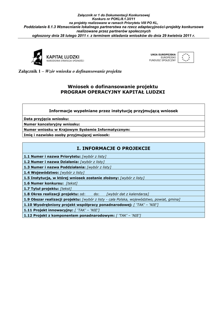 Załącznik nr 1 do Dokumentacji Konkursowej Konkurs nr POKL/8.1.3/I/11 na projekty realizowane w ramach Priorytetu VIII PO KL, Poddziałanie 8.1.3 Wzmacnianie lokalnego partnerstwa na rzecz adaptacyjności-projekty konkursowe realizowane przez partnerów społecznych ogłoszony dnia 28 lutego 2011 r. z terminem składania wniosków do dnia 29 kwietnia 2011 r. Załącznik 1 – Wzór wniosku o dofinansowanie projektu Wniosek o dofinansowanie projektu PROGRAM OPERACYJNY KAPITAŁ LUDZKI Informacje wypełniane przez instytucję przyjmującą wniosek Data przyjęcia wniosku: Numer kancelaryjny wniosku: Numer wniosku w Krajowym Systemie Informatycznym: Imię i nazwisko osoby przyjmującej wniosek: I. INFORMACJE O PROJEKCIE 1.1 Numer i nazwa Priorytetu: [wybór z listy] 1.2 Numer i nazwa Działania: [wybór z listy] 1.3 Numer i nazwa Poddziałania: [wybór z listy] 1.4 Województwo: [wybór z listy] 1.5 Instytucja, w której wniosek zostanie złożony: [wybór z listy] 1.6 Numer konkursu: [tekst] 1.7 Tytuł projektu: [tekst] 1.8 Okres realizacji projektu: od: do: [wybór dat z kalendarza] 1.9 Obszar realizacji projektu: [wybór z listy - cała Polska, województwo, powiat, gmina] 1.10 Wyodrębniony projekt współpracy ponadnarodowej: [ ‘TAK’ – ‘NIE’] 1.11 Projekt innowacyjny: [ ‘TAK’ – ‘NIE’] 1.12 Projekt z komponentem ponadnarodowym: [ ‘TAK’ – ‘NIE’] Załącznik nr 1 do Dokumentacji Konkursowej Konkurs nr POKL/8.1.1/IB/11 na projekty realizowane w ramach Priorytetu VIII PO KL, Poddziałanie 8.1.1 Wspieranie rozwoju kwalifikacji zawodowych i doradztwo dla przedsiębiorstw, ogłoszony dnia 28 lutego 2011 r. z terminem składania wniosków do dnia 31 marca 2011 r. II. BENEFICJENT (PROJEKTODAWCA) 2.1 Nazwa projektodawcy: [tekst] 2.2 Status prawny: [wybór z listy] 2.3 NIP: [tekst oraz check-box: ‘PL’ – ‘Inny’] 2.4 REGON: [tekst] 2.5 Adres siedziby: Ulica: Nr domu: Nr lokalu: Miejscowość: Kod pocztowy: [tekst oraz check-box: ‘PL’ – ‘Inny’] Telefon: Fax: 2.6 Osoba/y uprawniona/e do podejmowania decyzji wiążących w imieniu projektodawcy: [tekst] 2.7 Osoba do kontaktów roboczych: [tekst] 2.7.1 Numer telefonu: [tekst] 2.7.2 Adres poczty elektronicznej: [tekst] 2.7.3 Numer faksu: [tekst] 2.7.4 Adres: [tekst – jeśli inny niż w pkt. 2.5] 2.8 Partnerzy: [check-box: ‘TAK’ – ‘NIE’] 2.8.1 Nazwa organizacji/instytucji: [tekst] 2.8.2 Status prawny: [wybór z listy] 2.8.3 Adres siedziby: [tekst] Załącznik nr 1 do Dokumentacji Konkursowej Konkurs nr POKL/8.1.3/I/11 na projekty realizowane w ramach Priorytetu VIII PO KL, Poddziałanie 8.1.3 Wzmacnianie lokalnego partnerstwa na rzecz adaptacyjności-projekty konkursowe realizowane przez partnerów społecznych ogłoszony dnia 28 lutego 2011 r. z terminem składania wniosków do dnia 29 kwietnia 2011 r. III. CHARAKTERYSTYKA PROJEKTU (maksymalnie 15 000/20 000/25 000/35 000 znaków) 3.1 Uzasadnienie potrzeby realizacji i cele projektu - Uzasadnij potrzebę realizacji projektu Wskaż cel główny oraz cele szczegółowe projektu Określ, w jaki sposób mierzona będzie realizacja celów (ustal wskaźniki pomiaru celów) Określ wartość obecną wskaźnika (stan wyjściowy projektu) i wartość docelową wskaźnika (której osiągnięcie będzie uznane za zrealizowanie danego celu) Określ, w jaki sposób i na jakiej podstawie mierzone będą wskaźniki realizacji poszczególnych celów (ustal źródło weryfikacji/pozyskania danych do pomiaru wskaźnika oraz częstotliwość pomiaru) 3.1.1 Uzasadnienie potrzeby realizacji projektu [tekst] - Wskaż problem, na który odpowiedź stanowi cel główny projektu Przedstaw opis sytuacji problemowej, do której odnosi się projekt (z uwzględnieniem sytuacji kobiet i mężczyzn), uwzględniając dane statystyczne odnoszące się do obszaru realizacji projektu Przedstaw dostępne dane statystyczne uzasadniające cel główny projektu Opisz wpływ, jaki realizacja projektu może mieć na podmioty inne niż grupa docelowa tekst Załącznik nr 1 do Dokumentacji Konkursowej Konkurs nr POKL/8.1.1/IB/11 na projekty realizowane w ramach Priorytetu VIII PO KL, Poddziałanie 8.1.1 Wspieranie rozwoju kwalifikacji zawodowych i doradztwo dla przedsiębiorstw, ogłoszony dnia 28 lutego 2011 r. z terminem składania wniosków do dnia 31 marca 2011 r. 3.1.2 Cel główny projektu Wskaźnik pomiaru celu Wartość obecna wskaźnika K tekst 3.1.3 Cele szczegółowe projektu 1. tekst lub wybór z listy rozwijanej … tekst lub wybór z listy rozwijanej Wskaźnik pomiaru celu … tekst 1. tekst lub wybór z listy rozwijanej … tekst lub wybór z listy rozwijanej 1. tekst lub wybór z listy rozwijanej … tekst lub wybór z listy rozwijanej O K M Źródło weryfikacji/pozyskania danych do pomiaru wskaźnika oraz częstotliwość pomiaru O tekst tekst Wartość obecna wskaźnika K 1. tekst M Wartość docelowa wskaźnika M O Wartość docelowa wskaźnika K M Źródło weryfikacji/pozyskania danych do pomiaru wskaźnika oraz częstotliwość pomiaru O tekst tekst tekst tekst Załącznik nr 1 do Dokumentacji Konkursowej Konkurs nr POKL/8.1.3/I/11 na projekty realizowane w ramach Priorytetu VIII PO KL, Poddziałanie 8.1.3 Wzmacnianie lokalnego partnerstwa na rzecz adaptacyjności-projekty konkursowe realizowane przez partnerów społecznych ogłoszony dnia 28 lutego 2011 r. z terminem składania wniosków do dnia 29 kwietnia 2011 r. 3.2 Grupy docelowe (nie dotyczy projektów informacyjnych i badawczych, w których nie jest udzielane bezpośrednie wsparcie dla osób) [tekst] - Scharakteryzuj osoby i/lub instytucje, które zostaną objęte wsparciem z punktu widzenia istotnych dla projektu cech (np. wiek, status zawodowy, wykształcenie, płeć) Uzasadnij wybór grupy docelowej, która objęta zostanie wsparciem Opisz sposób rekrutacji uczestników/uczestniczek odnosząc się do planu rekrutacji, procedury rekrutacyjnej, dodatkowego naboru oraz katalogu przejrzystych kryteriów 