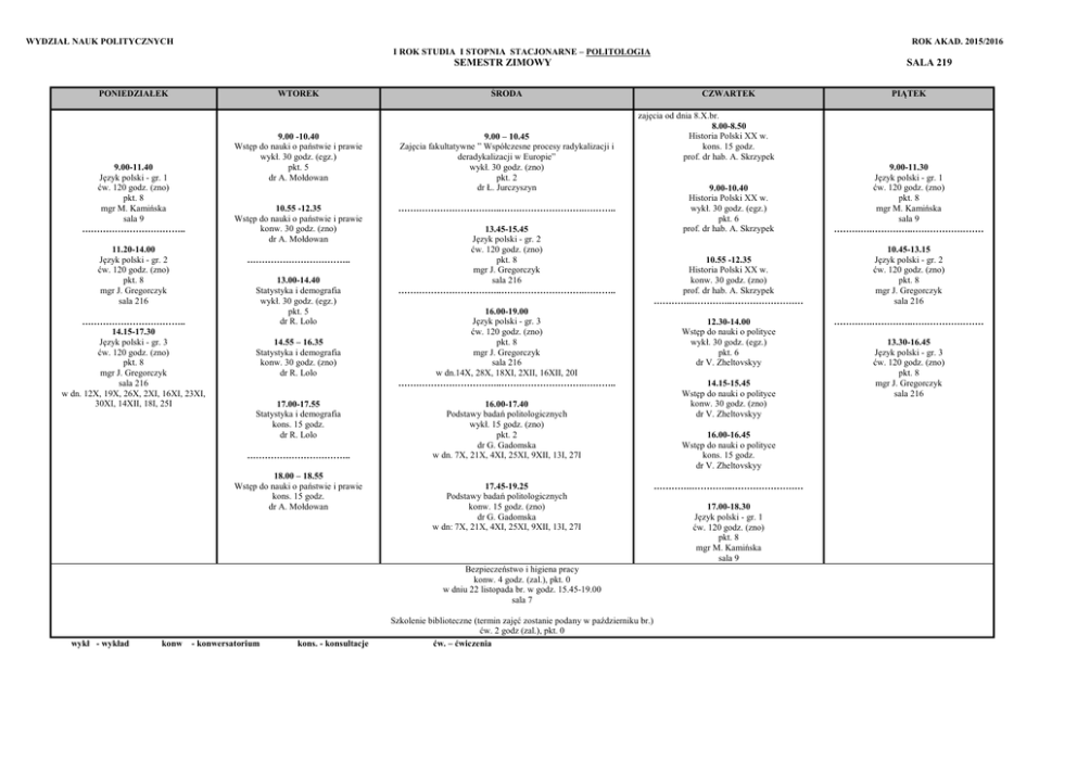 WYDZIAŁ NAUK POLITYCZNYCH ROK AKAD. 2015/2016 I ROK STUDIA I STOPNIA STACJONARNE – POLITOLOGIA SEMESTR ZIMOWY PONIEDZIAŁEK WTOREK 9.00 -10.40 Wstęp do nauki o państwie i prawie wykł. 30 godz. (egz.) pkt. 5 dr A. Mołdowan 9.00-11.40 Język polski - gr. 1 ćw. 120 godz. (zno) pkt. 8 mgr M. Kamińska sala 9 …………………………….. 10.55 -12.35 Wstęp do nauki o państwie i prawie konw. 30 godz. (zno) dr A. Mołdowan 11.20-14.00 Język polski - gr. 2 ćw. 120 godz. (zno) pkt. 8 mgr J. Gregorczyk sala 216 …………………………….. …………………………….. 14.15-17.30 Język polski - gr. 3 ćw. 120 godz. (zno) pkt. 8 mgr J. Gregorczyk sala 216 w dn. 12X, 19X, 26X, 2XI, 16XI, 23XI, 30XI, 14XII, 18I, 25I 13.00-14.40 Statystyka i demografia wykł. 30 godz. (egz.) pkt. 5 dr R. Lolo 14.55 – 16.35 Statystyka i demografia konw. 30 godz. (zno) dr R. Lolo 17.00-17.55 Statystyka i demografia kons. 15 godz. dr R. Lolo …………………………….. 18.00 – 18.55 Wstęp do nauki o państwie i prawie kons. 15 godz. dr A. Mołdowan SALA 219 ŚRODA 9.00 – 10.45 Zajęcia fakultatywne ” Współczesne procesy radykalizacji i deradykalizacji w Europie” wykł. 30 godz. (zno) pkt. 2 dr Ł. Jurczyszyn CZWARTEK zajęcia od dnia 8.X.br. 8.00-8.50 Historia Polski XX w. kons. 15 godz. prof. dr hab. A. Skrzypek ……………………………..……………………….……….. 13.45-15.45 Język polski - gr. 2 ćw. 120 godz. (zno) pkt. 8 mgr J. Gregorczyk sala 216 ……………………………..……………………….……….. 16.00-19.00 Język polski - gr. 3 ćw. 120 godz. (zno) pkt. 8 mgr J. Gregorczyk sala 216 w dn.14X, 28X, 18XI, 2XII, 16XII, 20I ……………………………..……………………….……….. 16.00-17.40 Podstawy badań politologicznych wykł. 15 godz. (zno) pkt. 2 dr G. Gadomska w dn. 7X, 21X, 4XI, 25XI, 9XII, 13I, 27I 17.45-19.25 Podstawy badań politologicznych konw. 15 godz. (zno) dr G. Gadomska w dn: 7X, 21X, 4XI, 25XI, 9XII, 13I, 27I Bezpieczeństwo i higiena pracy konw. 4 godz. (zal.), pkt. 0 w dniu 22 listopada br. w godz. 15.45-19.00 sala 7 wykł - wykład konw - konwersatorium kons. - konsultacje PIĄTEK Szkolenie biblioteczne (termin zajęć zostanie podany w październiku br.) ćw. 2 godz (zal.), pkt. 0 ćw. – ćwiczenia 9.00-10.40 Historia Polski XX w. wykł. 30 godz. (egz.) pkt. 6 prof. dr hab. A. Skrzypek 9.00-11.30 Język polski - gr. 1 ćw. 120 godz. (zno) pkt. 8 mgr M. Kamińska sala 9 ………….…………..…………………… 10.55 -12.35 Historia Polski XX w. konw. 30 godz. (zno) prof. dr hab. A. Skrzypek ………….…………..…………………… 10.45-13.15 Język polski - gr. 2 ćw. 120 godz. (zno) pkt. 8 mgr J. Gregorczyk sala 216 12.30-14.00 Wstęp do nauki o polityce wykł. 30 godz. (egz.) pkt. 6 dr V. Zheltovskyy 14.15-15.45 Wstęp do nauki o polityce konw. 30 godz. (zno) dr V. Zheltovskyy 16.00-16.45 Wstęp do nauki o polityce kons. 15 godz. dr V. Zheltovskyy ………….…………..…………………… 17.00-18.30 Język polski - gr. 1 ćw. 120 godz. (zno) pkt. 8 mgr M. Kamińska sala 9 ………….…………..…………………… 13.30-16.45 Język polski - gr. 3 ćw. 120 godz. (zno) pkt. 8 mgr J. Gregorczyk sala 216