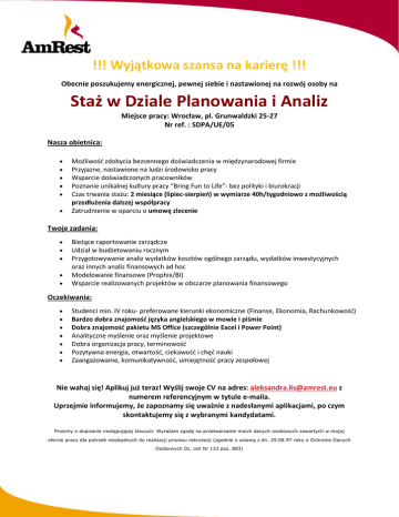 !!! Wyjątkowa szansa na karierę !!! Obecnie poszukujemy energicznej, pewnej siebie i nastawionej na rozwój osoby na Staż w Dziale Planowania i Analiz Miejsce pracy: Wrocław, pl. Grunwaldzki 25-27 Nr ref. : SDPA/UE/05 Nasza obietnica: Możliwość zdobycia bezcennego doświadczenia w międzynarodowej firmie Przyjazne, nastawione na ludzi środowisko pracy Wsparcie doświadczonych pracowników Poznanie unikalnej kultury pracy “Bring Fun to Life”- bez polityki i biurokracji Czas trwania stażu: 2 miesiące (lipiec-sierpień) w wymiarze 40h/tygodniowo z możliwością przedłużenia dalszej współpracy Zatrudnienie w oparciu o umowę zlecenie Twoje zadania: Bieżące raportowanie zarządcze Udział w budżetowaniu rocznym Przygotowywanie analiz wydatków kosztów ogólnego zarządu, wydatków inwestycyjnych oraz innych analiz finansowych ad hoc Modelowanie finansowe (Prophix/BI) Wsparcie realizowanych projektów w obszarze planowania finansowego Oczekiwania: Studenci min. IV roku- preferowane kierunki ekonomiczne (Finanse, Ekonomia, Rachunkowość) Bardzo dobra znajomość języka angielskiego w mowie i piśmie Dobra znajomość pakietu MS Office (szczególnie Excel i Power Point) Analityczne myślenie oraz myślenie projektowe Dobra organizacja pracy, terminowość Pozytywna energia, otwartość, ciekawość i chęć nauki Zaangażowanie, komunikatywność, umiejętność pracy zespołowej Nie wahaj się! Aplikuj już teraz! Wyślij swoje CV na adres: [email protected] z numerem referencyjnym w tytule e-maila. Uprzejmie informujemy, że zapoznamy się uważnie z nadesłanymi aplikacjami, po czym skontaktujemy się z wybranymi kandydatami. Prosimy o dopisanie następującej klauzuli: Wyrażam zgodę na przetwarzanie moich danych osobowych zawartych w mojej ofercie pracy dla potrzeb niezbędnych do realizacji procesu rekrutacji (zgodnie z ustawą z dn. 29.08.97 roku o Ochronie Danych Osobowych Dz. Ust Nr 133 poz. 883)
