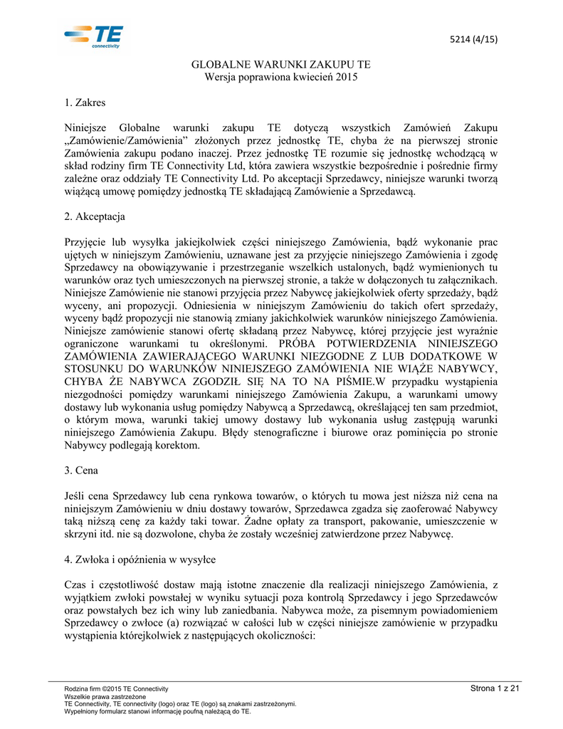 5214 (4/15) GLOBALNE WARUNKI ZAKUPU TE Wersja poprawiona kwiecień 2015 1. Zakres Niniejsze Globalne warunki zakupu TE dotyczą wszystkich Zamówień Zakupu „Zamówienie/Zamówienia” złożonych przez jednostkę TE, chyba że na pierwszej stronie Zamówienia zakupu podano inaczej. Przez jednostkę TE rozumie się jednostkę wchodzącą w skład rodziny firm TE Connectivity Ltd, która zawiera wszystkie bezpośrednie i pośrednie firmy zależne oraz oddziały TE Connectivity Ltd. Po akceptacji Sprzedawcy, niniejsze warunki tworzą wiążącą umowę pomiędzy jednostką TE składającą Zamówienie a Sprzedawcą. 2. Akceptacja Przyjęcie lub wysyłka jakiejkolwiek części niniejszego Zamówienia, bądź wykonanie prac ujętych w niniejszym Zamówieniu, uznawane jest za przyjęcie niniejszego Zamówienia i zgodę Sprzedawcy na obowiązywanie i przestrzeganie wszelkich ustalonych, bądź wymienionych tu warunków oraz tych umieszczonych na pierwszej stronie, a także w dołączonych tu załącznikach. Niniejsze Zamówienie nie stanowi przyjęcia przez Nabywcę jakiejkolwiek oferty sprzedaży, bądź wyceny, ani propozycji. Odniesienia w niniejszym Zamówieniu do takich ofert sprzedaży, wyceny bądź propozycji nie stanowią zmiany jakichkolwiek warunków niniejszego Zamówienia. Niniejsze zamówienie stanowi ofertę składaną przez Nabywcę, której przyjęcie jest wyraźnie ograniczone warunkami tu określonymi. PRÓBA POTWIERDZENIA NINIEJSZEGO ZAMÓWIENIA ZAWIERAJĄCEGO WARUNKI NIEZGODNE Z LUB DODATKOWE W STOSUNKU DO WARUNKÓW NINIEJSZEGO ZAMÓWIENIA NIE WIĄŻE NABYWCY, CHYBA ŻE NABYWCA ZGODZIŁ SIĘ NA TO NA PIŚMIE.W przypadku wystąpienia niezgodności pomiędzy warunkami niniejszego Zamówienia Zakupu, a warunkami umowy dostawy lub wykonania usług pomiędzy Nabywcą a Sprzedawcą, określającej ten sam przedmiot, o którym mowa, warunki takiej umowy dostawy lub wykonania usług zastępują warunki niniejszego Zamówienia Zakupu. Błędy stenograficzne i biurowe oraz pominięcia po stronie Nabywcy podlegają korektom. 3. Cena Jeśli cena Sprzedawcy lub cena rynkowa towarów, o których tu mowa jest niższa niż cena na niniejszym Zamówieniu w dniu dostawy towarów, Sprzedawca zgadza się zaoferować Nabywcy taką niższą cenę za każdy taki towar. Żadne opłaty za transport, pakowanie, umieszczenie w skrzyni itd. nie są dozwolone, chyba że zostały wcześniej zatwierdzone przez Nabywcę. 4. Zwłoka i opóźnienia w wysyłce Czas i częstotliwość dostaw mają istotne znaczenie dla realizacji niniejszego Zamówienia, z wyjątkiem zwłoki powstałej w wyniku sytuacji poza kontrolą Sprzedawcy i jego Sprzedawców oraz powstałych bez ich winy lub zaniedbania. Nabywca może, za pisemnym powiadomieniem Sprzedawcy o zwłoce (a) rozwiązać w całości lub w części niniejsze zamówienie w przypadku wystąpienia którejkolwiek z następujących okoliczności: Rodzina firm ©2015 TE Connectivity Wszelkie prawa zastrzeżone TE Connectivity, TE connectivity (logo) oraz TE (logo) są znakami zastrzeżonymi. Wypełniony formularz stanowi informację poufną należącą do TE. Strona 1 z 21 5214 (4/15) (i) jeśli Sprzedawca nie dokona wysyłki towarów lub nie wykona prac w terminie tu określonym lub po jego przedłużeniu lub (ii) jeśli Sprzedawca nie zachowa zgodności z innymi warunkami niniejszego Zamówienia oraz (b) dostarczy na takich warunkach, jakie Nabywca uzna za stosowne, towary lub usługi podobne do tych, z których zrezygnowano. W takim przypadku Sprzedawca będzie kontynuował realizację zamówienia w zakresie, który nie został rozwiązany i będzie odpowiedzialny wobec Nabywcy za jakiekolwiek dodatkowe koszty za podobne towary lub usługi oraz za wszelkie związane z nimi wydatki. Sprzedawca przejmuje odpowiedzialność i zwalnia z odpowiedzialności Nabywcę za wszelkie koszty, wydatki, szkody, bezpośrednie, pośrednie, przypadkowe lub wtórne, wynikające ze zwłoki po stronie Sprzedawcy. 5. Siła wyższa Żadna ze stron nie jest odpowiedzialna za opóźnienie lub niewykonanie jakiejkolwiek części niniejszej Umowy, wynikające z jakiegokolwiek działania siły wyższej, pożaru, powodzi, wybuchu, wojny, strajku, embarga, wymogu rządowego, władzy cywilnej lub wojskowej, przyrody lub wroga publicznego, bądź jakichkolwiek innych przyczyn, których nie można było przewidzieć lub które leżą poza kontrolą strony, której działania muszą być wstrzymane lub usprawiedliwione, pod warunkiem że nie można było uniknąć takiego opóźnienia lub niewykonania postanowień poprzez zachowanie uzasadnionych środków ostrożności oraz pod warunkiem, że druga strona została niezwłocznie powiadomiona na piśmie o takim działaniu siły wyższej. Zdarzenia takie jak opóźnienia w transporcie, brak możliwości nabycia towarów lub materiałów, bądź inne formy zakłócenia łańcucha dostaw nie stanowią siły wyższej i nie mogą usprawiedliwiać niewykonania postanowień. W przypadku działania siły wyższej, strona niezdolna do wypełniania zobowiązań powinna dołożyć wszelkich starań, by wznowić wypełnianie zobowiązań, gdy będzie to tylko możliwe, bez opóźnień, w tym poprzez wykorzystanie źródeł alternatywnych, planów obejść i innych środków. Jeśli działanie siły wyższej lub inne podobne zdarzenie wyjątkowe doprowadzą do tego, że Sprzedawca przydzieli ograniczone zasoby pomiędzy klientów Sprzedawcy, Sprzedawca nie będzie traktował priorytetowo względem Nabywcy innych klientów. Jeśli zwłoka lub brak wypełnienia zobowiązań przez Nabywcę będzie trwać dłużej niż trzydzieści (30) dni, Nabywca może rozwiązać niniejsze Zamówienie bez ponoszenia kosztów. 6. Inspekcja Wszelkie towary i usługi (określane łącznie mianem „prace”) zostaną odebrane po przeprowadzeniu inspekcji przez Nabywcę. Towary posiadające wady wykonawcze lub materiałowe, bądź w inny sposób niespełniające wymagań ninie