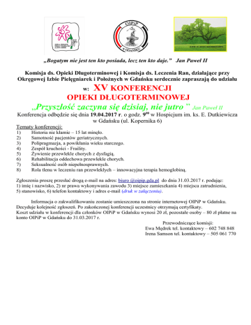 „Bogatym nie jest ten kto posiada, lecz ten kto daje.” Jan Paweł II Komisja ds. Opieki Długoterminowej i Komisja ds. Leczenia Ran, działające przy Okręgowej Izbie Pielęgniarek i Położnych w Gdańsku serdecznie zapraszają do udziału w: XV KONFERENCJI OPIEKI DŁUGOTERMINOWEJ „Przyszłość zaczyna się dzisiaj, nie jutro ” Jan Paweł II Konferencja odbędzie się dnia 19.04.2017 r. o godz. 900 w Hospicjum im. ks. E. Dutkiewicza w Gdańsku (ul. Kopernika 6) Tematy konferencji: 1) 2) 3) 4) 5) 6) 7) 8) Historia nie kłamie – 15 lat minęło. Samotność pacjentów geriatrycznych. Polipragmazja, a powikłania wieku starczego. Zespół kruchości - Fraility. Żywienie przewlekle chorych z dysfagią. Rehabilitacja oddechowa przewlekle chorych. Seksualność osób niepełnosprawnych. Rola tlenu w leczeniu ran przewlekłych – innowacyjna terapia hemoglobiną. Zgłoszenia proszę przesłać drogą e-mail na adres: biuro @oipip.gda.pl do dnia 31.03.2017 r. podając: 1) imię i nazwisko, 2) nr prawa wykonywania zawodu 3) miejsce zamieszkania 4) miejsca zatrudnienia, 5) stanowisko, 6) telefon kontaktowy i adres e-mail (druk w załączeniu). Informacja o zakwalifikowaniu zostanie umieszczona na stronie internetowej OIPiP w Gdańsku. Decyduje kolejność zgłoszeń. Po zakończonej konferencji uczestnicy otrzymają certyfikaty. Koszt udziału w konferencji dla członków OIPiP w Gdańsku wynosi 20 zł, pozostałe osoby – 80 zł płatne na konto OIPiP w Gdańsku do 31.03.2017 r. Przewodniczące komisji: Ewa Mędrek tel. kontaktowy – 602 748 848 Irena Samson tel. kontaktowy – 505 061 770 Okręgowa Izba Pielęgniarek i Położnych w Gdańsku 80-147Gdańsk, ul. Wyczółkowskiego 17 A Tel.3200680; Fax 322-33-12; e-mail: [email protected] , www.oipip.gda.pl ZGŁOSZENIE na: XV KONFERENCJĘ OPIEKI DŁUGOTERMINOWEJ NAZWISKO ...................………………....................................…………… IMIĘ ……………………………….......................................……………..... MIEJSCE ZAMIESZKANIA …...........…………………………….................... ……………………………………………….....…......................................... TELEFON …..……………….....................................................................… MIEJSCE PRACY …...………………………………………………………..... STANOWISKO …......………………………………………………………… NR PRWA WYKONYWANIA ZAWODU ….................................................. DATA……………… PODPIS……............……................…… Termin zgłoszenia:drogą e-mail na adres: [email protected] lub na adres OIPiP w Gdańsku do 31.03.2017 r. Wpłaty na konto OIPiP w Gdańsku ING Bank Śląski SA nr: 93 1050 1764 1000 0090 3024 7622 z dopiskiem: konferenacja OPD – 19.04.2017 r podając imię i nazwisko uczestnika. Decyduje kolejność zgłoszeń !