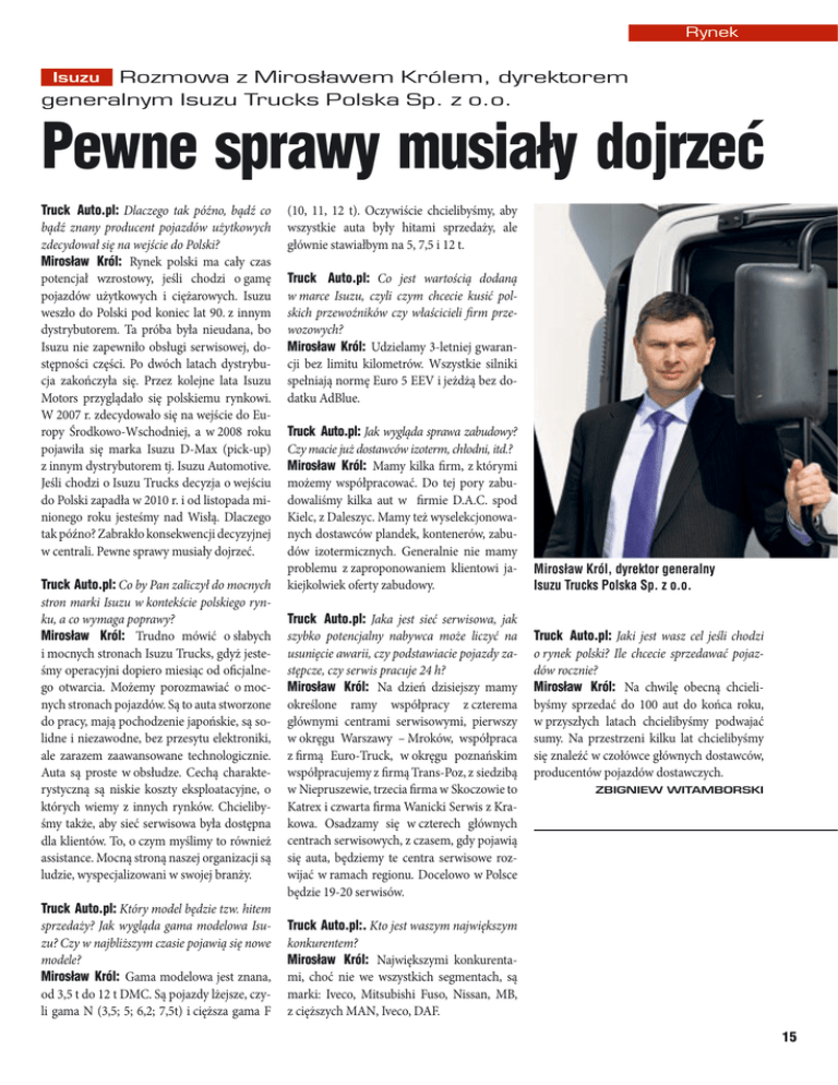 Rynek Isuzu Rozmowa z Mirosławem Królem, dyrektorem generalnym Isuzu Trucks Polska Sp. z o.o. Pewne sprawy musiały dojrzeć Truck Auto.pl: Dlaczego tak późno, bądź co bądź znany producent pojazdów użytkowych zdecydował się na wejście do Polski? Mirosław Król: Rynek polski ma cały czas potencjał wzrostowy, jeśli chodzi o gamę pojazdów użytkowych i ciężarowych. Isuzu weszło do Polski pod koniec lat 90. z innym dystrybutorem. Ta próba była nieudana, bo Isuzu nie zapewniło obsługi serwisowej, dostępności części. Po dwóch latach dystrybucja zakończyła się. Przez kolejne lata Isuzu Motors przyglądało się polskiemu rynkowi. W 2007 r. zdecydowało się na wejście do Europy Środkowo-Wschodniej, a w 2008 roku pojawiła się marka Isuzu D-Max (pick-up) z innym dystrybutorem tj. Isuzu Automotive. Jeśli chodzi o Isuzu Trucks decyzja o wejściu do Polski zapadła w 2010 r. i od listopada minionego roku jesteśmy nad Wisłą. Dlaczego tak późno? Zabrakło konsekwencji decyzyjnej w centrali. Pewne sprawy musiały dojrzeć. Truck Auto.pl: Co by Pan zaliczył do mocnych stron marki Isuzu w kontekście polskiego rynku, a co wymaga poprawy? Mirosław Król: Trudno mówić o słabych i mocnych stronach Isuzu Trucks, gdyż jesteśmy operacyjni dopiero miesiąc od oficjalnego otwarcia. Możemy porozmawiać o mocnych stronach pojazdów. Są to auta stworzone do pracy, mają pochodzenie japońskie, są solidne i niezawodne, bez przesytu elektroniki, ale zarazem zaawansowane technologicznie. Auta są proste w obsłudze. Cechą charakterystyczną są niskie koszty eksploatacyjne, o których wiemy z innych rynków. Chcielibyśmy także, aby sieć serwisowa była dostępna dla klientów. To, o czym myślimy to również assistance. Mocną stroną naszej organizacji są ludzie, wyspecjalizowani w swojej branży. Truck Auto.pl: Który model będzie tzw. hitem sprzedaży? Jak wygląda gama modelowa Isuzu? Czy w najbliższym czasie pojawią się nowe modele? Mirosław Król: Gama modelowa jest znana, od 3,5 t do 12 t DMC. Są pojazdy lżejsze, czyli gama N (3,5; 5; 6,2; 7,5t) i cięższa gama F (10, 11, 12 t). Oczywiście chcielibyśmy, aby wszystkie auta były hitami sprzedaży, ale głównie stawiałbym na 5, 7,5 i 12 t. Truck Auto.pl: Co jest wartością dodaną w marce Isuzu, czyli czym chcecie kusić polskich przewoźników czy właścicieli firm przewozowych? Mirosław Król: Udzielamy 3-letniej gwarancji bez limitu kilometrów. Wszystkie silniki spełniają normę Euro 5 EEV i jeżdżą bez dodatku AdBlue. Truck Auto.pl: Jak wygląda sprawa zabudowy? Czy macie już dostawców izoterm, chłodni, itd.? Mirosław Król: Mamy kilka firm, z którymi możemy współpracować. Do tej pory zabudowaliśmy kilka aut w firmie D.A.C. spod Kielc, z Daleszyc. Mamy też wyselekcjonowanych dostawców plandek, kontenerów, zabudów izotermicznych. Generalnie nie mamy problemu z zaproponowaniem klientowi jakiejkolwiek oferty zabudowy. Truck Auto.pl: Jaka jest sieć serwisowa, jak szybko potencjalny nabywca może liczyć na usunięcie awarii, czy podstawiacie pojazdy zastępcze, czy serwis pracuje 24 h? Mirosław Król: Na dzień dzisiejszy mamy określone ramy współpracy z czterema głównymi centrami serwisowymi, pierwszy w okręgu Warszawy – Mroków, współpraca z firmą Euro-Truck, w okręgu poznańskim współpracujemy z firmą Trans-Poz, z siedzibą w Niepruszewie, trzecia firma w Skoczowie to Katrex i czwarta firma Wanicki Serwis z Krakowa. Osadzamy się w czterech głównych centrach serwisowych, z czasem, gdy pojawią się auta, będziemy te centra serwisowe rozwijać w ramach regionu. Docelowo w Polsce będzie 19-20 serwisów. Mirosław Król, dyrektor generalny Isuzu Trucks Polska Sp. z o.o. Truck Auto.pl: Jaki jest wasz cel jeśli chodzi o rynek polski? Ile chcecie sprzedawać pojazdów rocznie? Mirosław Król: Na chwilę obecną chcielibyśmy sprzedać do 100 aut do końca roku, w przyszłych latach chcielibyśmy podwajać sumy. Na przestrzeni kilku lat chcielibyśmy się znaleźć w czołówce głównych dostawców, producentów pojazdów dostawczych. Zbigniew Witamborski Truck Auto.pl:. Kto jest waszym największym konkurentem? Mirosław Król: Największymi konkurentami, choć nie we wszystkich segmentach, są marki: Iveco, Mitsubishi Fuso, Nissan, MB, z cięższych MAN, Iveco, DAF. 15
