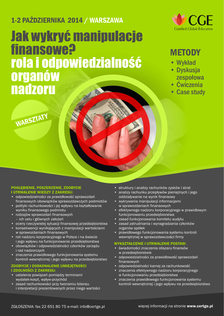 1-2 PAŹDZIERNIKA 2014 / WARSZAWA Jak wykryć manipulacje finansowe? rola i odpowiedzialność organów nadzoru METODY • Wykład • Dyskusja zespołowa • Ćwiczenia • Case study TAT Y Z S R WA POGŁĘBIENIE, POSZERZENIE, ZDOBYCIE I UTRWALENIE WIEDZY Z ZAKRESU: • odpowiedzialności za prawidłowość sprawozdań finansowych obowiązków sprawozdawczych podmiotów • polityki rachunkowości i jej wpływu na kształtowanie wyniku finansowego podmiotu • rodzajów sprawozdań finansowych – ich celu i głównych założeń • oceny rzeczywistej sytuacji finansowej przedsiębiorstwa • konsekwencji wynikających z manipulacji wartościami w sprawozdaniach finansowych • roli nadzoru korporacyjnego w Polsce i na świecie i jego wpływu na funkcjonowanie przedsiębiorstwa • obowiązków i odpowiedzialności członków zarządu i rad nadzorczych • znaczenia prawidłowego funkcjonowania systemu kontroli wewnętrznej i jego wpływu na przedsiębiorstwo ZDOBYCIE I DOSKONALENIE UMIEJĘTNOŚCI I ZDOLNOŚCI Z ZAKRESU: • ustalenia powiązań pomiędzy terminami wydatek-koszt, wpływ-przychód • zasad rachunkowości przy tworzeniu bilansu i interpretacji prezentowanych przez niego wartości ZGŁOSZENIA: fax 22 651 80 75 e-mail: [email protected] • struktury i analizy rachunków zysków i strat • analizy rachunku przepływów pieniężnych i jego oddziaływanie na wynik finansowy • wykrywania manipulacji informacjami w sprawozdaniach finansowych • efektywnego nadzoru korporacyjnego w prawidłowym funkcjonowaniu przedsiębiorstwa • zasad funkcjonowania komitetu audytu • zasad zatrudniania i wynagradzania członków organów spółek • prawidłowego funkcjonowania systemu kontroli wewnętrznej w sprawozdawczości firmy WYKSZTAŁCENIE I UTRWALENIE POSTAW: • świadomości znaczenia obszaru finansów w przedsiębiorstwie • odpowiedzialności za prawidłowość sprawozdań finansowych • odpowiedzialności karnej za rachunkowość • znaczenia efektywnego nadzoru korporacyjnego w funkcjonowaniu przedsiębiorstwa • znaczenia prawidłowego funkcjonowania systemu kontroli wewnętrznej i jego wpływu na przedsiębiorstwo więcej informacji na stronie www.certge.pl Jak wykryć manipulacje finansowe? – rola i odpowiedzialność organów nadzoru Szanowni Państwo, serdecznie zapraszamy do uczestnictwa w warsztatach pt. ”Jak wykryć manipulacje finansowe? – rola i odpowiedzialność organów nadzoru”, które odbędą się 1-2 października 2014r. w Warszawie. Zajęcia poprowadzi wykładowca Akademii Leona Koźmińskiego: dr. Aneta Hryckiewicz. Podczas dwóch dni warsztatów poznają Państwo m.in.: Kto i jak odpowiada za rachunkowość i sprawozdawczość firmy, jak wykryć próby manipulacji pozycji wartości bilansowych, co powinno budzić podejrzenie w rachunku zysków i strat, czy łatwo jest manipulować rachunkiem przepływów pieniężnych, jak powinien działać efektywny system nadzoru korporacyjnego, system kontroli wewnętrznej jako instrument wspomagający nadzór korporacyjny, odpowiedzialność członków zarządu i rad nadzorczych za rachunkowość w spółkach kapitałowych. Podczas dwóch dni warsztatów prowadzone będą dyskusje, ćwiczenia oraz prezentowane casestudy. Na zakończenie zajęć każdy z uczestników otrzyma certyfikat ukończenia warsztatów. Serdecznie zapraszamy do uczestnictwa w warsztatach. Z poważaniem, Anna Milewska Kierownik projektu SZKOLENIE ZAMKNIĘTE W przypadku zainteresowania tym szkoleniem większej liczby osób z Państwa organizacjiz przyjemnością przygotujemy je dla Państwa w wersji szkolenia zamkniętego. Prosimy o kontakt z kierownikiem projektu Anną Milewską [email protected] Certified Global Education Sp. z o.o. jest firmą szkoleniową od kilku lat obecną na polskim rynku kładącą nacisk na edukację biznesową popartą certyfikatami. Dąży do tego by być platformą szkoleniową udostępniającą klientom najwyższej jakości certyfikowane szkolenia ze wszystkich dziedzin zarówno w rozumieniu funkcjonalnym biorąc pod uwagę funkcje / działy w organizacji jak i branżowym uwzględniając specyfikę poszczególnych sektorów gospodarczych. Naszym celem nadrzędnym jest spełnianie potrzeb biznesowych naszych klientów poprzez realizację szkoleń o najwyższych standardach jakości bazujących na międzynarodowym know-how w zakresie edukacji biznesowej. Wszystkie budowane przez nas programy przygotowywane są w oparciu o szczegółowe badania rynku i analizowane są pod kątem ich praktycznej przydatności w biznesie. Trenerzy i prelegenci, których zapraszamy wywodzą się przede wszystkim ze środowisk biznesowych, nie brakuje wśród nich również prawników, autorytetów naukowych jak i przedstawicieli administracji publicznej. PROWADZĄCA: Dr Aneta Hryckiewicz Doktor nauk ekonomicznych, ekspert w dziedzinie finansów przedsiębiorstw i bankowości. Doktorat zdobyła na Uniwersytecie Goethe we Frankfurcie nad Menem. Stypendystka Uniwersytetu Whartona w Stanach Zjednoczonych. Pracownik naukowy i wykładowca Uniwersytetu Goethe we Frankfurcie nad Menem oraz Akademii Leona Koźmińskiego. Dyrektor Instytutu Rozwoju Biznesu w obszarze finansów i rachunkowości oraz ładu korporacyjnego. Wykładowca na Programie Executive MBA, Duke-Goethe Business School oraz Euro*MBA. Stypendystka Uniwersytetu Whartona w Pennylvanii, a od 2010 roku stowarzyszona w Financial Institutions Center w Wharton School na UniwersytciePennsylvania. Autorka licznych publikacji z funkcjonowania rynków finansowych, reform finansowych i corporategovernance w krajach rozwijających się. Przez pewien okres związana z bankowością inwestycyjną, gdzie doradzała przy wycenach przedsiębiorstw w transakcjach fuzji i przejęć w jednym z największych banków inwestycyjnych. Serdecznie zapraszamy! ZGŁOSZENIA: fax 22 651 80 75 e-mail: [email protected] więcej informacji na stronie www.certge.pl Jak wykryć manipulacje finansowe