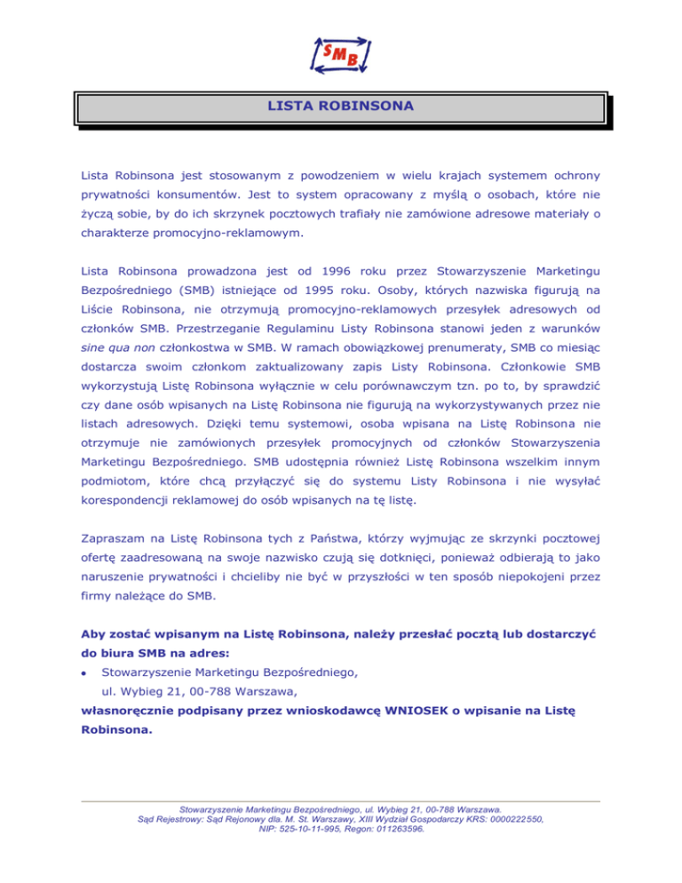 LISTA ROBINSONA Lista Robinsona jest stosowanym z powodzeniem w wielu krajach systemem ochrony prywatności konsumentów. Jest to system opracowany z myślą o osobach, które nie życzą sobie, by do ich skrzynek pocztowych trafiały nie zamówione adresowe materiały o charakterze promocyjno-reklamowym. Lista Robinsona prowadzona jest od 1996 roku przez Stowarzyszenie Marketingu Bezpośredniego (SMB) istniejące od 1995 roku. Osoby, których nazwiska figurują na Liście Robinsona, nie otrzymują promocyjno-reklamowych przesyłek adresowych od członków SMB. Przestrzeganie Regulaminu Listy Robinsona stanowi jeden z warunków sine qua non członkostwa w SMB. W ramach obowiązkowej prenumeraty, SMB co miesiąc dostarcza swoim członkom zaktualizowany zapis Listy Robinsona. Członkowie SMB wykorzystują Listę Robinsona wyłącznie w celu porównawczym tzn. po to, by sprawdzić czy dane osób wpisanych na Listę Robinsona nie figurują na wykorzystywanych przez nie listach adresowych. Dzięki temu systemowi, osoba wpisana na Listę Robinsona nie otrzymuje nie zamówionych przesyłek promocyjnych od członków Stowarzyszenia Marketingu Bezpośredniego. SMB udostępnia również Listę Robinsona wszelkim innym podmiotom, które chcą przyłączyć się do systemu Listy Robinsona i nie wysyłać korespondencji reklamowej do osób wpisanych na tę listę. Zapraszam na Listę Robinsona tych z Państwa, którzy wyjmując ze skrzynki pocztowej ofertę zaadresowaną na swoje nazwisko czują się dotknięci, ponieważ odbierają to jako naruszenie prywatności i chcieliby nie być w przyszłości w ten sposób niepokojeni przez firmy należące do SMB. Aby zostać wpisanym na Listę Robinsona, należy przesłać pocztą lub dostarczyć do biura SMB na adres: Stowarzyszenie Marketingu Bezpośredniego, ul. Wybieg 21, 00-788 Warszawa, własnoręcznie podpisany przez wnioskodawcę WNIOSEK o wpisanie na Listę Robinsona. Stowarzyszenie Marketingu Bezpośredniego, ul. Wybieg 21, 00-788 Warszawa. Sąd Rejestrowy: Sąd Rejonowy dla. M. St. Warszawy, XIII Wydział Gospodarczy KRS: 0000222550, NIP: 525-10-11-995, Regon: 011263596.