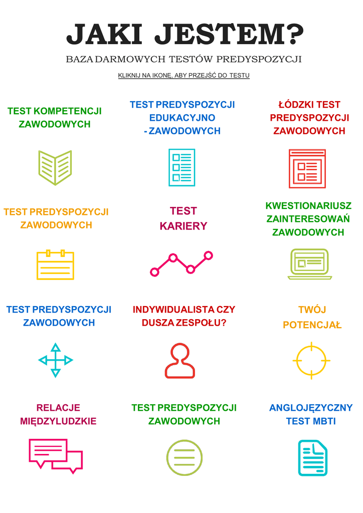 JAKI JESTEM? BAZA DARMOWYCH TESTÓW PREDYSPOZYCJI KLIKNIJ NA IKONĘ, ABY PRZEJŚĆ DO TESTU TEST KOMPETENCJI ZAWODOWYCH TEST PREDYSPOZYCJI EDUKACYJNO - ZAWODOWYCH ŁÓDZKI TEST PREDYSPOZYCJI ZAWODOWYCH TEST PREDYSPOZYCJI ZAWODOWYCH TEST KARIERY KWESTIONARIUSZ ZAINTERESOWAŃ ZAWODOWYCH TEST PREDYSPOZYCJI ZAWODOWYCH INDYWIDUALISTA CZY DUSZA ZESPOŁU? POTENCJAŁ RELACJE MIĘDZYLUDZKIE TEST PREDYSPOZYCJI ZAWODOWYCH ANGLOJĘZYCZNY TEST MBTI TWÓJ KWESTIONARIUSZ POSTAW TWÓRCZYCH vs ODTWÓRCZYCH TEST PREDYSPOZYCJI ZAWODOWYCH ZWIĄZANYCH ZE ŚRODOWISKIEM PRACY QUO-VADIS - TEST ZAINTERESOWAŃ, KOMPETENCJI I UZDOLNIEŃ PRZEDSIĘBIORCZYCH KWESTIONARIUSZ NASTAWIEŃ INTRAI INTERPERSONALNYCH ORAZ NASTAWIEŃ WOBEC ŚWIATA NARZĘDZIA DIAGNOSTYCZNE DLA UCZNIÓW KL. I - III GIMNAZJUM ZAMEK – TEST PREDYSPOZYCJI ZAWODOWYCH