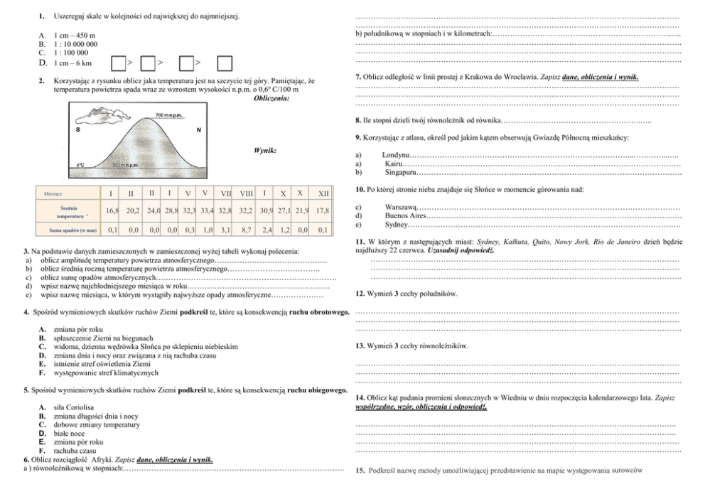 1. Uszereguj skale w kolejności od największej do najmniejszej. A. B. C. 1 cm – 450 m 1 : 10 000 000 1 : 100 000 1 cm – 6 km D. 2. > > ………………………………………………………………………………………………………………… ………………………………………………………………………………………………………………… b) południkową w stopniach i w kilometrach:……………………………………………………………........ …………………………………………………………………………………………………………………. …………………………………………………………………………………………………………………. …………………………………………………………………………………………………………………. > 7. Oblicz odległość w linii prostej z Krakowa do Wrocławia. Zapisz dane, obliczenia i wynik. ………………………………………………………………………………………………………………… ………………………………………………………………………………………………………………… ………………………………………………………………………………………………………………… Korzystając z rysunku oblicz jaka temperatura jest na szczycie tej góry. Pamiętając, że temperatura powietrza spada wraz ze wzrostem wysokości n.p.m. o 0,6º C/100 m Obliczenia: 8. Ile stopni dzieli twój równoleżnik od równika………………………………………………..….. 9. Korzystając z atlasu, określ pod jakim kątem obserwują Gwiazdę Północną mieszkańcy: Wynik: Miesiące I Średnia temperatura o CCpowietrza (w Suma opadów °C) (w mm) II 16,8 20,2 0,1 0,0 II I V V VII I V I 24,0 28,8 32,3 33,4 32,8 0,0 0,0 0,3 1,0 3,1 VIII 32,2 8,7 a) a) b) I X X XII X I 30,9 27,1 21,9 17,8 2,4 1,2 0,0 0,1 3. Na podstawie danych zamieszczonych w zamieszczonej wyżej tabeli wykonaj polecenia: a) oblicz amplitudę temperatury powietrza atmosferycznego……………………………………… b) oblicz średnią roczną temperaturę powietrza atmosferycznego………………………………. c) oblicz sumę opadów atmosferycznych……………………………………………………………… d) wpisz nazwę najchłodniejszego miesiąca w roku………………………………………………… e) wpisz nazwę miesiąca, w którym wystąpiły najwyższe opady atmosferyczne………………… Londynu……………………………………………………………………………...…………..….. Kairu………………………………………………………………………………………………… Singapuru……………………………………………………………………………………………. 10. Po której stronie nieba znajduje się Słońce w momencie górowania nad: c) d) e) Warszawą…………………………………………………………………………………………… Buenos Aires………………………………………………………………………………………… Sydney……………………………………….……………………………………………………… 11. W którym z następujących miast: Sydney, Kalkuta, Quito, Nowy Jork, Rio de Janeiro dzień będzie najdłuższy 22 czerwca. Uzasadnij odpowiedź. …………………………………………………………………………………………………………… …………………………………………………………………………………………………………… ……………………………………………………………………………………………………………. 12. Wymień 3 cechy południków. 4. Spośród wymieniowych skutków ruchów Ziemi podkreśl te, które są konsekwencją ruchu obrotowego. ………………………………………………………………………………………………………………… ………………………………………………………………………………………………………………… …………………………………………………………………………………………………………………. A. zmiana pór roku B. spłaszczenie Ziemi na biegunach 13. Wymień 3 cechy równoleżników. C. widoma, dzienna wędrówka Słońca po sklepieniu niebieskim D. zmiana dnia i nocy oraz związana z nią rachuba czasu ………………………………………………………………………………………………………………… E. istnienie stref oświetlenia Ziemi ………………………………………………………………………………………………………………… F. występowanie stref klimatycznych …………………………………………………………………………………………………………………. 5. Spośród wymieniowych skutków ruchów Ziemi podkreśl te, które są konsekwencją ruchu obiegowego. 14. Oblicz kąt padania promieni słonecznych w Wiedniu w dniu rozpoczęcia kalendarzowego lata. Zapisz współrzędne, wzór, obliczenia i odpowiedź. A. siła Coriolisa B. zmiana długości dnia i nocy ……………………………………………………………………………………………………………….. C. dobowe zmiany temperatury ……………………………………………………………………………………………………………….. D. białe noce ………………………………………………………………………………………………………………… E. zmiana pór roku ……………………………………………………