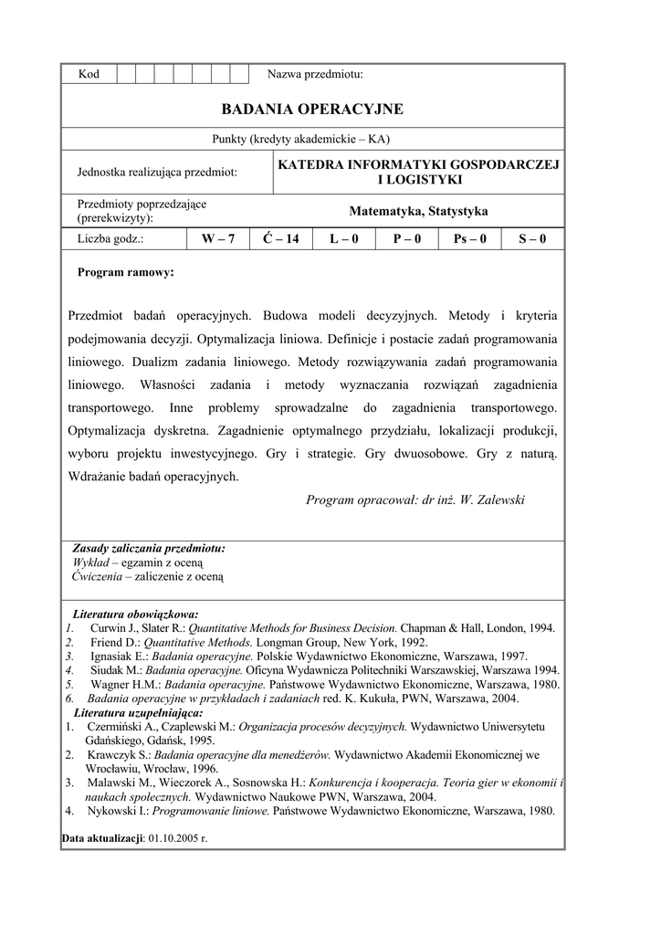 Kod Nazwa przedmiotu: BADANIA OPERACYJNE Punkty (kredyty akademickie – KA) KATEDRA INFORMATYKI GOSPODARCZEJ I LOGISTYKI Jednostka realizująca przedmiot: Przedmioty poprzedzające (prerekwizyty): Matematyka, Statystyka W–7 Liczba godz.: Ć – 14 L–0 P–0 Ps – 0 S–0 Program ramowy: Przedmiot badań operacyjnych. Budowa modeli decyzyjnych. Metody i kryteria podejmowania decyzji. Optymalizacja liniowa. Definicje i postacie zadań programowania liniowego. Dualizm zadania liniowego. Metody rozwiązywania zadań programowania liniowego. Własności transportowego. Inne zadania problemy i metody wyznaczania sprowadzalne do rozwiązań zagadnienia zagadnienia transportowego. Optymalizacja dyskretna. Zagadnienie optymalnego przydziału, lokalizacji produkcji, wyboru projektu inwestycyjnego. Gry i strategie. Gry dwuosobowe. Gry z naturą. Wdrażanie badań operacyjnych. Program opracował: dr inż. W. Zalewski Zasady zaliczania przedmiotu: Wykład – egzamin z oceną Ćwiczenia – zaliczenie z oceną Literatura obowiązkowa: 1. Curwin J., Slater R.: Quantitative Methods for Business Decision. Chapman & Hall, London, 1994. 2. Friend D.: Quantitative Methods. Longman Group, New York, 1992. 3. Ignasiak E.: Badania operacyjne. Polskie Wydawnictwo Ekonomiczne, Warszawa, 1997. 4. Siudak M.: Badania operacyjne. Oficyna Wydawnicza Politechniki Warszawskiej, Warszawa 1994. 5. Wagner H.M.: Badania operacyjne. Państwowe Wydawnictwo Ekonomiczne, Warszawa, 1980. 6. Badania operacyjne w przykładach i zadaniach red. K. Kukuła, PWN, Warszawa, 2004. Literatura uzupełniająca: 1. Czermiński A., Czaplewski M.: Organizacja procesów decyzyjnych. Wydawnictwo Uniwersytetu Gdańskiego, Gdańsk, 1995. 2. Krawczyk S.: Badania operacyjne dla menedżerów. Wydawnictwo Akademii Ekonomicznej we Wrocławiu, Wrocław, 1996. 3. Malawski M., Wieczorek A., Sosnowska H.: Konkurencja i kooperacja. Teoria gier w ekonomii i naukach społecznych. Wydawnictwo Naukowe PWN, Warszawa, 2004. 4. Nykowski I.: Programowanie liniowe. Państwowe Wydawnictwo Ekonomiczne, Warszawa, 1980. Data aktualizacji: 01.10.2005 r.