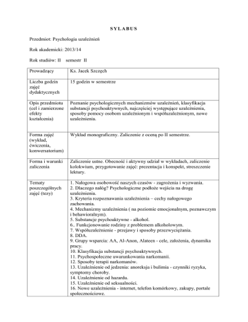 SYLABUS Przedmiot: Psychologia uzależnień Rok akademicki: 2013/14 Rok studiów: II semestr II Prowadzący Ks. Jacek Szczęch Liczba godzin zajęć dydaktycznych 15 godzin w semestrze Opis przedmiotu (cel i zamierzone efekty kształcenia) Poznanie psychologicznych mechanizmów uzależnień, klasyfikacja substancji psychoaktywnych, najczęściej występujące uzależnienia, sposoby pomocy osobom uzależnionym i współuzależnionym, nowe uzależnienia. Forma zajęć (wykład, ćwiczenia, konwersatorium) Wykład monograficzny. Zaliczenie z oceną po II semestrze. Forma i warunki zaliczenia Zaliczenie ustne. Obecność i aktywny udział w wykładach, zaliczenie kolokwium, przygotowanie zajęć: prezentacja i konspekt, streszczenie lektury. Tematy poszczególnych zajęć (tezy) 1. Nałogowa osobowość naszych czasów - zagrożenia i wyzwania. 2. Dlaczego nałóg? Psychologiczne podłoże wejścia na drogę uzależnienia. 3. Kryteria rozpoznawania uzależnienia – cechy nałogowego zachowania. 4. Mechanizmy uzależnienia ( na poziomie emocjonalnym, poznawczym i behawioralnym). 5. Substancje psychoaktywne - alkohol. 6.. Funkcjonowanie rodziny z problemem alkoholowym. 7. Współuzależnienie - przejawy i sposoby przezwyciężania. 8. DDA. 9. Grupy wsparcia: AA, Al-Anon, Alateen - cele, założenia, dynamika pracy. 10. Klasyfikacja substancji psychoaktywnych. 11. Psychospołeczne uwarunkowania narkomanii. 12. Sposoby terapii narkomanów. 13. Uzależnienie od jedzenia: anoreksja i bulimia - czynniki ryzyka, symptomy choroby. 14. Uzależnienie od hazardu. 15. Uzależnienie od seksualności. 16. Nowe uzależnienia - internet, telefon komórkowy, zakupy, portale społecznościowe. 17. Rola duchowości w terapii uzależnień. 18. Rola i zadania osoby duchownej w procesie pomocy uzależnionym. Literatura podstawowa Mellibruda J., Sobolewska - Mellibruda Z. (2006): Integracyjna psychoterapia uzależnień. Warszawa, IPZ. Niewiadomska I., Sikorska - Głodowicz M. (2004): Alkohol. Lublin, Gaudium. Niewiadomska I., Stanisławczyk P. (2004): Narkotyki. Lublin, Gaudium. Lektura uzupełniająca Beattie M. (2003): Koniec współuzależnienia. Poznań, Media Rodzina. Carnes P. (2001): Od nałogu do miłości. Poznań, Media Rodzina. Dziewiecki M. (2001): Nowoczesna profilaktyka uzależnień. Kielce, Jedność. Dziewiecki M. (red.) (2000): Nowe przesłanie nadziei. Podręcznik duszpasterstwa trzeźwości. Warszawa, PARPA Niewiadomska I., Kulik A., Hajduk. (2005): Jedzenie. Lublin, Gaudium. Niewiadomska I., Chwaszcz, J., Kołodziej B., Ślipa B. (2005): Seks. Lublin, Gaudium.