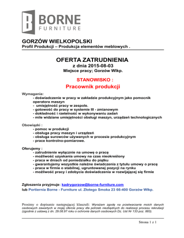 GORZÓW WIELKOPOLSKI Profil Produkcji – Produkcja elementów meblowych . OFERTA ZATRUDNIENIA z dnia 2015-08-03 Miejsce pracy; Gorzów Wlkp. STANOWISKO : Pracownik produkcji Wymagania: - doświadczenie w pracy w zakładzie produkcyjnym jako pomocnik operatora maszyn - umiejętność pracy w zespole. - gotowość do pracy w systemie III - zmianowym - dokładność i rzetelność w wykonywaniu zadań - mile widziane umiejętności obsługi maszyn, urządzeń technologicznych Obowiązki : - pomoc w produkcji - obsługa pracy maszyn i urządzeń - obsługa surowców używanych w procesie produkcyjnym - prace kontrolno-pomiarowe. Oferujemy : - zatrudnienie wyłącznie na umowę o pracę - możliwość uzyskania umowy na czas nieokreślony - praca w dniach od poniedziałku do piątku - gwarantujemy wszystkie należne świadczenia z tytułu umowy o pracę - praca w firmie o stabilnej, ugruntowanej pozycji na rynku - możliwość pracy i zdobycia doświadczenia w rozwijającej się firmie Zgłoszenia przyjmuje: [email protected] lub Portiernia Borne - Furniture ul. Złotego Smoka 23 66-400 Gorzów Wlkp. Prosimy o dopisanie następującej klauzuli: Wyrażam zgodę na przetwarzanie moich danych osobowych zawartych w mojej ofercie pracy dla potrzeb niezbędnych do realizacji procesu rekrutacji (zgodnie z ustawą z dn. 29.08.97 roku o ochronie danych osobowych Dz. Ust Nr 133 poz. 883). Strona 1 z 1