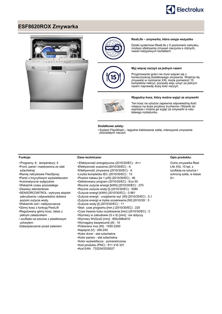 ESF8620ROX Zmywarka RealLife – zmywarka, która umyje wszystko Dzieki systemowi RealLife z 5 poziomami natrysku, możesz efektywnie zmywać naczynia o różnych, nawet nietypowych kształtach. Myj więcej naczyń za jednym razem Przyjmowanie gości nie musi wiązać się z koniecznością dodatkowego zmywania. Wnętrze tej zmywarki w rozmiarze XXL może pomieścić 15 kompletów nakryć, pozwala więc umyć za jednym razem naprawdę dużą ilość naczyń. Wygodny kosz, który można wyjąć ze zmywarki Ten kosz na sztućce zapewnia odpowiednią ilość miejsca na duże przybory kuchenne i filiżanki do espresso i można go wyjąć ze zmywarki w celu łatwego rozładunku. Dodatkowe zalety: • System FlexiWash – łagodne traktowanie szkła, intensywne zmywanie pozostałych naczyń Funkcje: Dane techniczne: Opis produktu: • Programy: 6 , temperatury: 5 •Front, panel i maskownica ze stali szlachetnej •Ramię natryskowe FlexiSpray •Panel z trzycyfowym wyświetlaczem •Automatyczne wyłączanie •Wskaźnik czasu pozostałego •Zawiasy standardowe •SENSORCONTROL: wykrywa stopień zabrudzenia i odpowiednio dobiera poziom zużycia wody. •Wskaźniki soli i nabłyszczacza •Górny kosz z funkcją FlexiLift •Regulowany górny kosz, także z pełnym załadunkiem • szuflada na sztućce z plastikowym uchwytem •Zabezpieczenie przed zalaniem • Efektywność energetyczna (2010/30/EC) : A++ •Efektywność suszenia (2010/30/EC) : A •Efektywność zmywania (2010/30/EC) : A •Liczba kompletów IEC (2010/30/EC) : 15 •Poziom hałasu [re 1 pW] (2010/30/EC) : 46 •Deklarowany program (2010/30/EC) : Eco 50 •Roczne zużycie energii [kWh] (2010/30/EC) : 270 •Roczne zużycie wody [l] (2010/30/EC) : 3080 •Zużycie energii [kWh] (2010/30/EC) : 0.961 •Zużycie energii - urządzenie wył. [W] (2010/30/EC) : 0,1 •Zużycie energii w trybie oczekiwania [W] (2010/30/ : 5 •Zużycie wody [l] (2010/30/EC) : 11 •Stan. czas programu [min.] (2010/30/EC) : 225 •Czas trwania trybu oczekiwania [min] (2010/30/EC) : 5 •Wymiary w zabudowie (G x S) [mm] : nie dotyczy •Wymiary WxSzxG [mm] : 850x596x610 •Wymagany bezpiecznik [A] : 10 •Pobierana moc [W] : 1550-2200 •Napięcie [V] : 200-240 •Kolor drzwi : stal szlachetna •Kolor panelu : stal szlachetna •Kolor wyświetlacza : pomarańczowy •Kod produktu (PNC) : 911 416 331 •Kod EAN : 7332543335527 Cicha zmywarka Real Life XXL 15 kpl. z szufladą na sztućce i ochroną szkła, w klasie A+.
