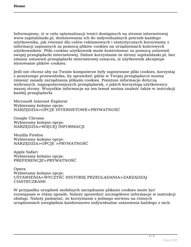 Home Informujemy, iż w celu optymalizacji treści dostępnych na stronie internetowej www.szpitalslaski.pl, dostosowania ich do indywidualnych potrzeb każdego użytkownika, jak również dla celów reklamowych i statystycznych korzystamy z informacji zapisanych za pomocą plików cookies na urządzeniach końcowych użytkowników. Pliki cookies użytkownik może kontrolować za pomocą ustawień swojej przeglądarki internetowej. Dalsze korzystanie ze strony szpitalslaski.pl, bez zmiany ustawień przeglądarki internetowej oznacza, iż użytkownik akceptuje stosowanie plików cookies. Jeśli nie chcesz aby na Twoim komputerze były zapisywane pliki cookies, korzystaj z poniższego przewodnika, by sprawdzić gdzie w Twojej przeglądarce można zmienić zasady zarządzania plikami cookies. Poniższe informacje dotyczą wybranych, najpopularniejszych przeglądarek, z jakich korzystają użytkownicy naszej strony. Wszystkie informacje na ten temat można znaleźć także w instrukcji każdej przeglądarki. Microsoft Internet Explorer Wybieramy kolejno opcje: NARZĘDZIA>OPCJE INTERNETOWE>PRYWATNOŚĆ Google Chrome Wybieramy kolejno opcje: NARZĘDZIA>WIĘCEJ INFORMACJI Mozilla Firefox Wybieramy kolejno opcje: NARZĘDZIA>OPCJE >PRYWATNOŚĆ Apple Safari Wybieramy kolejno opcje: PREFERENCJE>PRYWATNOŚĆ Opera Wybieramy kolejno opcje: USTAWIENIA>WYCZYŚĆ HISTORIĘ PRZEGLĄDANIA>ZARZĄDZAJ CIASTECZKAMI W przypadku urządzeń mobilnych zarządzanie plikami cookies może być rozwiązane w różny sposób. Należy sprawdzić szczegółowe informacje w instrukcji obsługi. Należy pamiętać, że korzystanie z jednego serwisu na różnych urządzeniach uwzględnia każdorazowo indywidualne ustawienia każdego z nich. 1/1 Phoca PDF Powered by TCPDF (www.tcpdf.org)