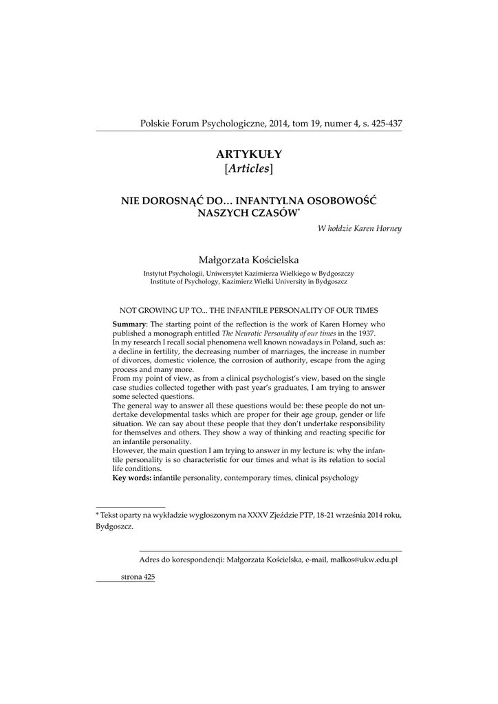 Polskie Forum Psychologiczne, 2014, tom 19, numer 4, s. 425-437 R [Articles] ȱ&)ȱdzȱȱg)ȱ NASZYCH CZASÓW* ȱÙ£ȱȱ ¢ Ù£ȱï Instytut Psychologii, Uniwersytet Kazimierza Wielkiego w Bydgoszczy Institute of Psychology, Kazimierz Wielki University in Bydgoszcz NOT GROWING UP TO... THE INFANTILE PERSONALITY OF OUR TIMES ¢: ȱȱȱȱȱĚȱȱȱ ȱȱȱ ¢ȱ ȱ published a monograph entitled ȱȱ¢ȱȱȱ in the 1937. In my research I recall social phenomena well known nowadays in Poland, such as: a decline in fertility, the decreasing number of marriages, the increase in number of divorces, domestic violence, the corrosion of authority, escape from the aging process and many more. From my point of view, as from a clinical psychologist’s view, based on the single case studies collected together with past year’s graduates, I am trying to answer some selected questions. The general way to answer all these questions would be: these people do not undertake developmental tasks which are proper for their age group, gender or life situation. We can say about these people that they don’t undertake responsibility ȱȱȱǯȱ¢ȱ ȱȱ ¢ȱȱȱȱȱęȱȱ an infantile personality. However, the main question I am trying to answer in my lecture is: why the infantile personality is so characteristic for our times and what is its relation to social life conditions. ¢ȱ DZȱinfantile personality, contemporary times, clinical psychology Șȱȱ¢ȱȱ ¢Ù£ȱ ¢Ù£¢ȱȱȱĊ£ȱǰȱŗŞȬŘŗȱ £ïȱŘŖŗŚȱǰȱ Bydgoszcz. ȱȱDZȱÙ£ȱïǰȱȬǰȱȓ ǯǯ s £ ¢Ùȱȱï ¿¢ȱ ȱȱȱàČ¢ȱ£ÚȱČ¢ ¢ǰȱ £ȱà¢ȱȮȱ£ȱȱ ǰȱÙǰȱ ¢£ÙǰȱȱÙ£ȱȮȱ ï¢ǰȱ¢ȱ £ÙȱȱȱïȱǻŘŖŗŗǼǰȱàȱȱ°ǰȱ ¢£ȱ¿ȱ £¢ȱ £Ùïȱ ǯȱȱ ȱ £¢ȱ ¿ȱ ȱ ǯȱ ¢ȱ ȱ ¢ȱ£Úȱȱ ¢Ù¢ȱȱȱȱ£ǯȱ ȱ£¿ï°ȱ¢Ùȱ £ȱ£¢ ïȱȱ¿ȱ£Ùȱȱ ¢ȱȱ £¢ȱ£ȱȱÙȱ£ÙČ¢ȱȱ à£ïǯȱȱ ¢ȱǻŗŞŞśȬŗşśŘǼȱȱȱ£ȱ ȱǰȱàȱ££Ù¢ȱȱȱ¢ȱȱàȱČǰȱÙ£ȱȱ ȱ¿£¢à ǰȱ ȱ¢ȱȱ¿£¢ȱǰȱȱȱ£¢ǰȱ ȱĊàÙȱ inspiracji badawczych i klinicznych. ¢£ȱ ï°ȱ£¢ȱ£à ȱÙȱ £ȱ ¢ȱ ȱ ¢ȱȱ w 1937 roku, czyli 5 lat po emigracji K. Horney z nazistowskich Niemiec do Stanów £¢ǯȱ Ǯȱ £¢Ȅȱ ȱ ¢Ùȱ ¿ȱ ȱ ȱ £¢£ȱ ȱ ȱ ȱ ȱ¢£¢ȱ£ȱ ȱ¢ǯȱ ¢ȱ¢Ùȱ¢¢ǰȱ ¢ȱ£ȱČ¢ȱï £ȱ£¢ǯȱ ï°ǰȱàȱÙǰȱ ¢Ùȱ£ȱï £Úȱ ȱȱ£ȱ ȱȱ£ȱ¢ȱïǰȱČ¢¢ȱ ȱïȱ£ȱȱ ȱ ȱÙ£¢ǰȱÙ¢ȱàČ¢ȱ£ČÚȱ ȱȱ ïǯȱ ï°ȱǮȱ£à Ȅȱ¢ÙȱÙȱ¿ǰȱǰȱ£Ùïȱȱǯȱàȱȱ ȱ¿ȱȱ¿ȱȮȱ ȱȱ¿ȱȮȱ Ù¢DZȱ¢£ȱ£ȱÙïǰȱȱ£Ùȱ£ȱ££Ú ȱȱ£DzȱȱČȱÙ£Ú ǰȱÙï°ȱ ȱ ȱȮȱČȱȱ Ù£¢ǯȱ ££ȱ ȱ ȱ ¢£ Ùȱ ¿ï°ȱ ǯȱ ¢ȱ £ȱ£ïȱȱ¿ȱȱ£ȱ£ ȱ£¢ȱ¿ȱ ȱï ǰȱ ȱČȱ££ȱ£ Úȱ£ȱȱ ¢£ÚȱÙ£¢ǰȱ£ȱ£ ¿ȱȱ ȱČȱǻ ǰȱŗşŝŜǼǯȱ¢ÙȱȱČȱČȱ ȱǯ £¢ȱ¿ȱ£Ù¢ȱȱȱČǯȱ¿ÙȱȱŝśȱǯȱÙȱȱǰȱȱ ȱ Čȱ£¢ȱȱ¢ȱȱǻŘŖŖŖǼǰȱ £ï°ȱČȱȱ ǮĊàÙȱÚȄǯ ¿Ùǰȱ £ȱǯȱ ¢ǰȱČȱ£¢ȱïÙǰȱ£¢£°ȱ¿ȱ¢ dualnym stylom zachowania ludzi w „naszych czasach”. Jako psycholog kliniczny Ǯ££¢Ȅȱ ȱ ¢ ǰȱ ȱ ¿ȱ ¢ ¢¢ °ȱ ïàȱ £ ȱ Ù£¢ȱǰȱàȱ ȱ£Čȱȱ£ǰȱ£Ùȱ¿ȱȱ¢ȱ ȱ ȱ¢ ȱ £¢ȱ ǰȱȱà £ïȱȮȱ ȱ ȱà¢ȱÙ¢ȱ £°ȱÙȱ¢ǯȱČȱ ¢ȱȱ Č¢ȱà ǰȱ£ȱà¢ȱ àÙ£ïȱ¢ȱ¿ȱ£ȱǯ Trudne znamiona naszych czasów: Ȯȱ Čȱ£ïǯ Ȯȱ £ÙČȱȱ£ïȱČ¢ ȱÙ¢ȱÙ¢ǯ Ȯȱ ȱ£¢ȱÙČÚ ǯȱ£ȱ£ à ǯ Ȯȱ £ȱ£ȱàDZȱ£ȱȱÙ¢ȱÙ ¢ǯ Ȯȱ ¢ ï°ȱÙ£ȱ£££ȱ¢ȱȱÚȱǯ Ȯȱ ȱ¢¢¢ȱȱȱ ïǯ Ȯȱ ǯ £¢ ïȱȱ ¢¢ȱȱȱȱ£ȱ£ȱ¿ȱȱȱ£ïȱ ¢¢ȱȱ£ȱàČ¢ȱïǯȱ£ȱȱ¢Ù¢ȱǯȱ ȱ Ù ȱȱŘŖŗŘȬŘŖŗŚȱ££ Ùȱȱ ¢ȱ££ȱȱ ȱ ȱ £ȱ ¢ȱ ȱ £Ùȱ ȱ àÙ¢ȱ à ǯȱ ïàȱ¢ȱ¢ȱà ȱÙ£¢ǰȱ ¢ï¢ȱȱ£ȱ ££àÙ ȱ ȱ ££¿ï¢ȱ £ ȱ àǰȱ à¢ȱ ¢ȱ ȱ ¢ȱ £ïȱ¢£¢Ù¢ǯȱȱ£Ùȱȱà ȱ£ȱ££ȱ££Úȱ¢£¢ǰȱȱȱȱ£ ¢ȱ£ ¢Ù¢ȱ£ǰȱ࣢ȱ ȱ¢ȱàȱ£ȱȱȱȱ£ȱ£ȱ£ £¢ ȱà ǰȱČ¢ȱȱ ¢ȱ¿ǯȱ ȱÙ¢ȱ¢ ¢ȱȱ£¢ǯȱ¢Ù¢ȱ £ȱ¢ ǯȱÙÙ¢ȱ¿ȱȱȱ£ £ȱ£ ¢ǰȱ ¢ ¢ȱǻ ȱ¿ȱČ ïȱ££ȱ ȱ ï Ǽǰȱ ǰȱȱ ȱ£Čïȱȱ¢ ¢ȱ£ȱ £¢ȱ £ȱ ïǰȱȱDZȱĴǰȱǰȱǰȱ¢ǰȱ¢ȱ¢ǰȱ £¢ȱ à ȱ ¢ȱ Ȯȱ £¢ȱ £ȱ ȱ ¢ ȱ £¢ȱȮȱ ȱȱŗŘŖȱ£¢à ǯ Čȱ£ ȱ ¢ȱ£¢ȱ£¢ȱÚǯ ȱ°ȱȱ£¢Ú ȱǻ£ȱÚȱ¢ȱÙ¢ǰȱŘŖŗŚǼ ïàȱ £Úȱ ¢£¢ȱ £ïȱ ¢ȱ £ ȱ Ù£¢ȱ ȱ £ȱ£ȱà ȱ¢£¢ȱ£Ú£¢ȱȱ¿ǯȱȱ £ȱ ¢ȱ ȱ ȱ àȱ £ £ȱ ¿ȱ Ùȱ śŖƖȱ à ȱ ȱ ȱ ȱ Ċȱ £Č¢ȱ ȱ ¢¿ȱ ȱ ¢ȱ Č¢ȱ ǯȱȱ £¢ȱ ¢ȱȱÙ¢ȱ¿ȱ£ȱ¢ȱȱ£¢£ȱȱï ȱ £ȱ ȱ ȱ ȱ £ȱ £ȱ ȱ ŞŖƖ1ǯȱ ȱ £¿ïȱ £¢à ȱ ȱ ¿ȱȱ¿ȱ£ȱ £Úȱ¢£¢ȱȱȱ£ȱ£ȱȱ¢ȱ ¿ȱ ¢¢¢ǰȱ £ ¢ȱ ȱ £ȱ ȱ ¢ȱ ȱ ȱ ££Úǰȱ ££ȱ£ČÚȱ ¢à ȱï¢ȱ£¢ȱ£ȱȱȱ à ǯȱ£¿ï°ȱǰȱȱȱ££ǰȱà ȱȱȱ¿ȱ£ȱ £Úȱ¢£¢ȱȱČ¢£ȱȱǻÚǰȱ ǰȱŘŖŖşǼǯȱȱȱȱÙȱǰȱ ¢ȱȱČ¢£ȱ¢Ùȱ ȱ¢ ȱǯȱȱȱ£ȱȱ ȱ ¢¢£ȱ ȱ ¢£ǰȱ £ȱ ȱ £ȱ Č¢ȱ £ȱ¿ȱȱȱ£ïȱ¢£ǰȱȱČȱ£¢°ȱȱȱȱȱ£ Ùȱǯȱȱǯȱȱĵȱȱȱ£ȱȱ ȱ ǯȱ ǯȱ ¢¢ȱ ǰȱ £ȱ ¢Ùȱ ¢Ù£ȱ ȱ ¢ȱ £¢ ȱ ¢ȱ ȱ ȱ ŘŖŗŘǯȱ £¢ȱ Čȱ £DZȱ ĴDZȦȦ ǯ¢£ ǯȦ Uslugi-medyczne/Ginekolodzy-zaniepokojeni-lawinowo-rosnie-odsetek-ciec-cesarskichŖřşȬȬȬŖřşǰŗŘřŚśŗǰŞǯȱǽ¿DZȱŘŜǯŖśǯŘŖŗŚȱǾǯ 1 ÙČà ȱ£¿ȱȱȱàȱǻ£ ǰȱŘŖŗŘǼǯȱÙȱ¿ȱ ȱȱDZȱtoǰȱ££¢ȱ£ȱ¢ȱ¿ȱ£ȱȱ¢ȱǻÚǰȱŘŖŖşǼǯȱ ȱ£ȱ¿ȱȱ£ ȱ ïàȱȱ¢ǯȱČȱȱ¢°ȱ £Č¢ȱȱàȱ£ȱàȱ ¢Č£¢ȱ£ȱ¢£ǰȱȱ ȱ£¿ïȱ £¢à ȱȱ¿ȱȱȱ¢ę£¢ȱȱ¢£¢ȱ£ȱ £¢ȱàǰȱ niedostatecznej opieki w trakcie naturalnego porodu, ewentualnie niewiary w ȱČ ïȱ£ȱ£ȱ£ǯȱ¿ȱȱ¢ ȱ ȱ£¿ïȱ£¢à ȱȱ¢ǰȱČȱ ¢ Ùȱ ¢ȱ¢¢£ȱ¢DZȱ£ïǰȱ ¢